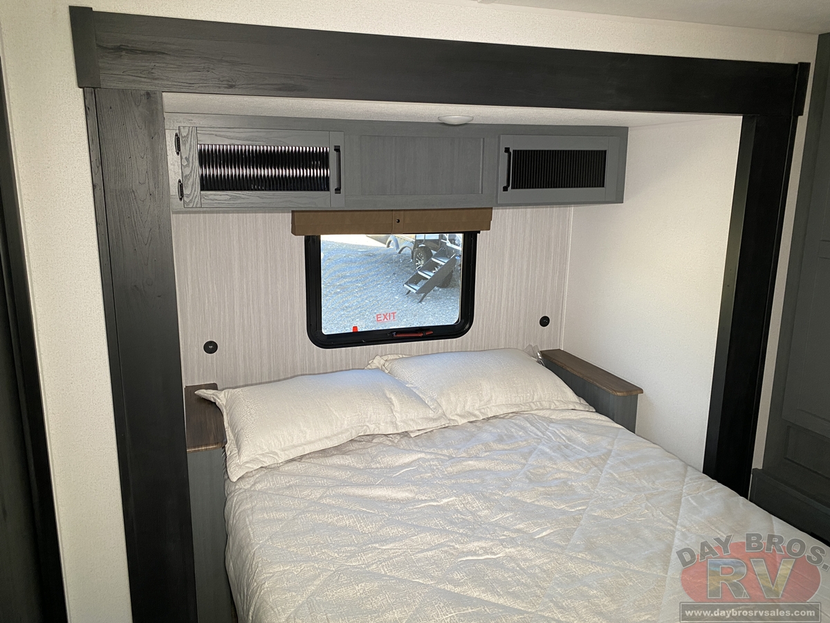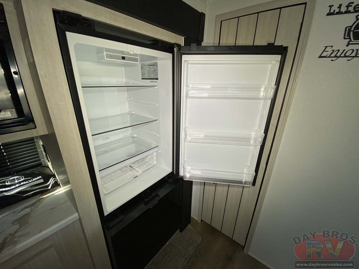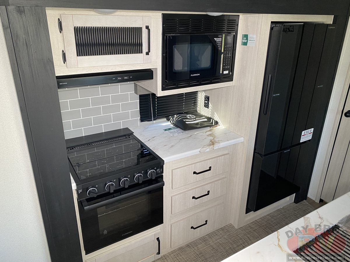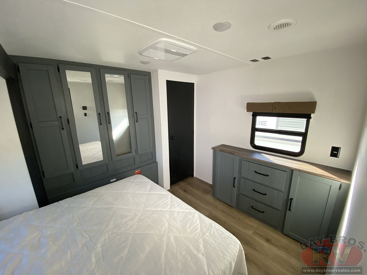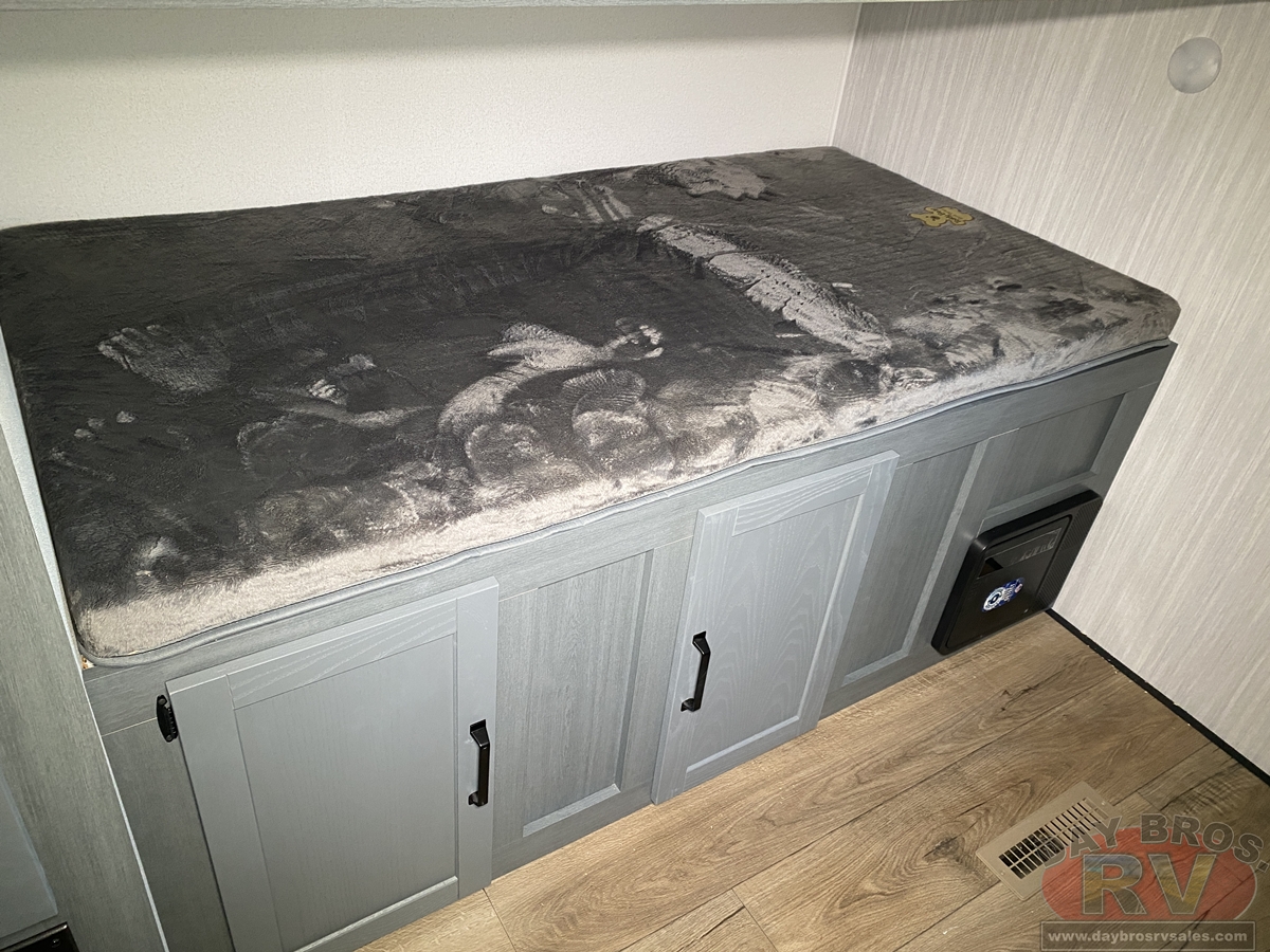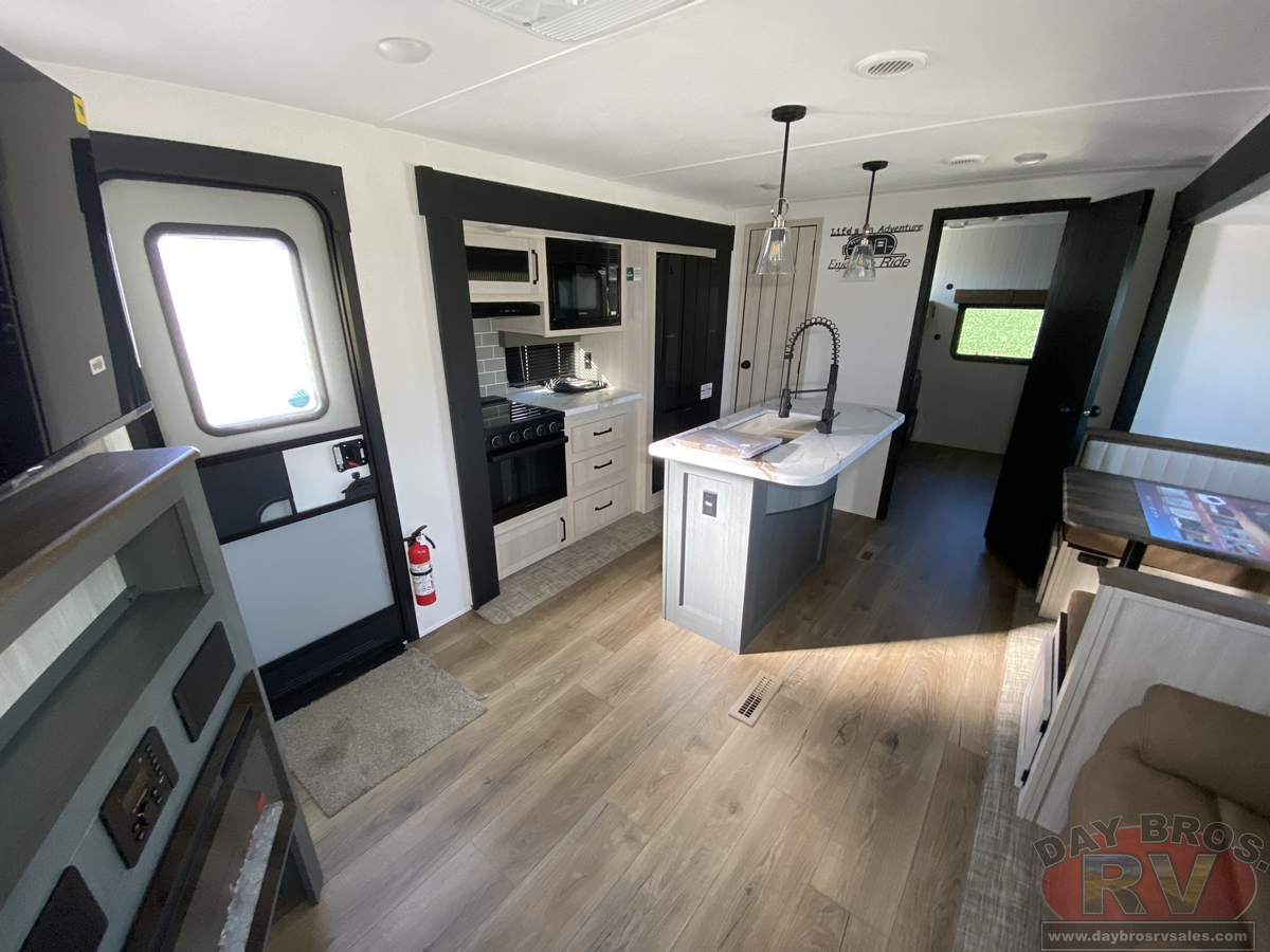 This bunk house travel trailer has four slide outs. Three on the same side and provide plenty of space for entertaining and all of your family/guests. The front bedroom with a slideout contains a queen bed, a very large closet, and washer/dryer prep. The whole layout of this camper contains no shortness of sleeping arrangements due to the bunk house in the rear as well. This bunk house will grant you three bunks a and a fold down sofa for everyone to enjoy their stay comfortably.