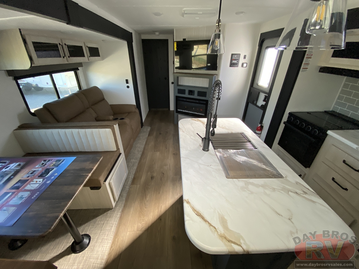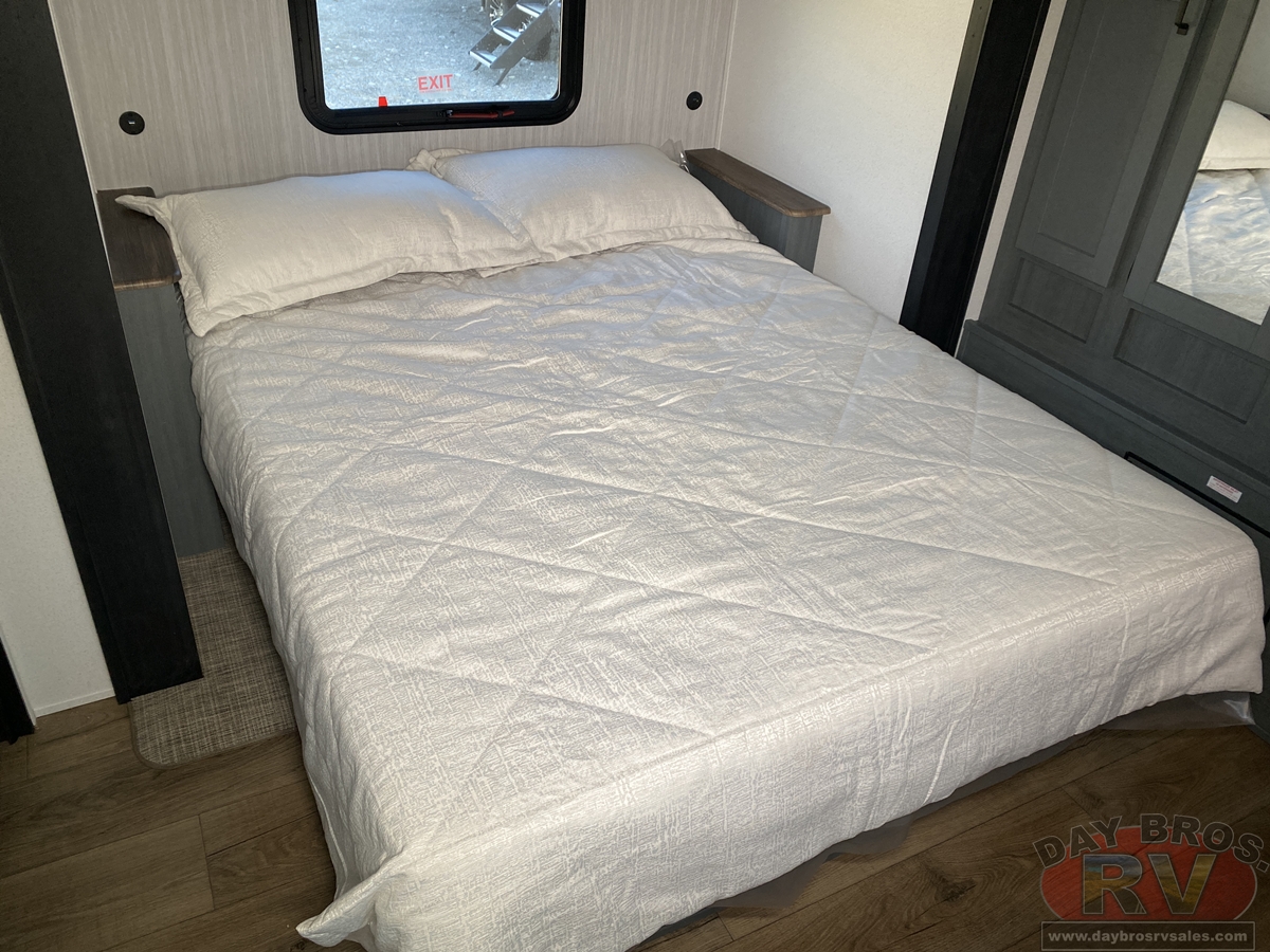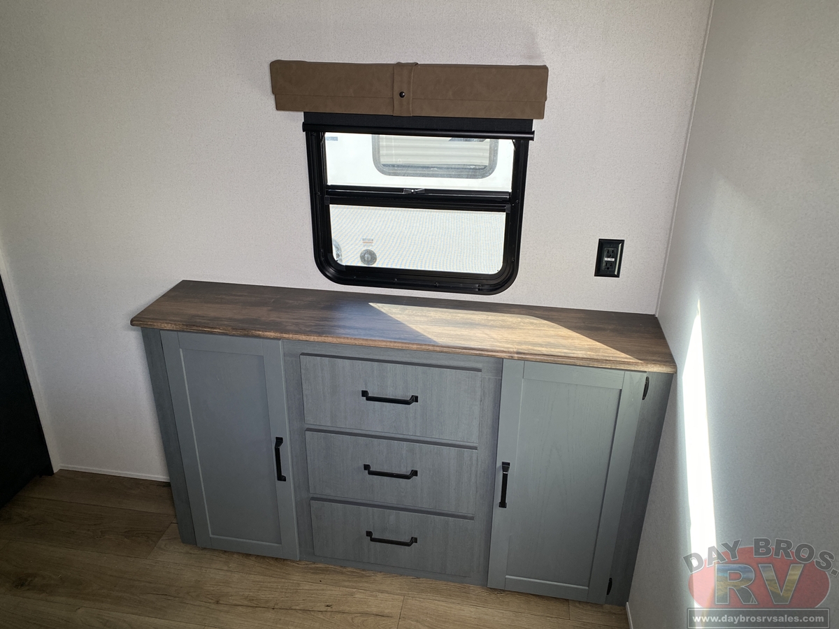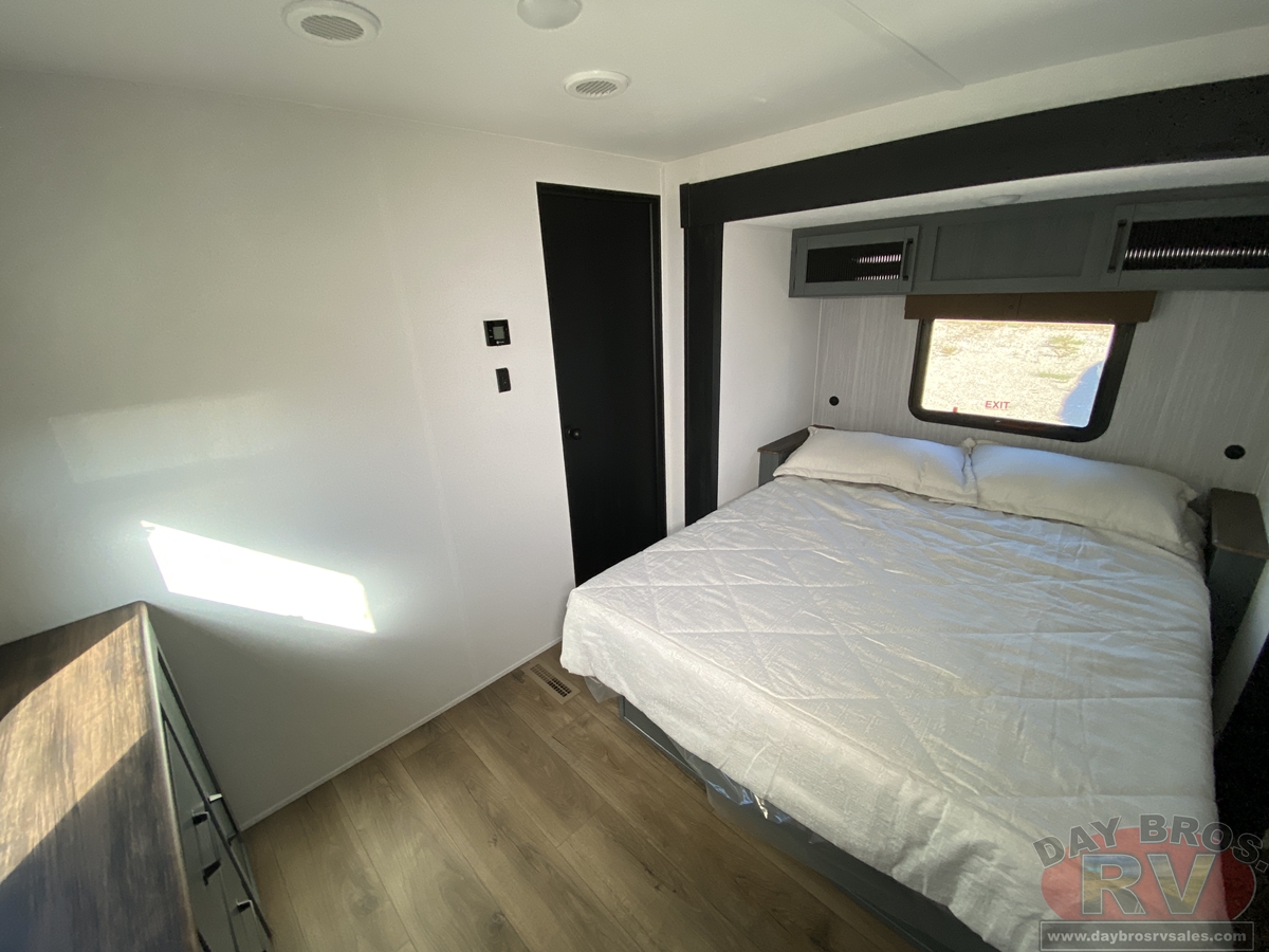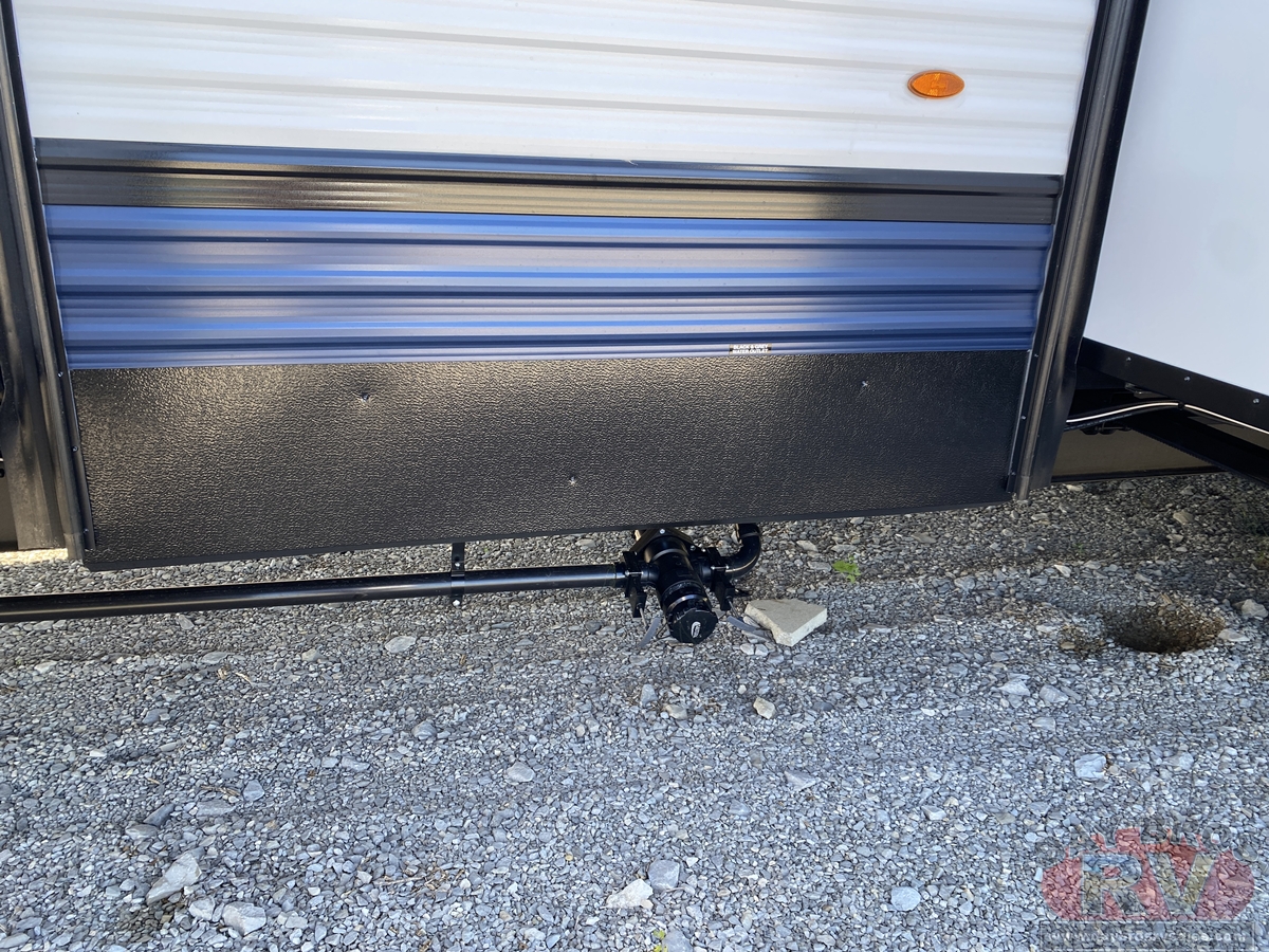 This bunk house travel trailer has four slide outs. Three on the same side and provide plenty of space for entertaining and all of your family/guests. The front bedroom with a slideout contains a queen bed, a very large closet, and washer/dryer prep. The whole layout of this camper contains no shortness of sleeping arrangements due to the bunk house in the rear as well. This bunk house will grant you three bunks a and a fold down sofa for everyone to enjoy their stay comfortably.