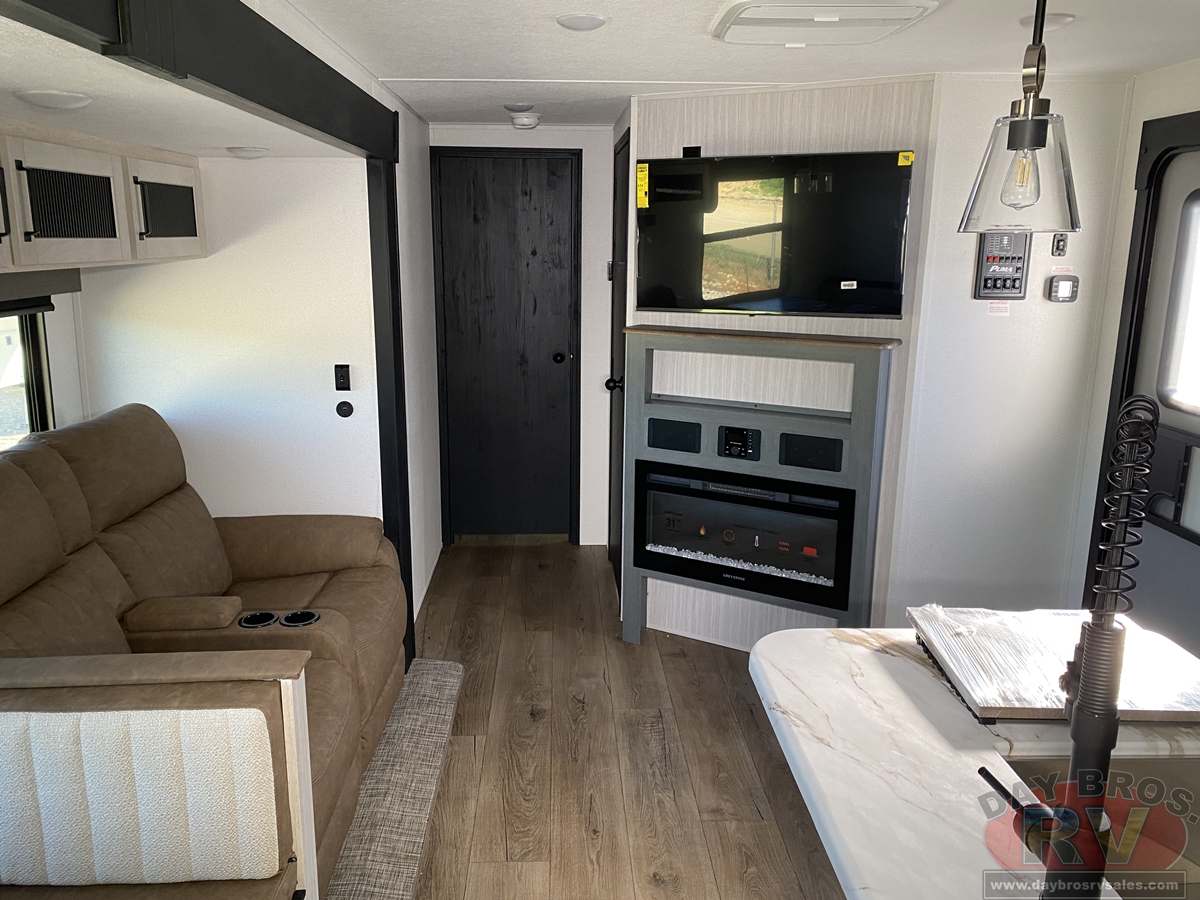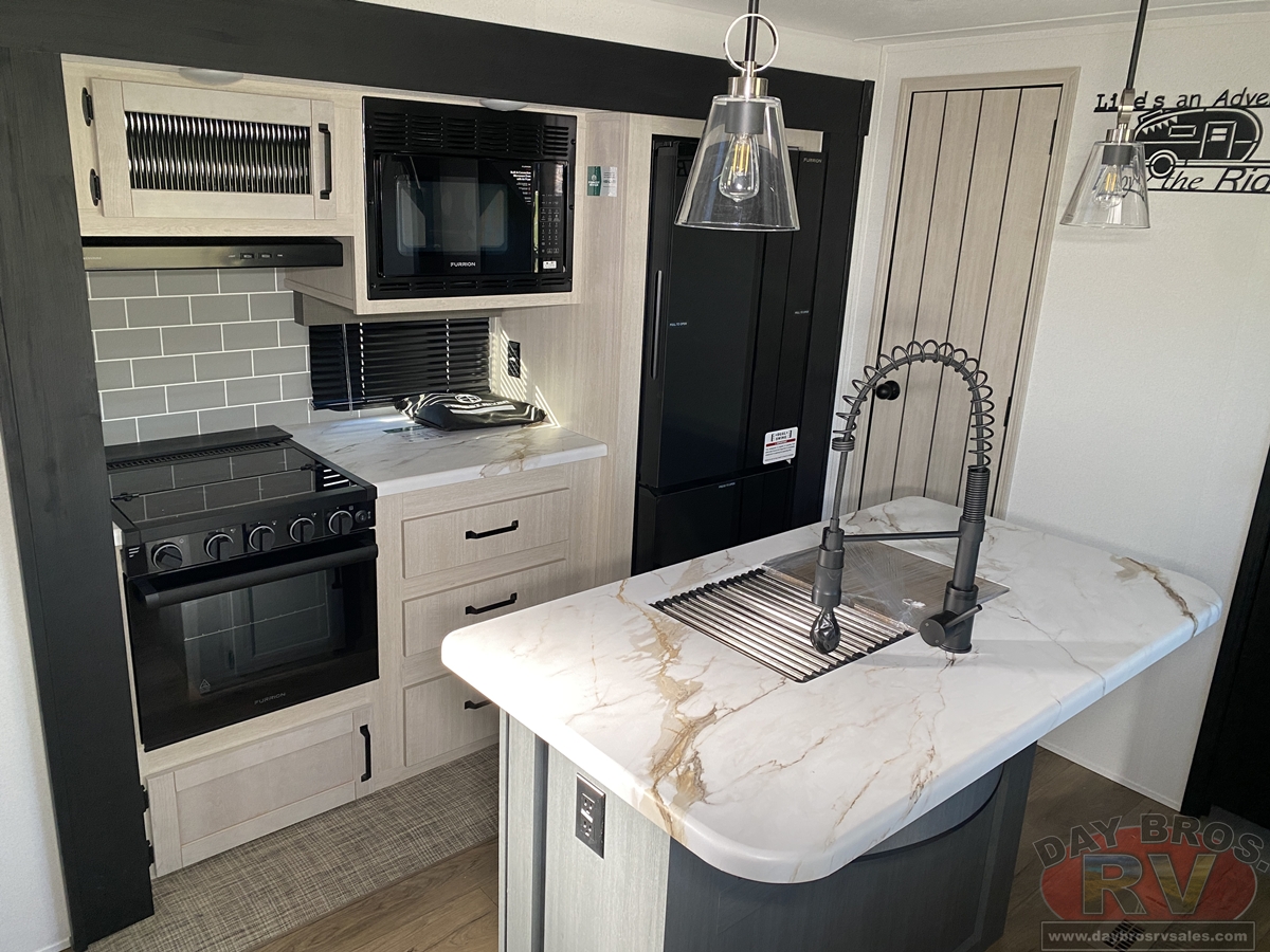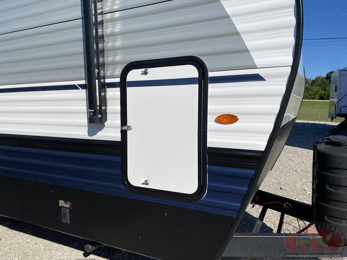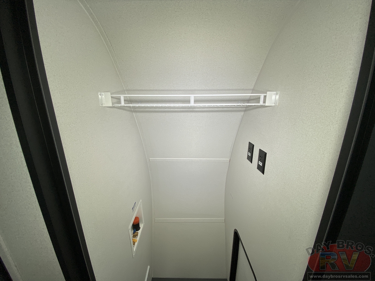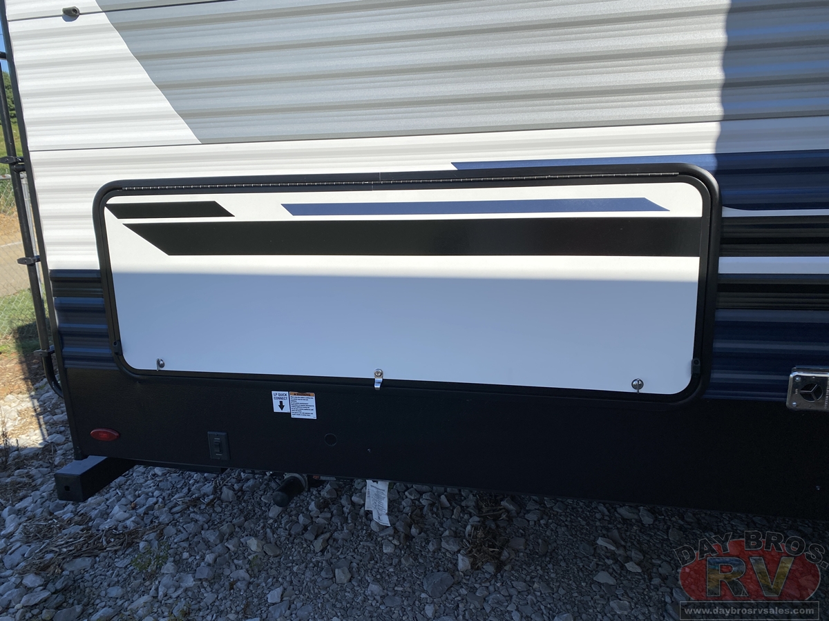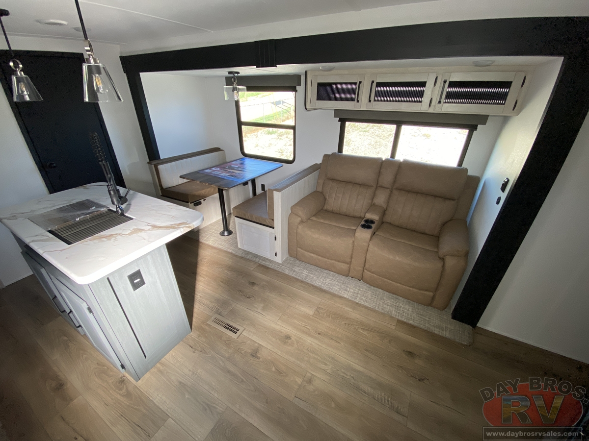 This bunk house travel trailer has four slide outs. Three on the same side and provide plenty of space for entertaining and all of your family/guests. The front bedroom with a slideout contains a queen bed, a very large closet, and washer/dryer prep. The whole layout of this camper contains no shortness of sleeping arrangements due to the bunk house in the rear as well. This bunk house will grant you three bunks a and a fold down sofa for everyone to enjoy their stay comfortably.
