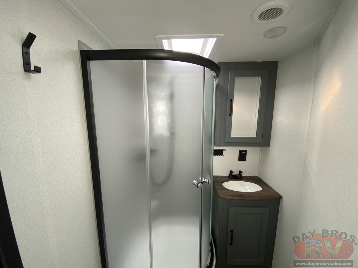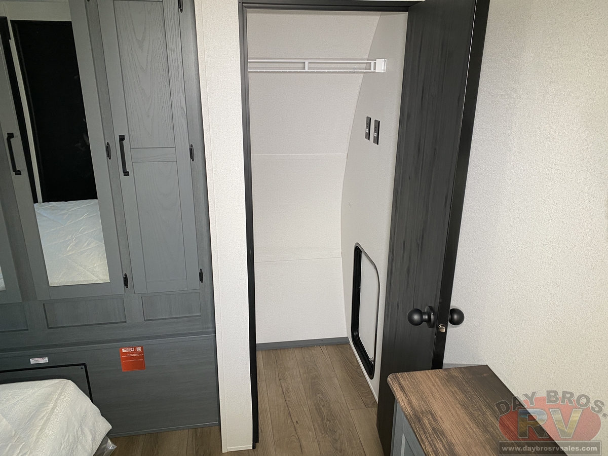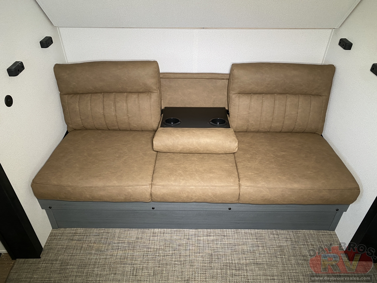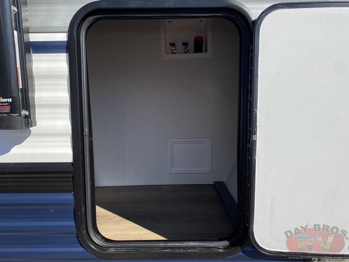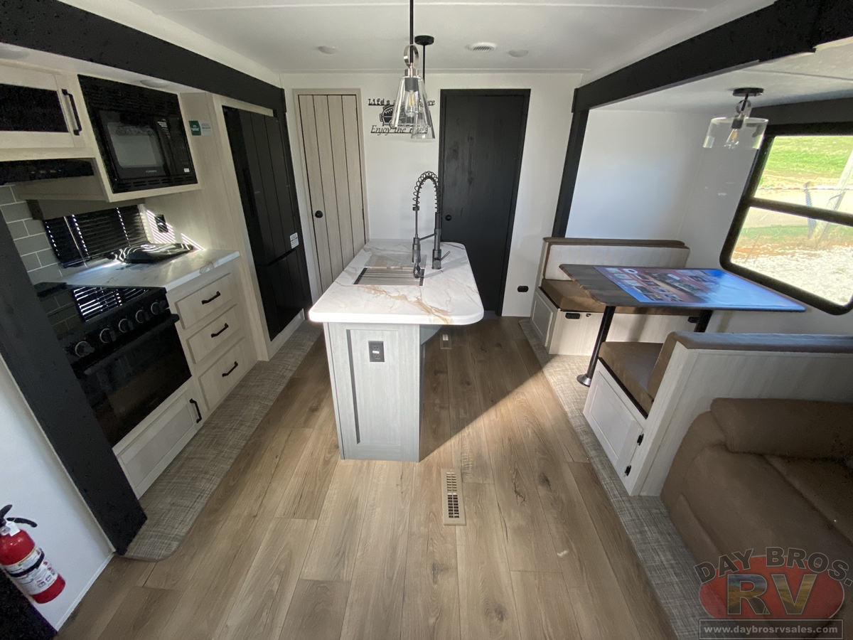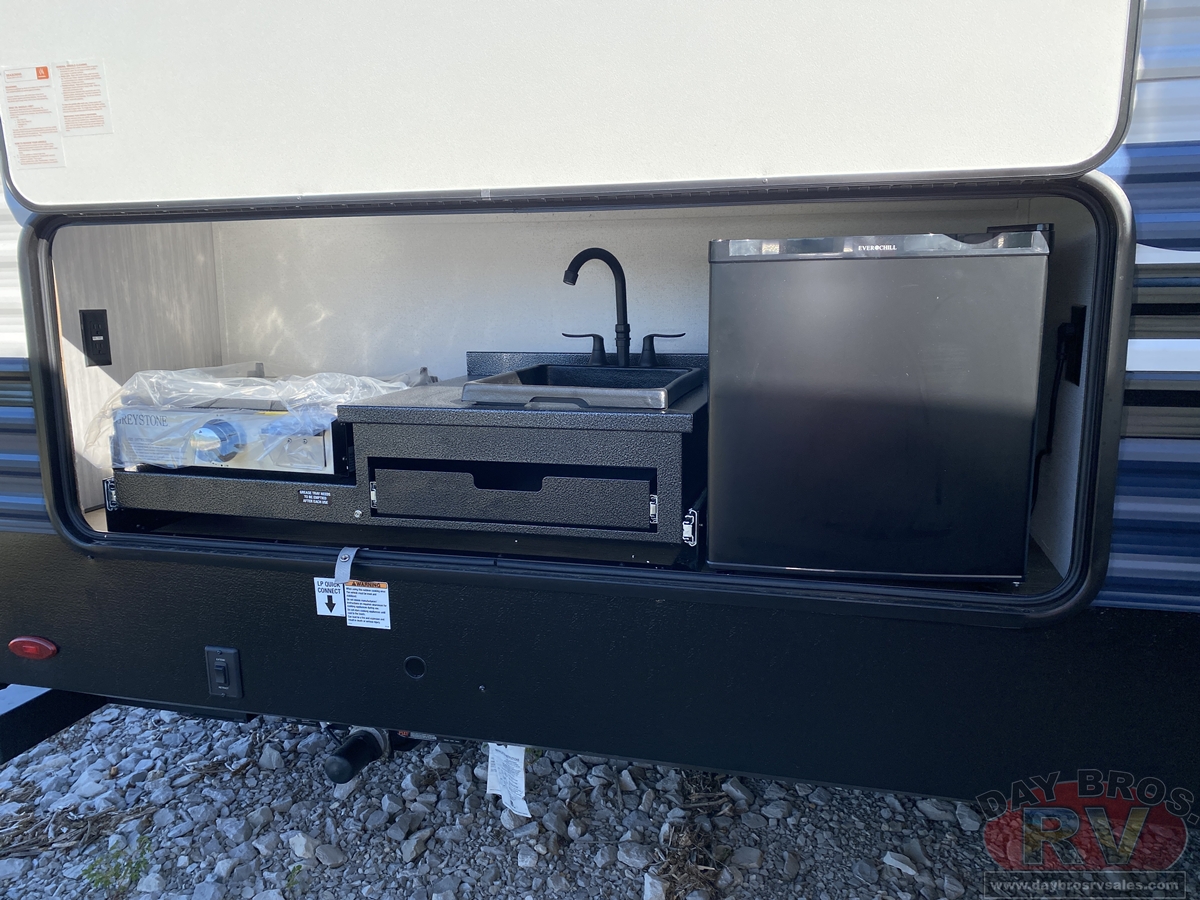 This bunk house travel trailer has four slide outs. Three on the same side and provide plenty of space for entertaining and all of your family/guests. The front bedroom with a slideout contains a queen bed, a very large closet, and washer/dryer prep. The whole layout of this camper contains no shortness of sleeping arrangements due to the bunk house in the rear as well. This bunk house will grant you three bunks a and a fold down sofa for everyone to enjoy their stay comfortably.