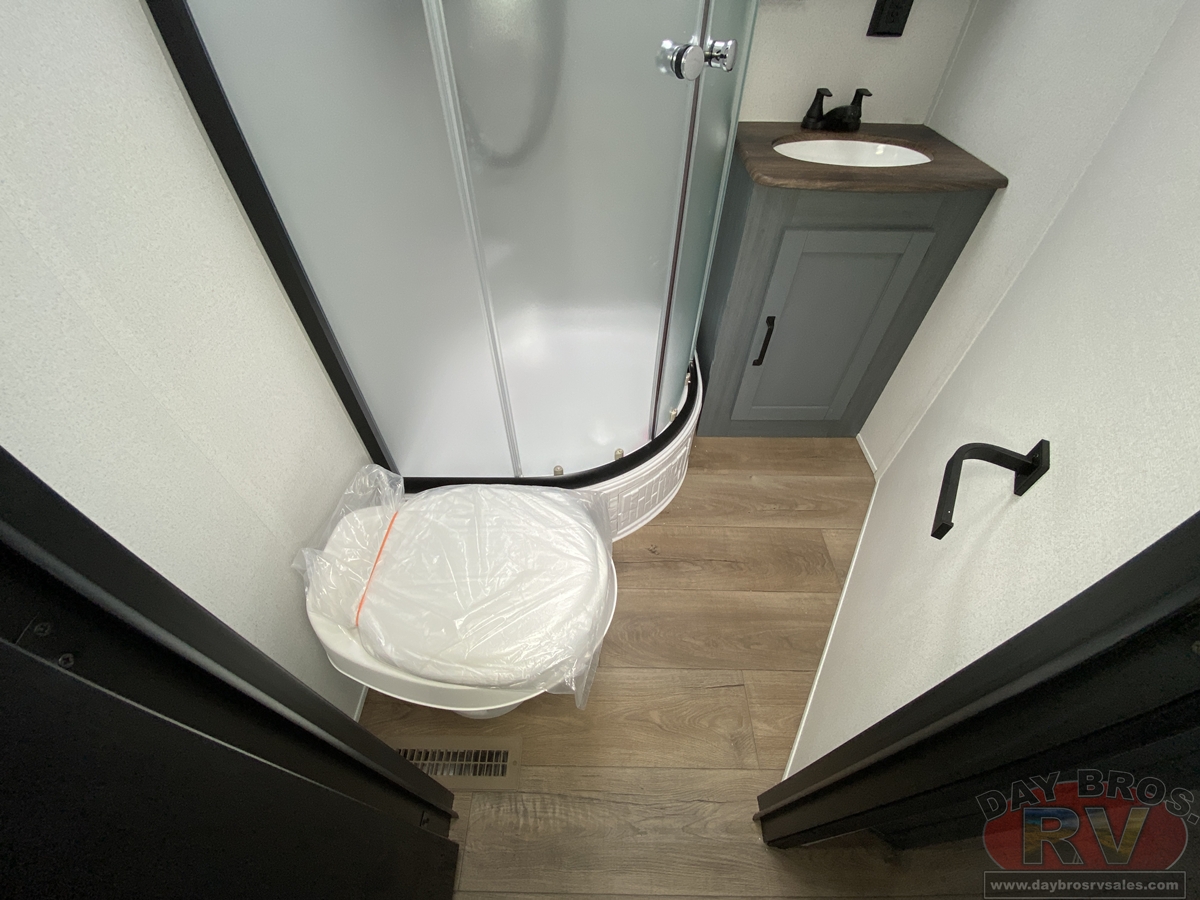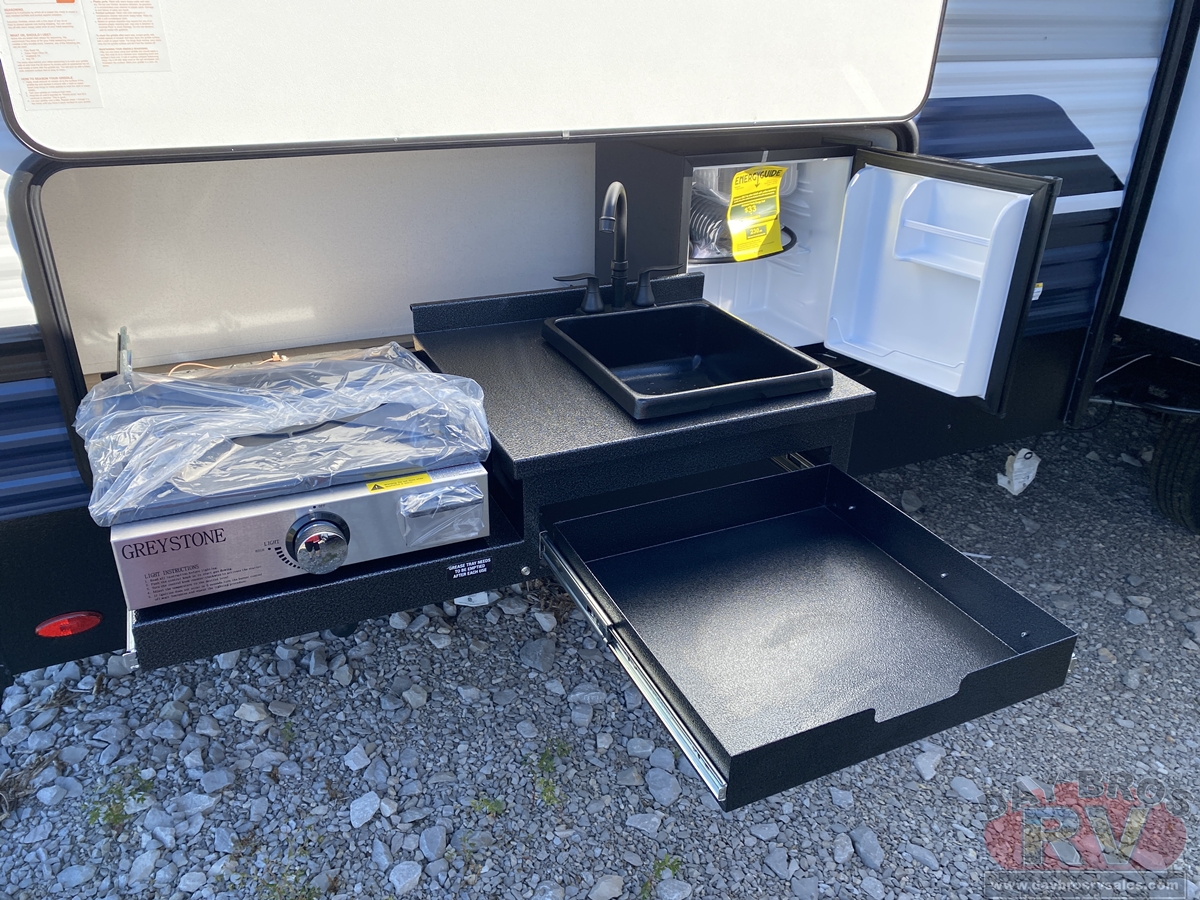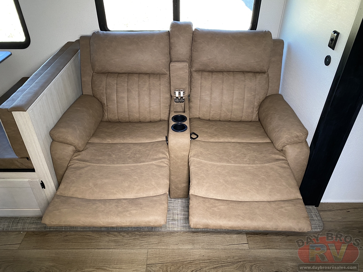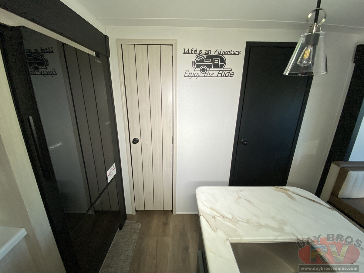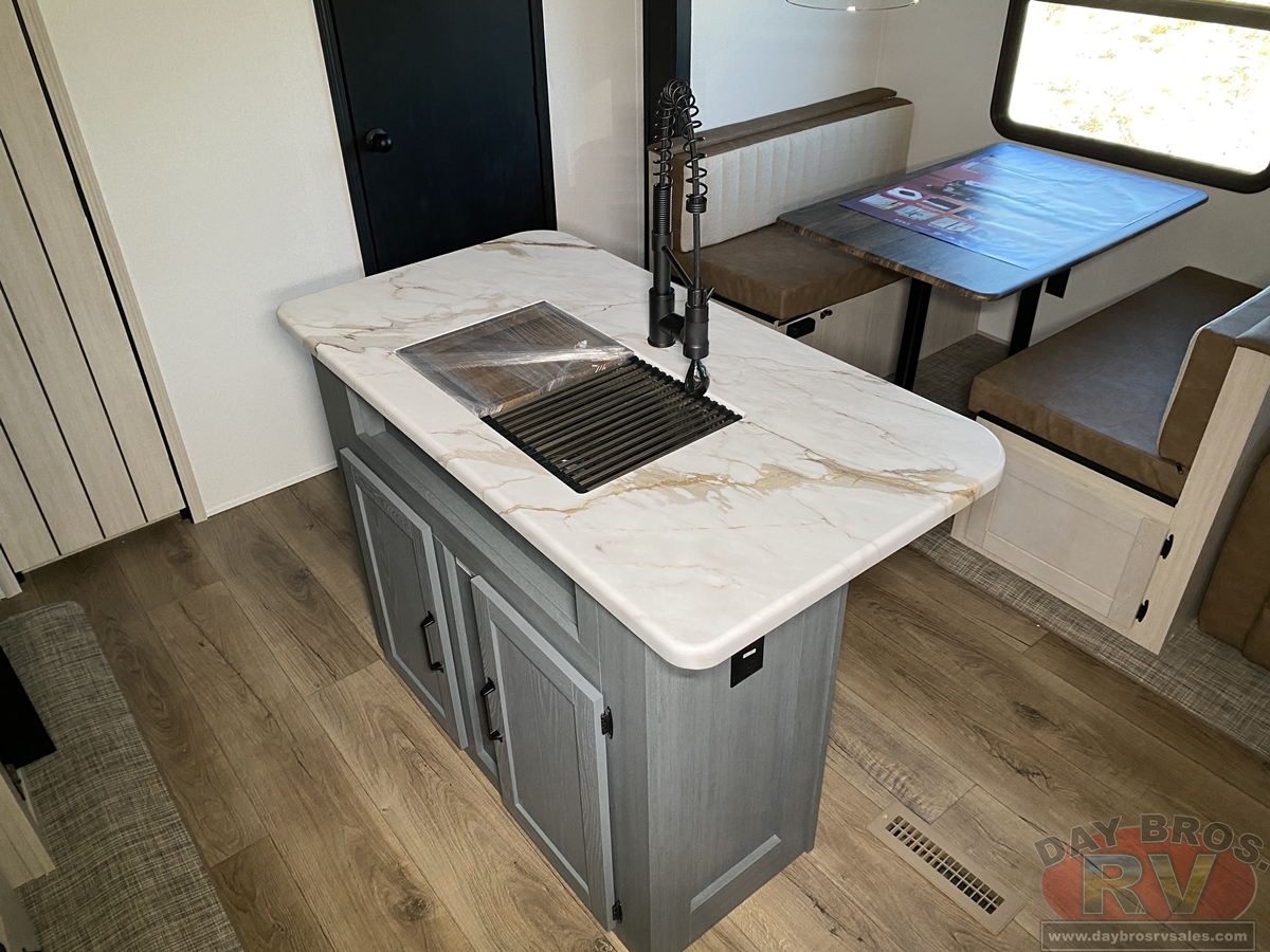 This bunk house travel trailer has four slide outs. Three on the same side and provide plenty of space for entertaining and all of your family/guests. The front bedroom with a slideout contains a queen bed, a very large closet, and washer/dryer prep. The whole layout of this camper contains no shortness of sleeping arrangements due to the bunk house in the rear as well. This bunk house will grant you three bunks a and a fold down sofa for everyone to enjoy their stay comfortably.