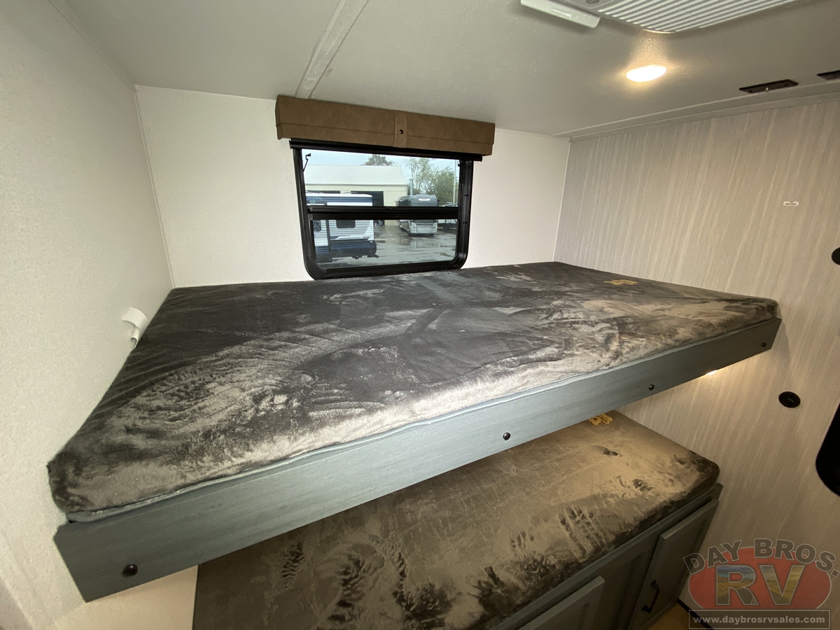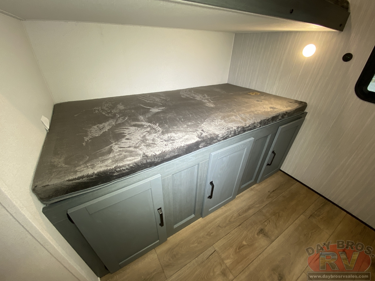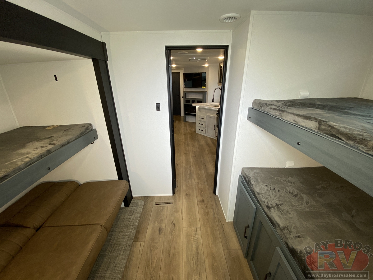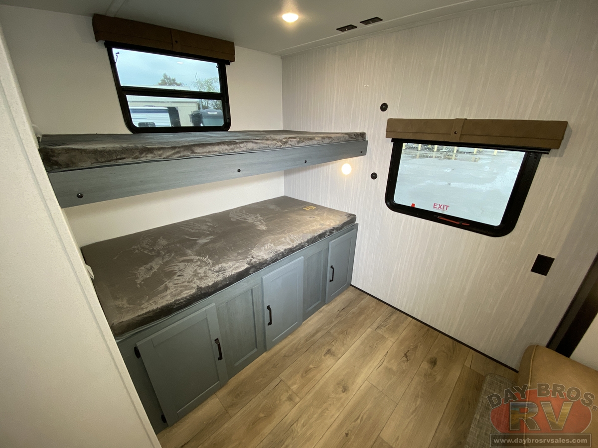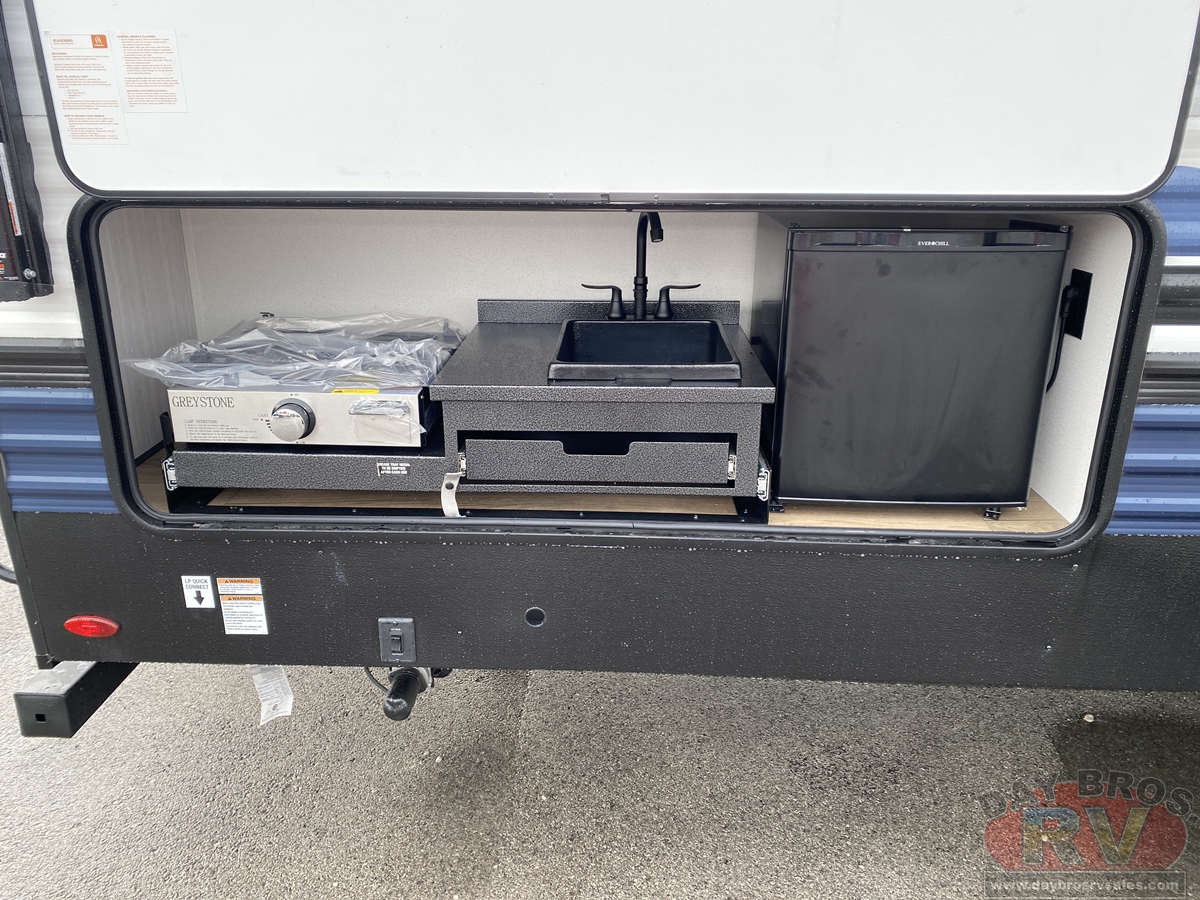 This bunk house travel trailer supplies you a great deal of space in the front bedroom. With a slide out and a large closet for all of your clothes, it will feel like your bedroom at home. The bunk house in the rear provides space for all guests to be comfortable and to make things a cut above, this floor plan provides two bathrooms. Furthermore, the exterior mini camp kitchen features a fridge and a griddle for those of you who like to cook in nature.