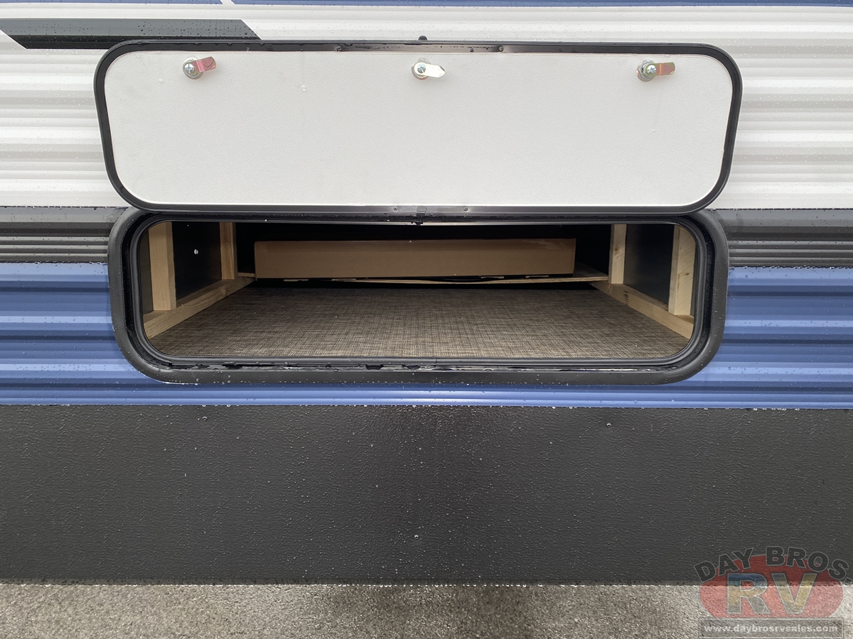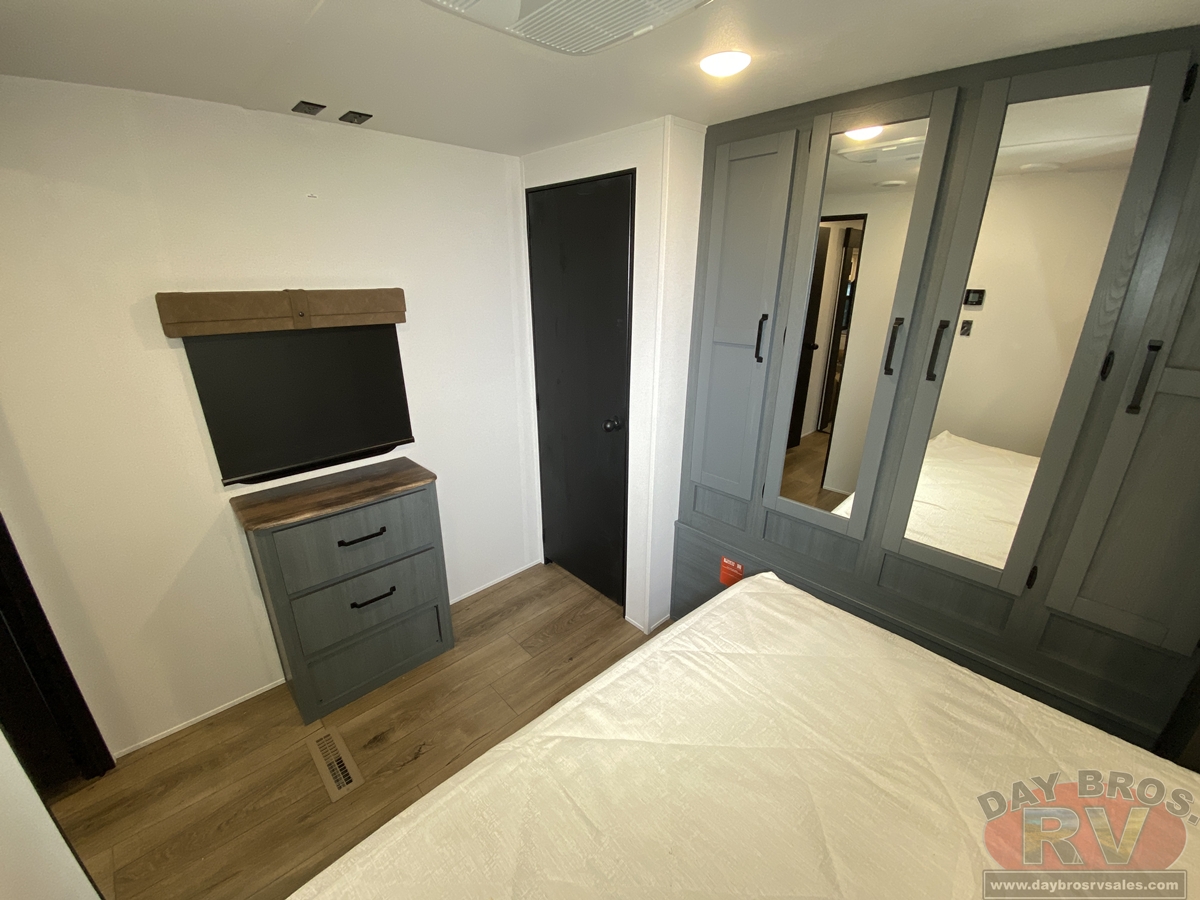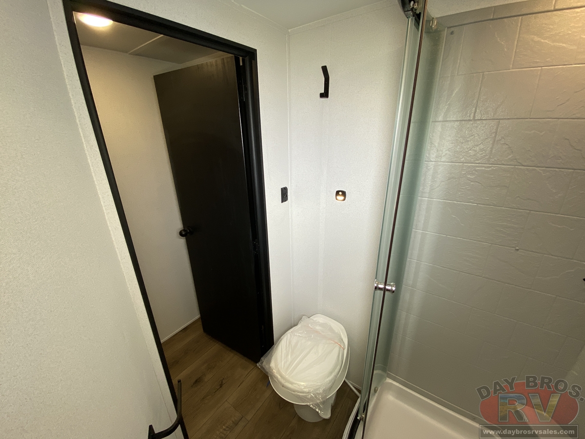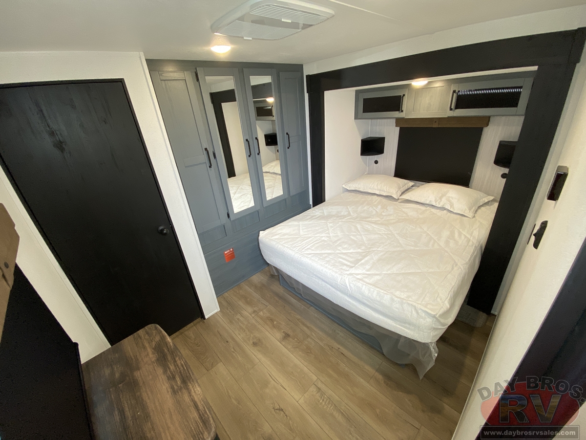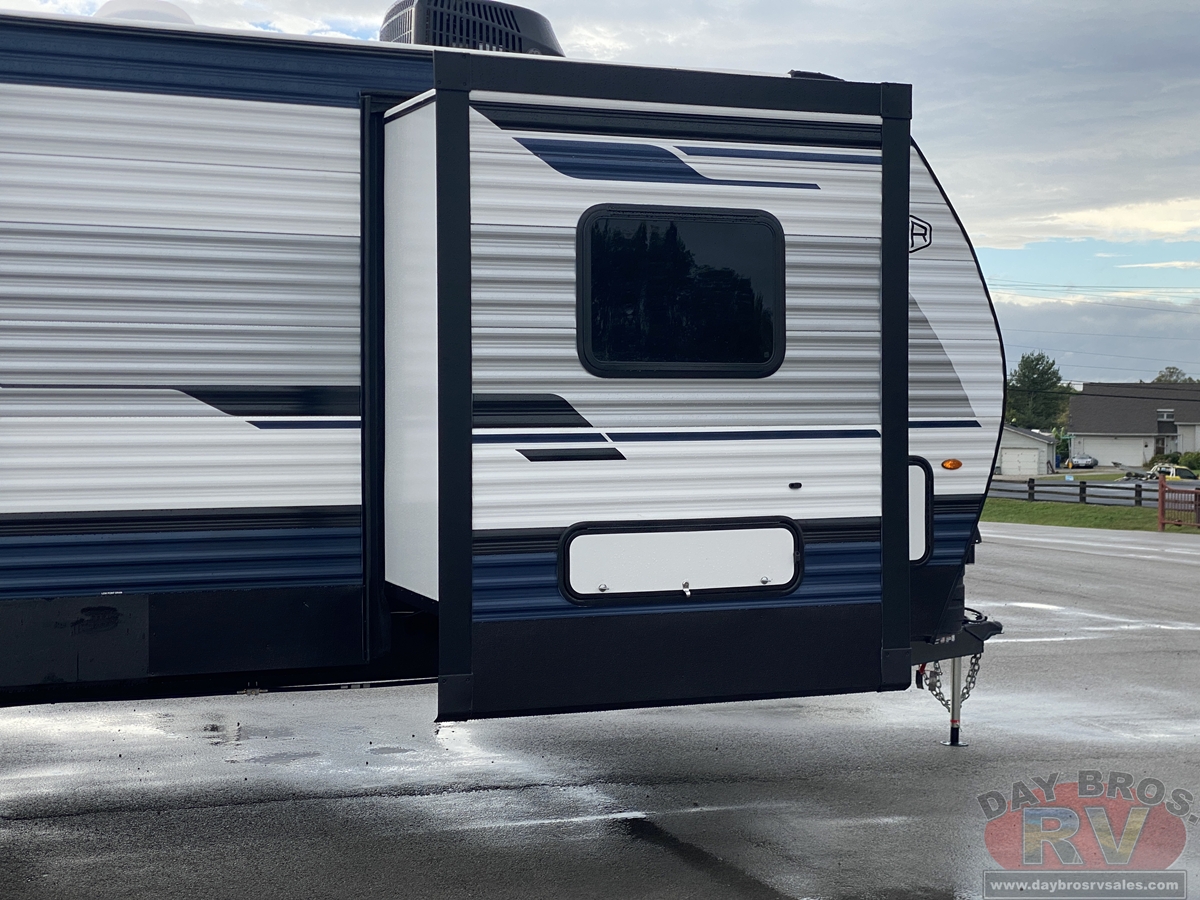 This bunk house travel trailer supplies you a great deal of space in the front bedroom. With a slide out and a large closet for all of your clothes, it will feel like your bedroom at home. The bunk house in the rear provides space for all guests to be comfortable and to make things a cut above, this floor plan provides two bathrooms. Furthermore, the exterior mini camp kitchen features a fridge and a griddle for those of you who like to cook in nature.