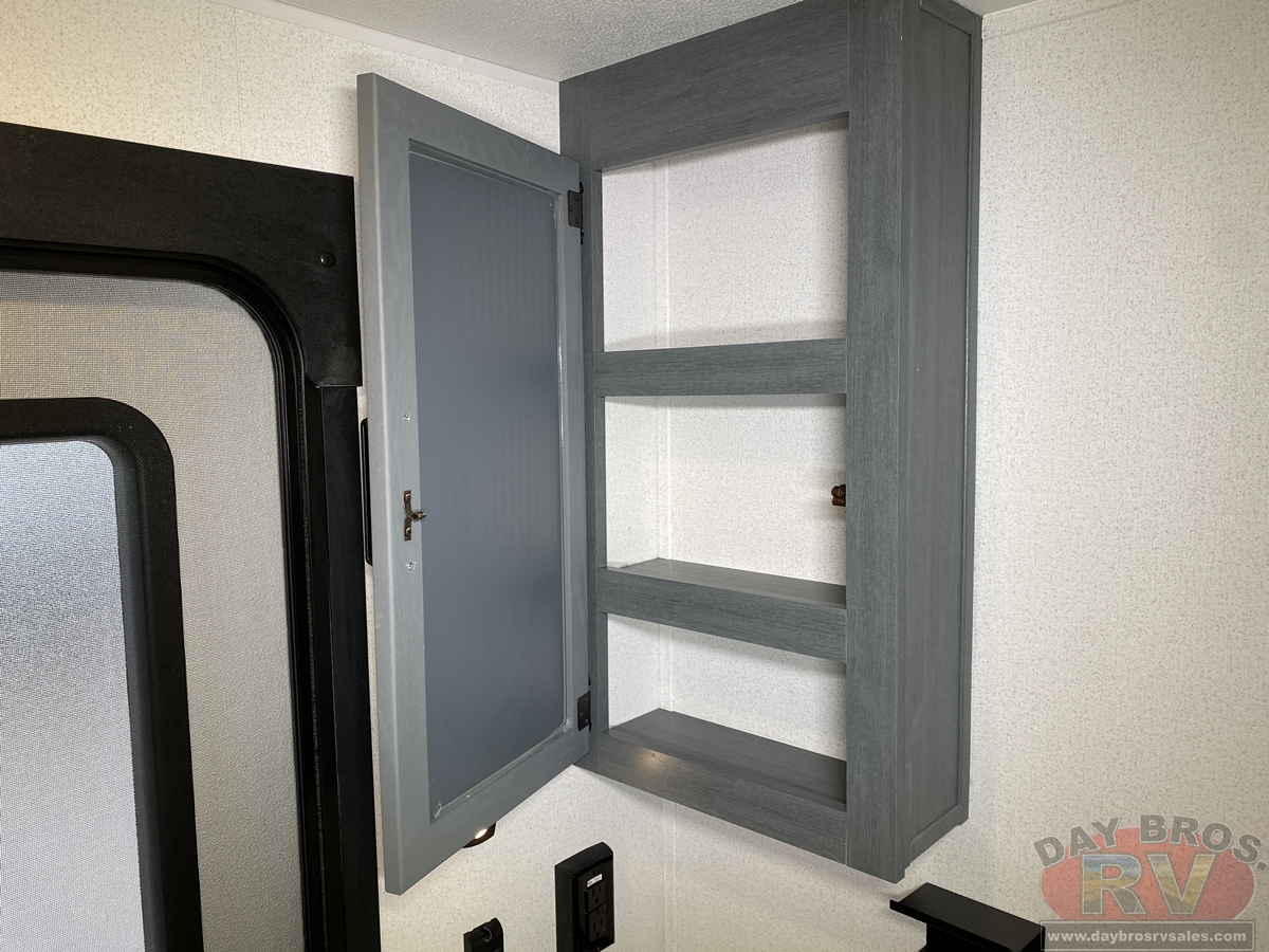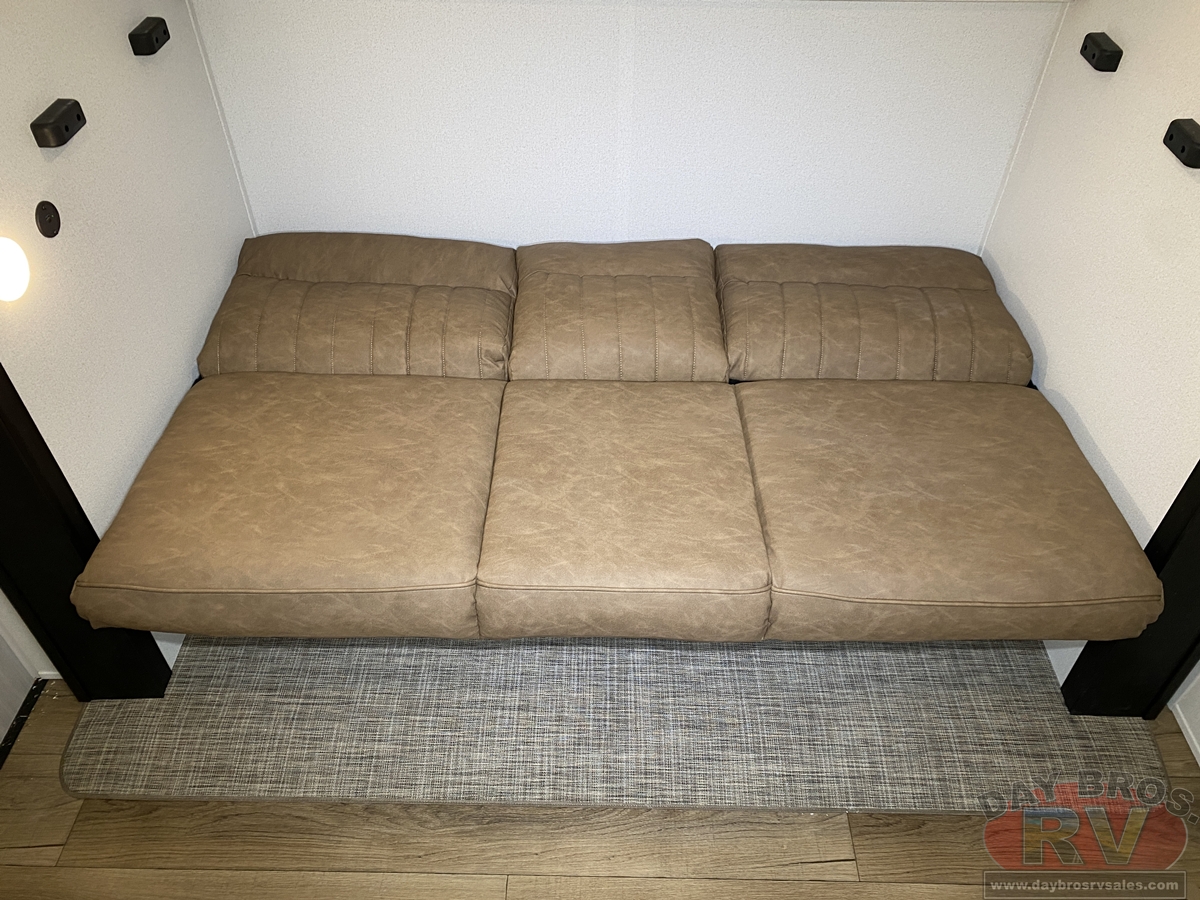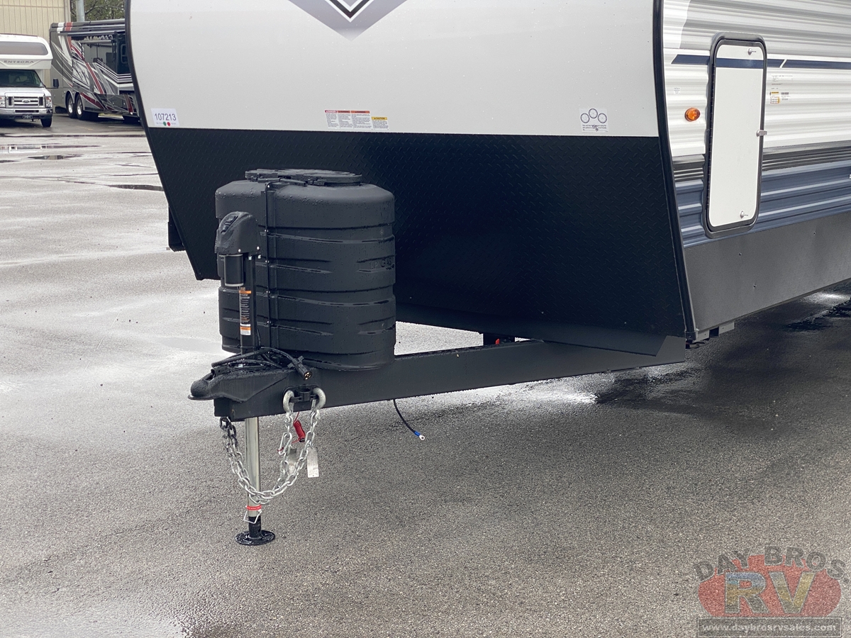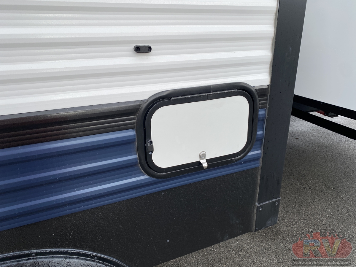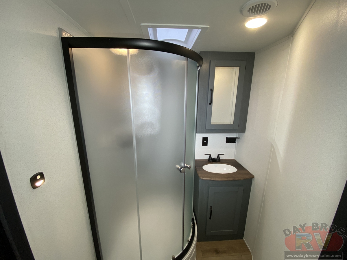 This bunk house travel trailer supplies you a great deal of space in the front bedroom. With a slide out and a large closet for all of your clothes, it will feel like your bedroom at home. The bunk house in the rear provides space for all guests to be comfortable and to make things a cut above, this floor plan provides two bathrooms. Furthermore, the exterior mini camp kitchen features a fridge and a griddle for those of you who like to cook in nature.