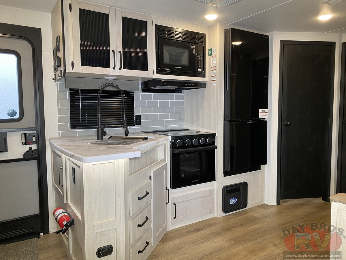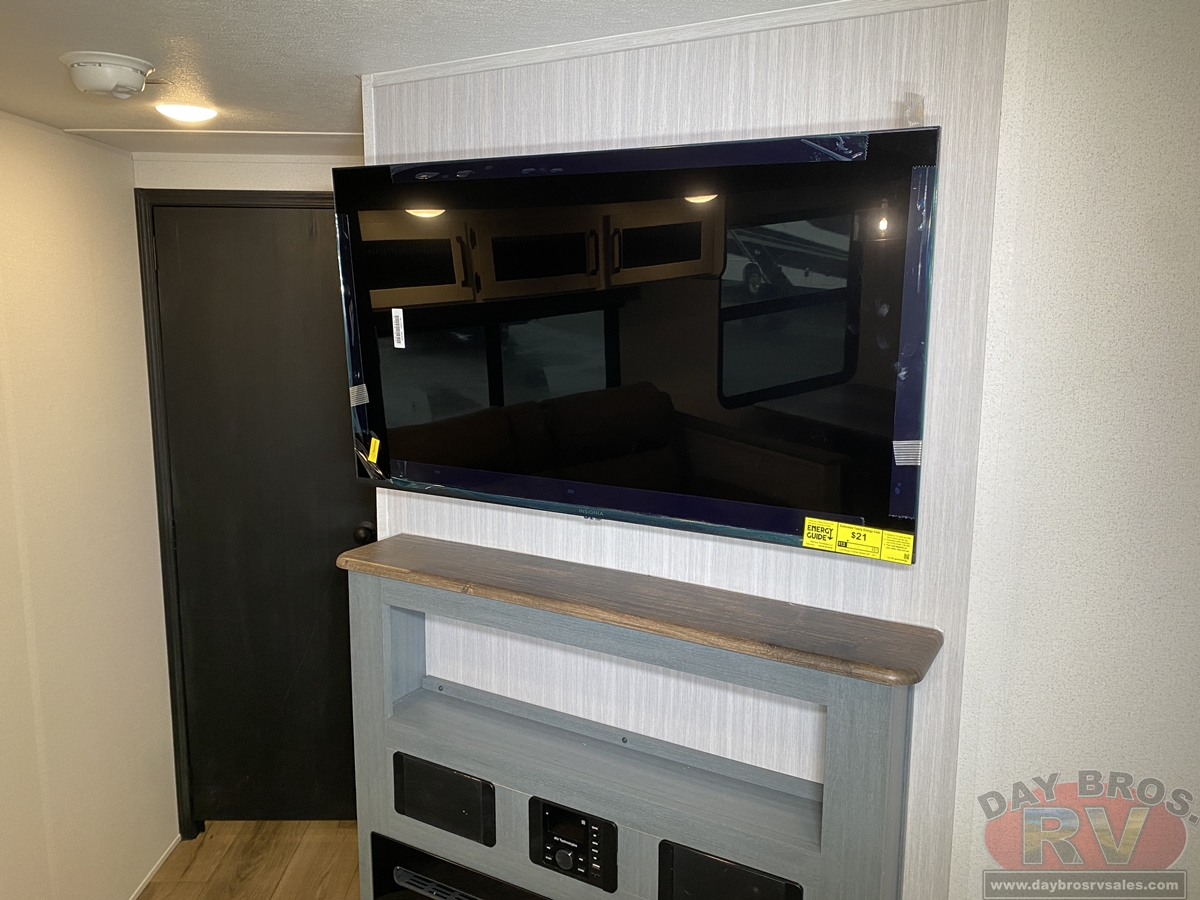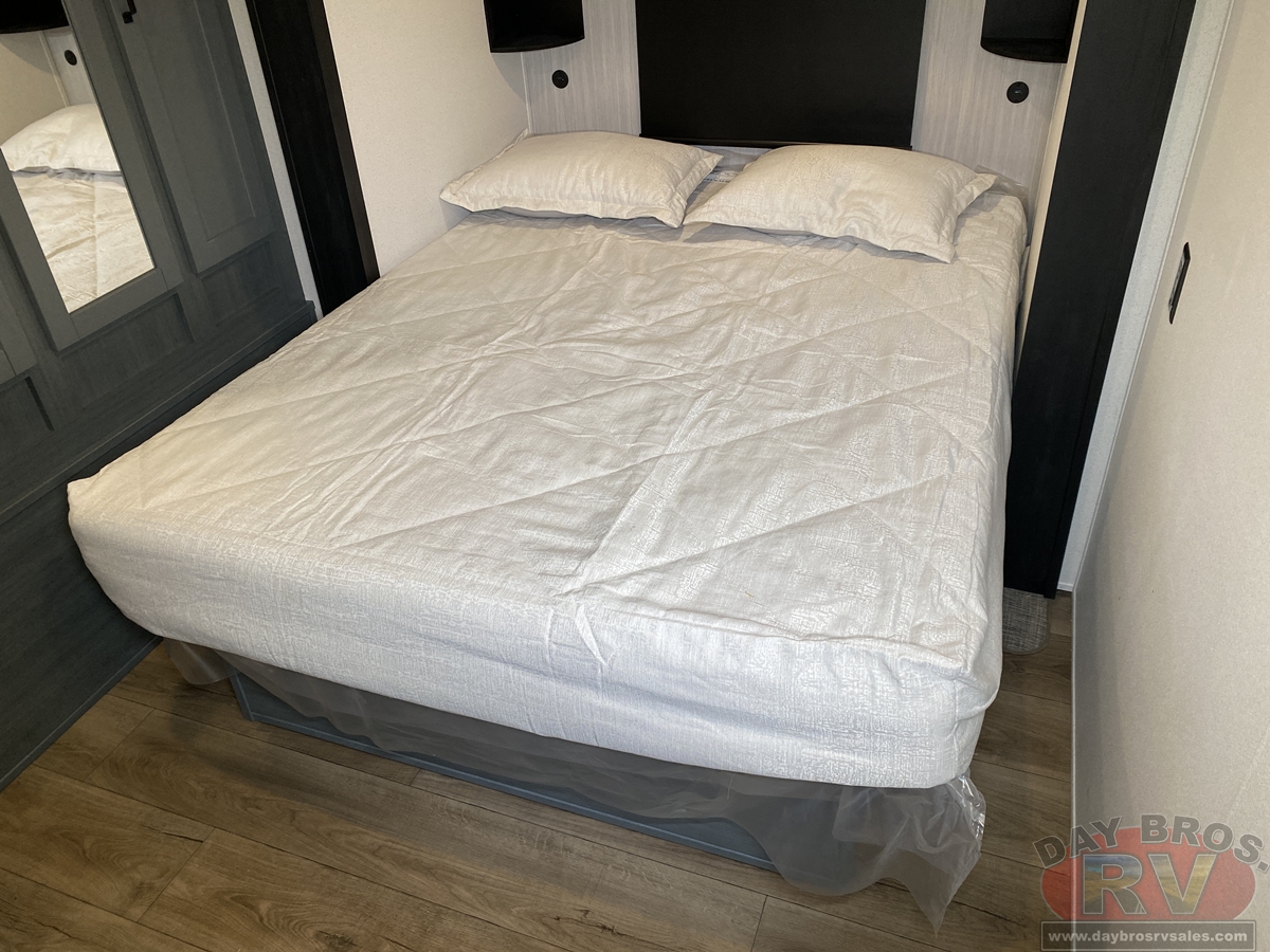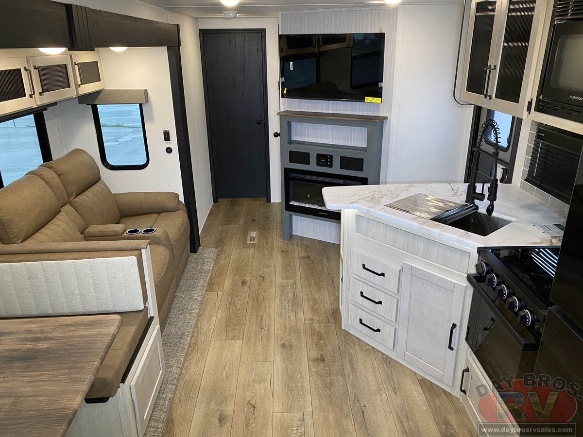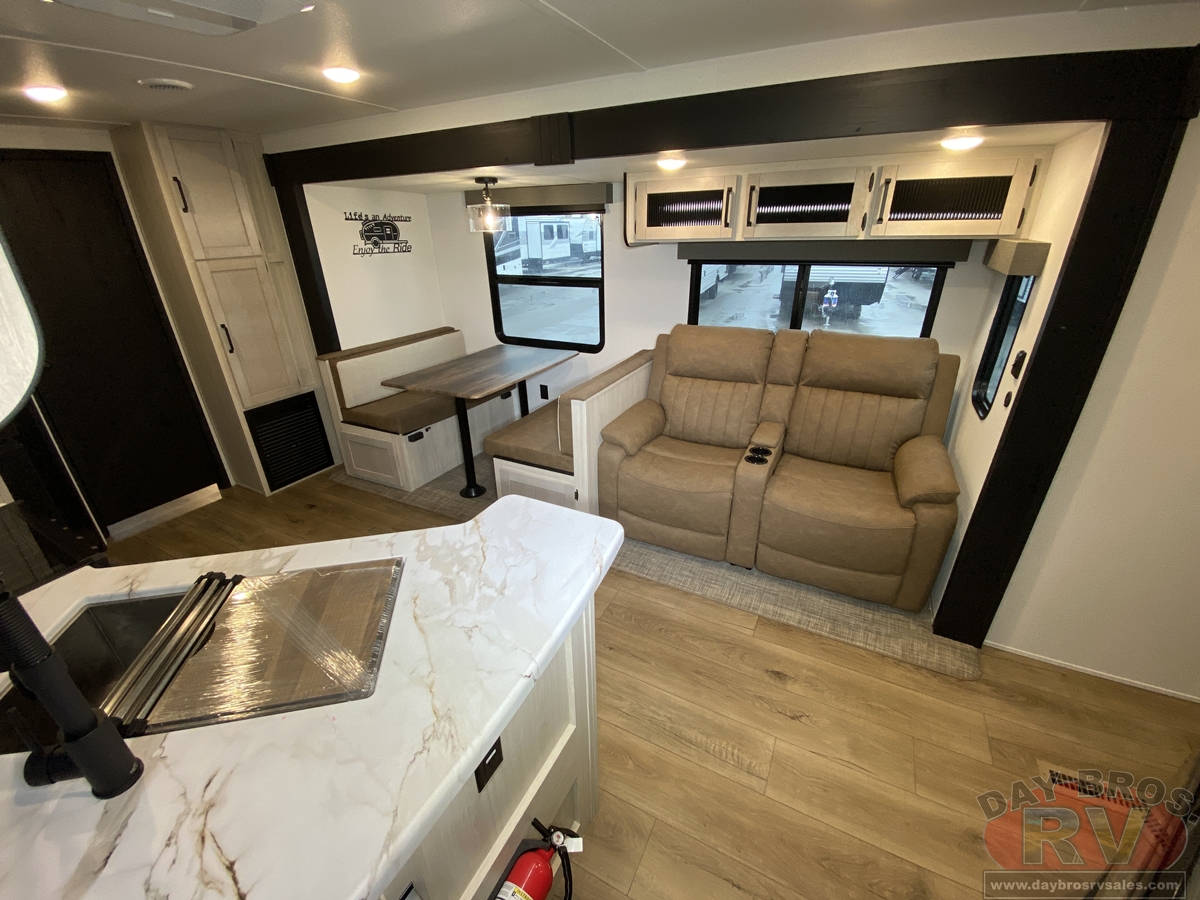 This bunk house travel trailer supplies you a great deal of space in the front bedroom. With a slide out and a large closet for all of your clothes, it will feel like your bedroom at home. The bunk house in the rear provides space for all guests to be comfortable and to make things a cut above, this floor plan provides two bathrooms. Furthermore, the exterior mini camp kitchen features a fridge and a griddle for those of you who like to cook in nature.