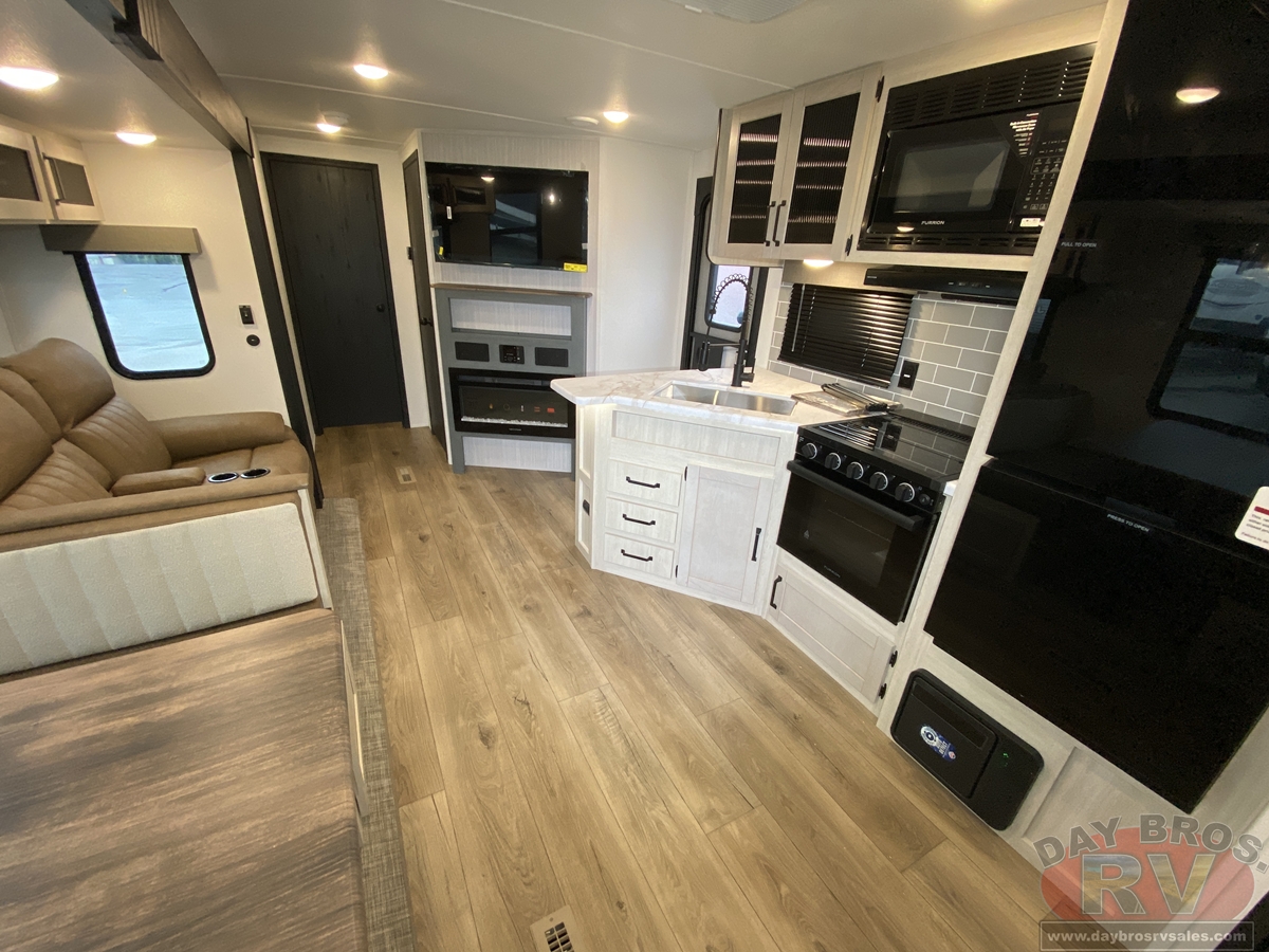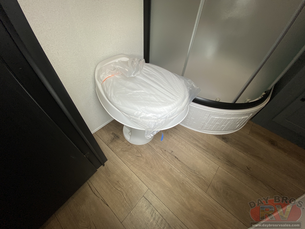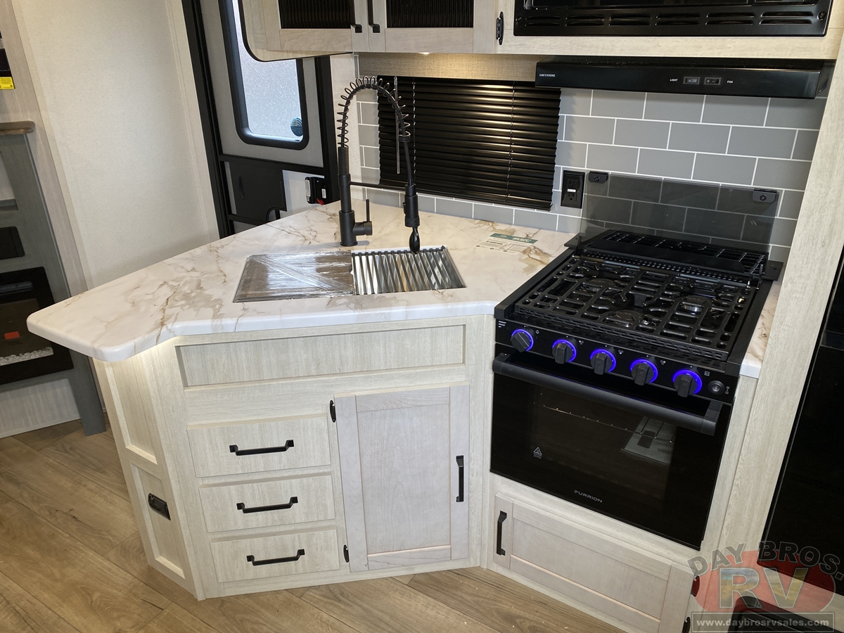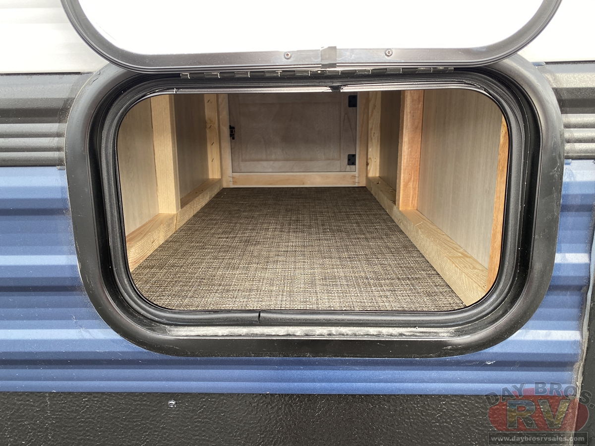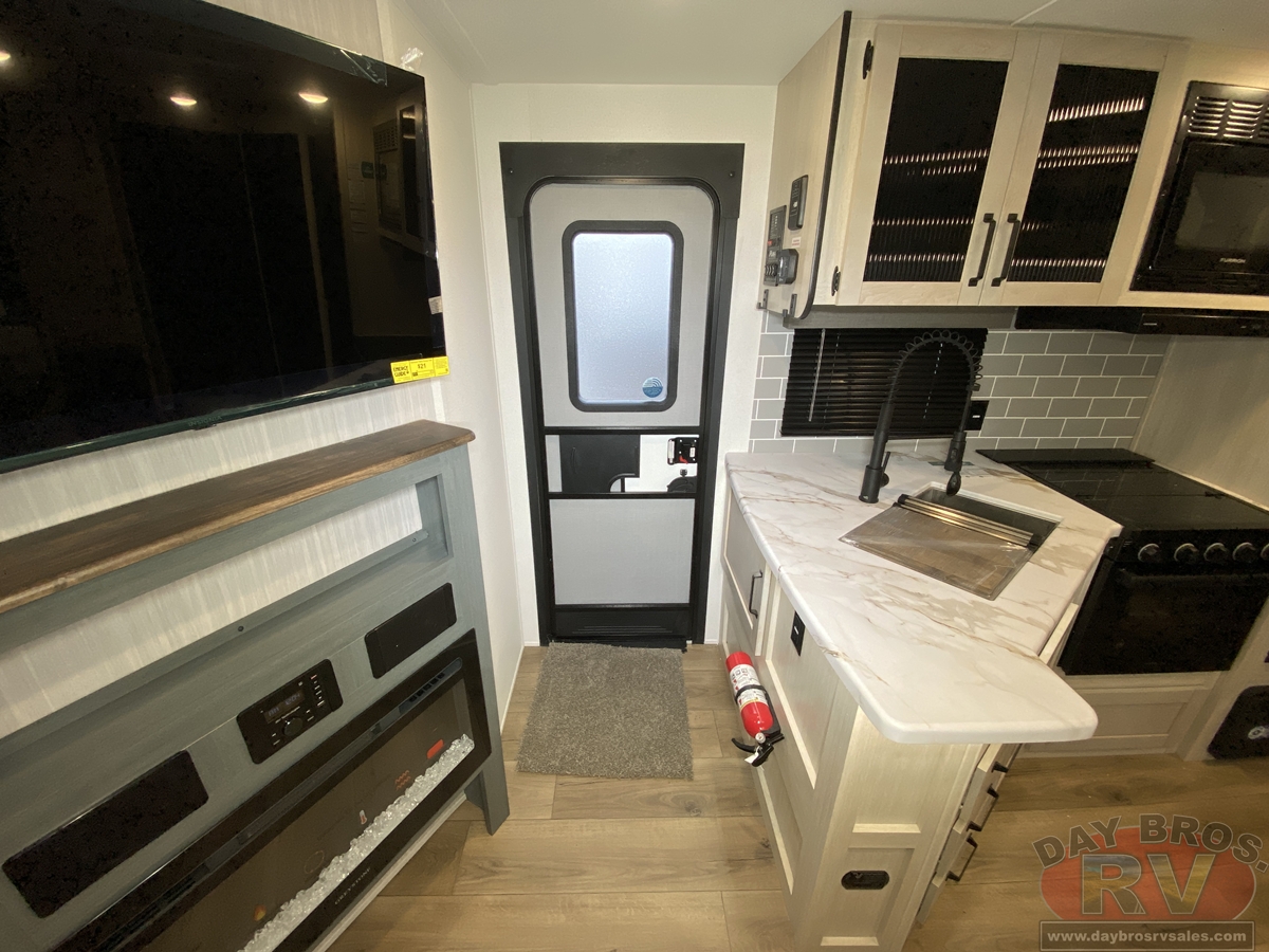 This bunk house travel trailer supplies you a great deal of space in the front bedroom. With a slide out and a large closet for all of your clothes, it will feel like your bedroom at home. The bunk house in the rear provides space for all guests to be comfortable and to make things a cut above, this floor plan provides two bathrooms. Furthermore, the exterior mini camp kitchen features a fridge and a griddle for those of you who like to cook in nature.