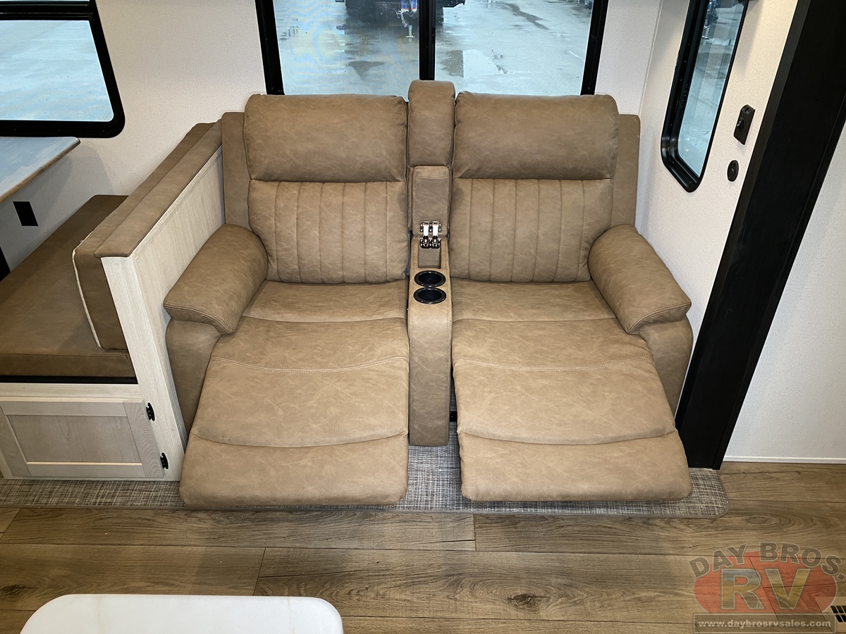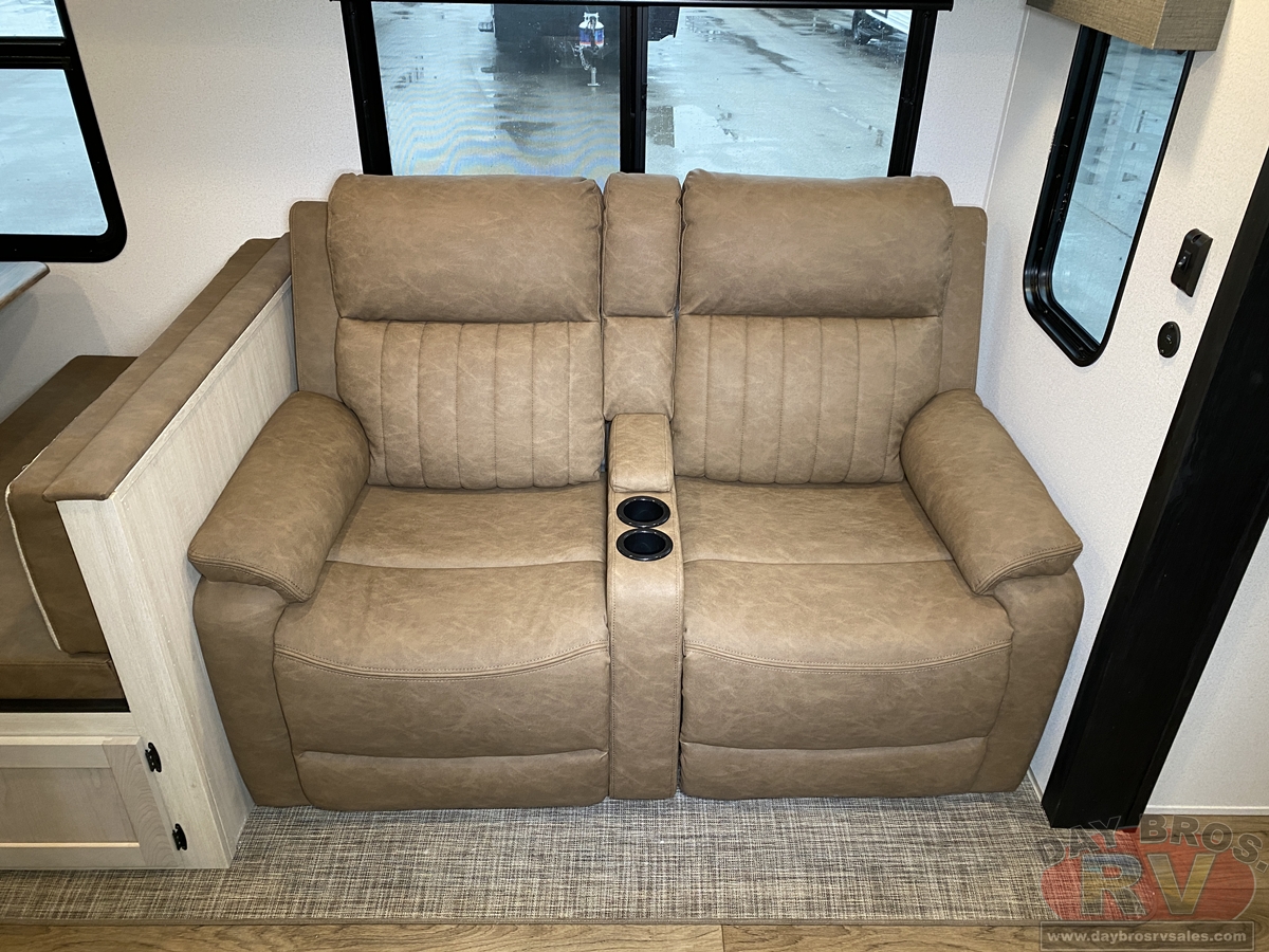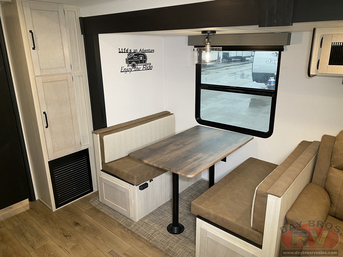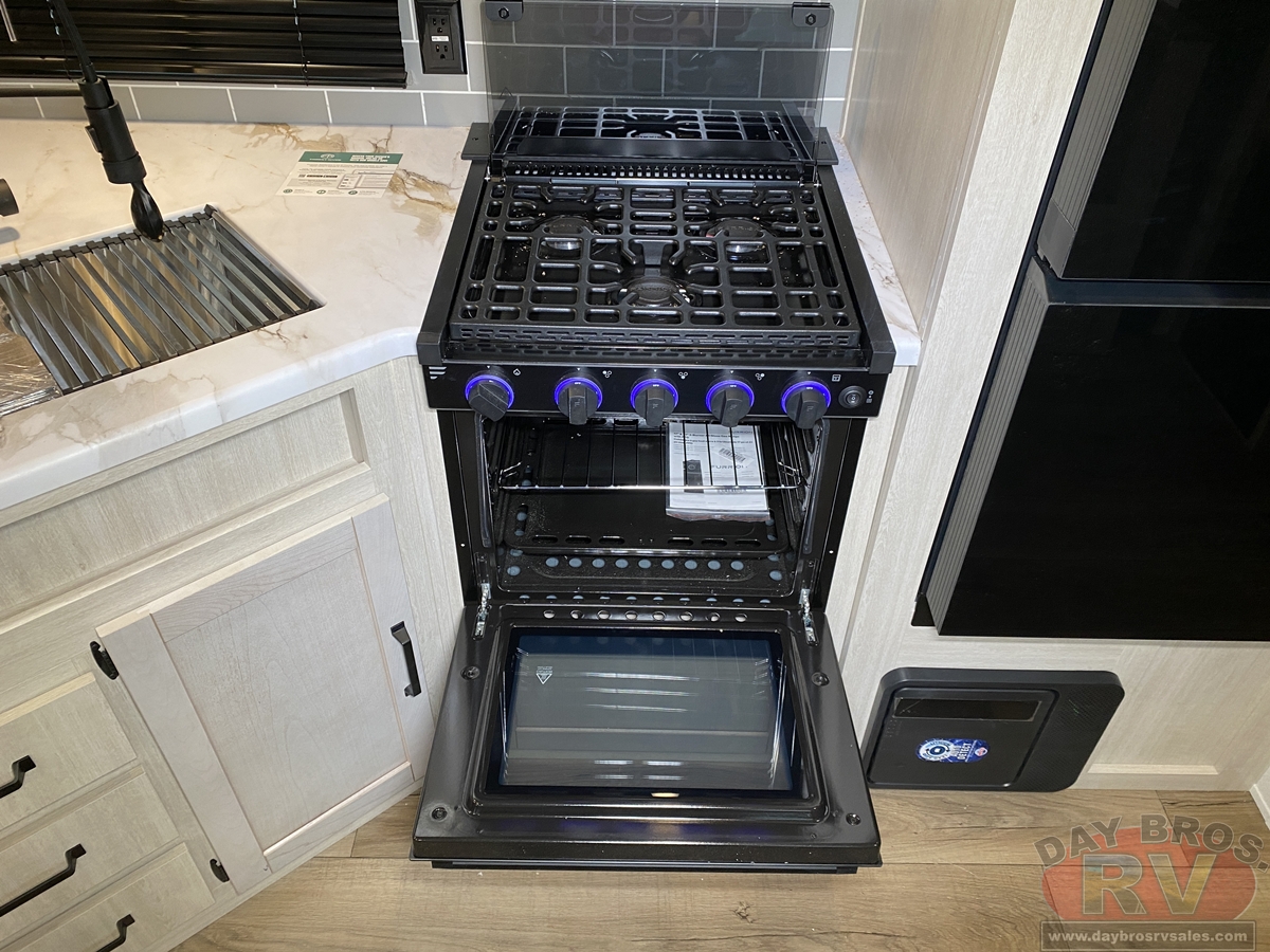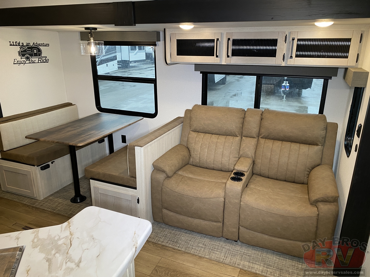 This bunk house travel trailer supplies you a great deal of space in the front bedroom. With a slide out and a large closet for all of your clothes, it will feel like your bedroom at home. The bunk house in the rear provides space for all guests to be comfortable and to make things a cut above, this floor plan provides two bathrooms. Furthermore, the exterior mini camp kitchen features a fridge and a griddle for those of you who like to cook in nature.
