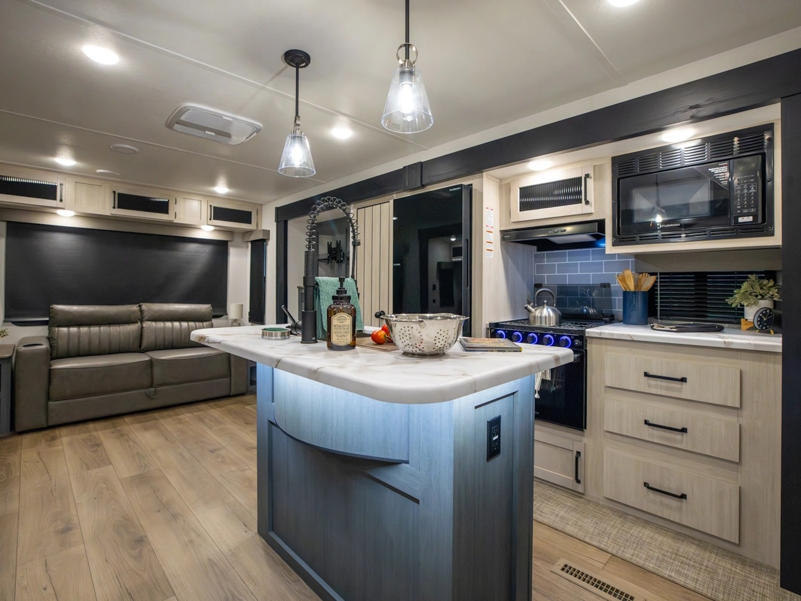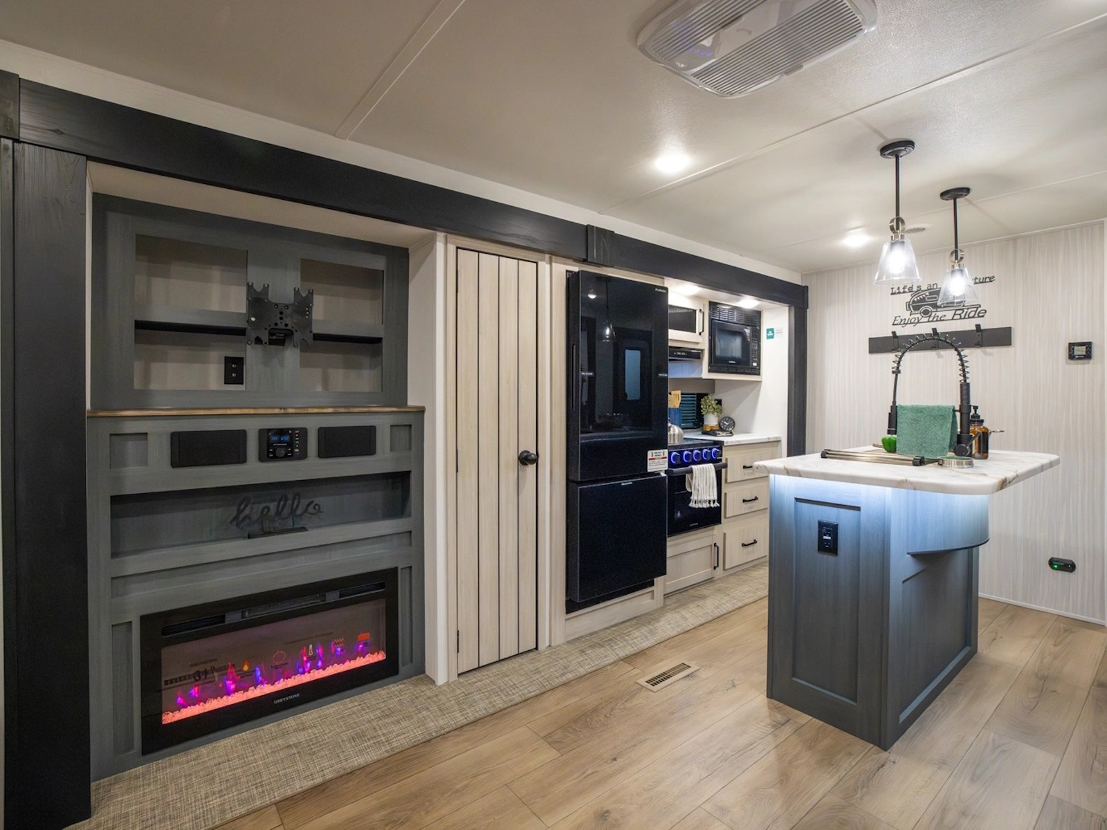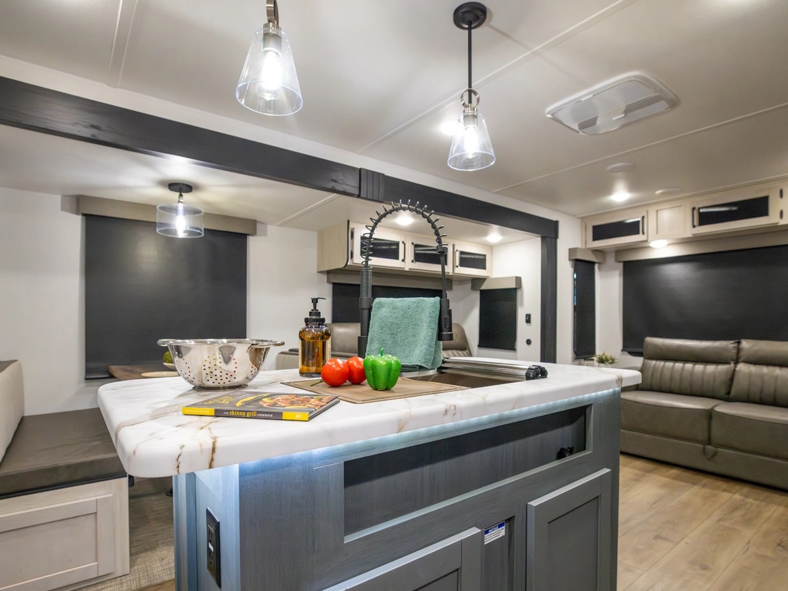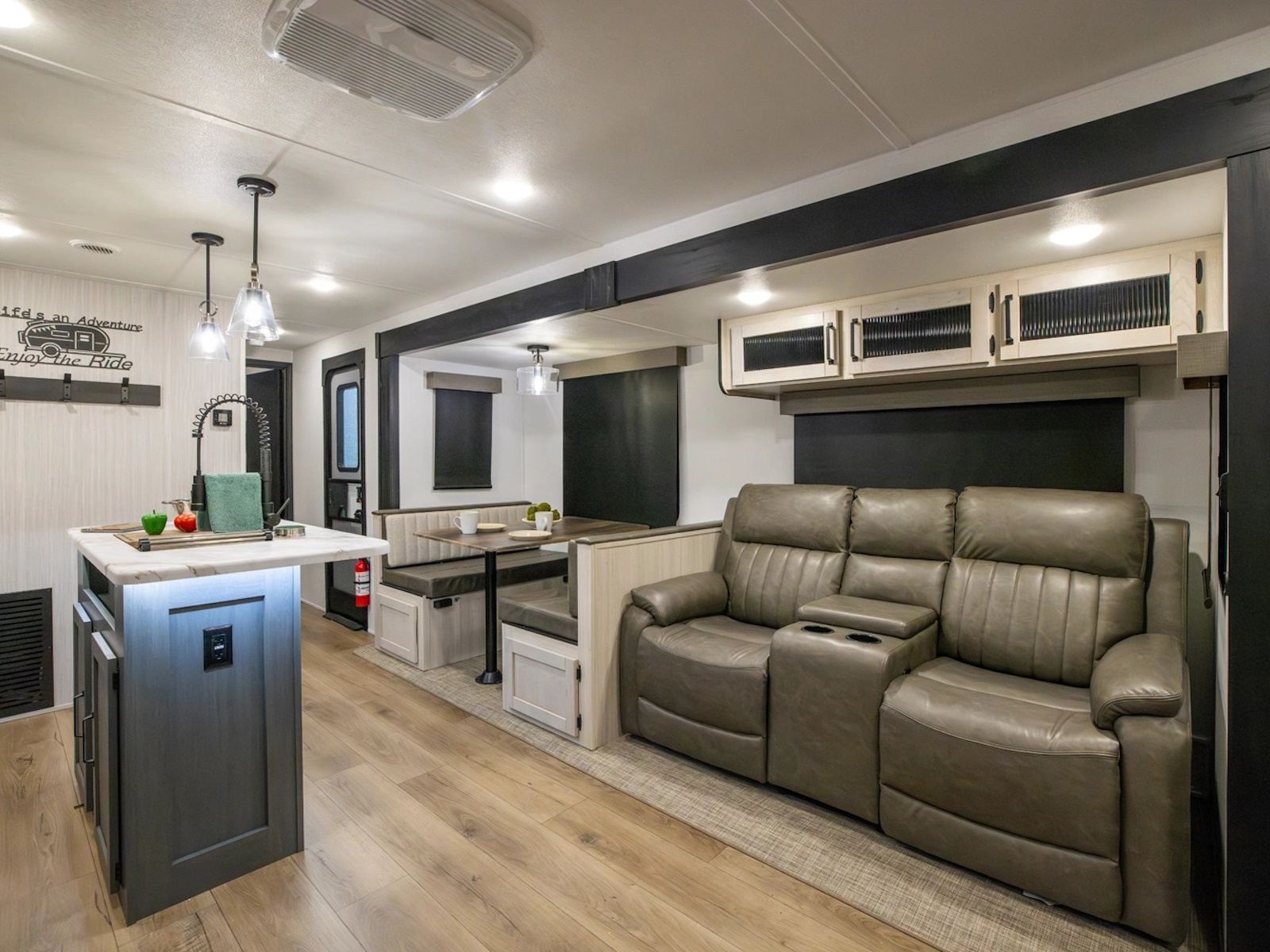 This rear living travel trailer has a sofa, recliners, and a dinette all in the rear of the camper. This spacious floor plan provides you with opposing slides that will make you feel as if you are right at home due to all of the space you receive. This island kitchen fifth wheel with an enormous rear window gives you a great vista of the back of your camper. To top things off, the front of the camper will have a slide out containing a queen bed, closet with washer/dryer prep and a full bathroom.