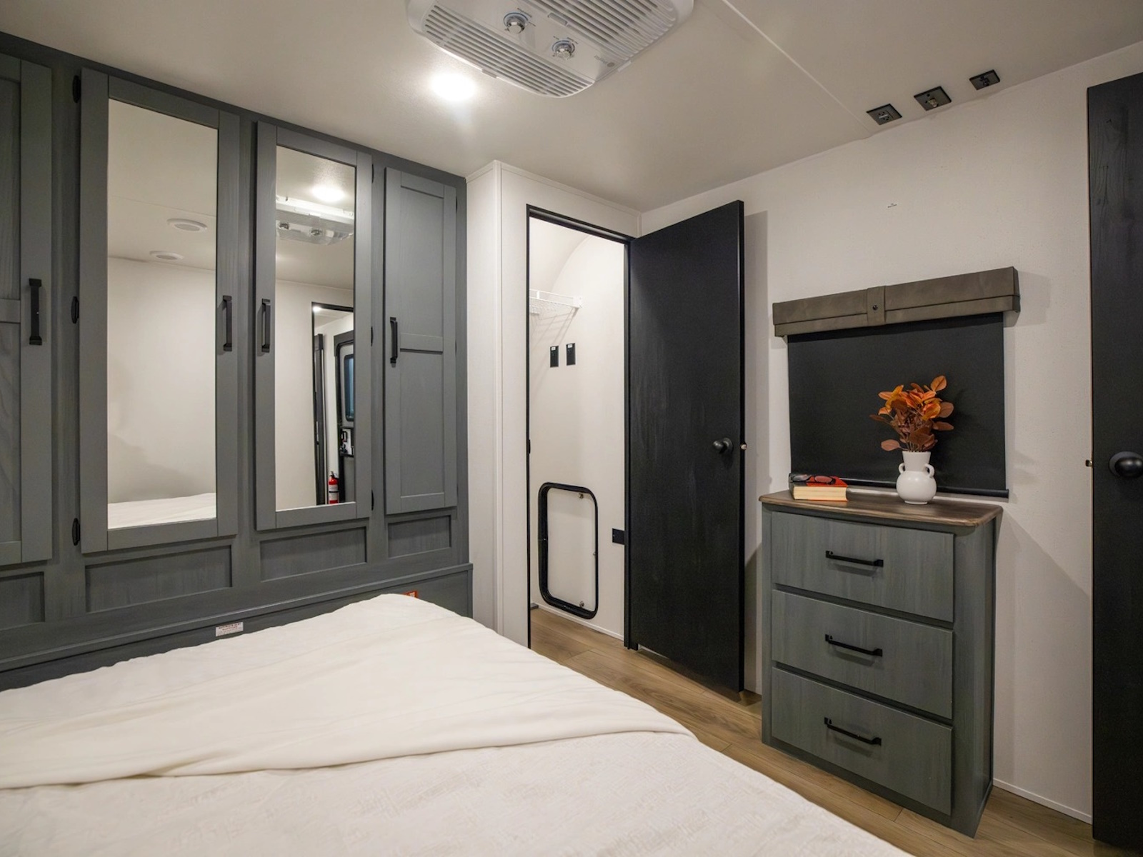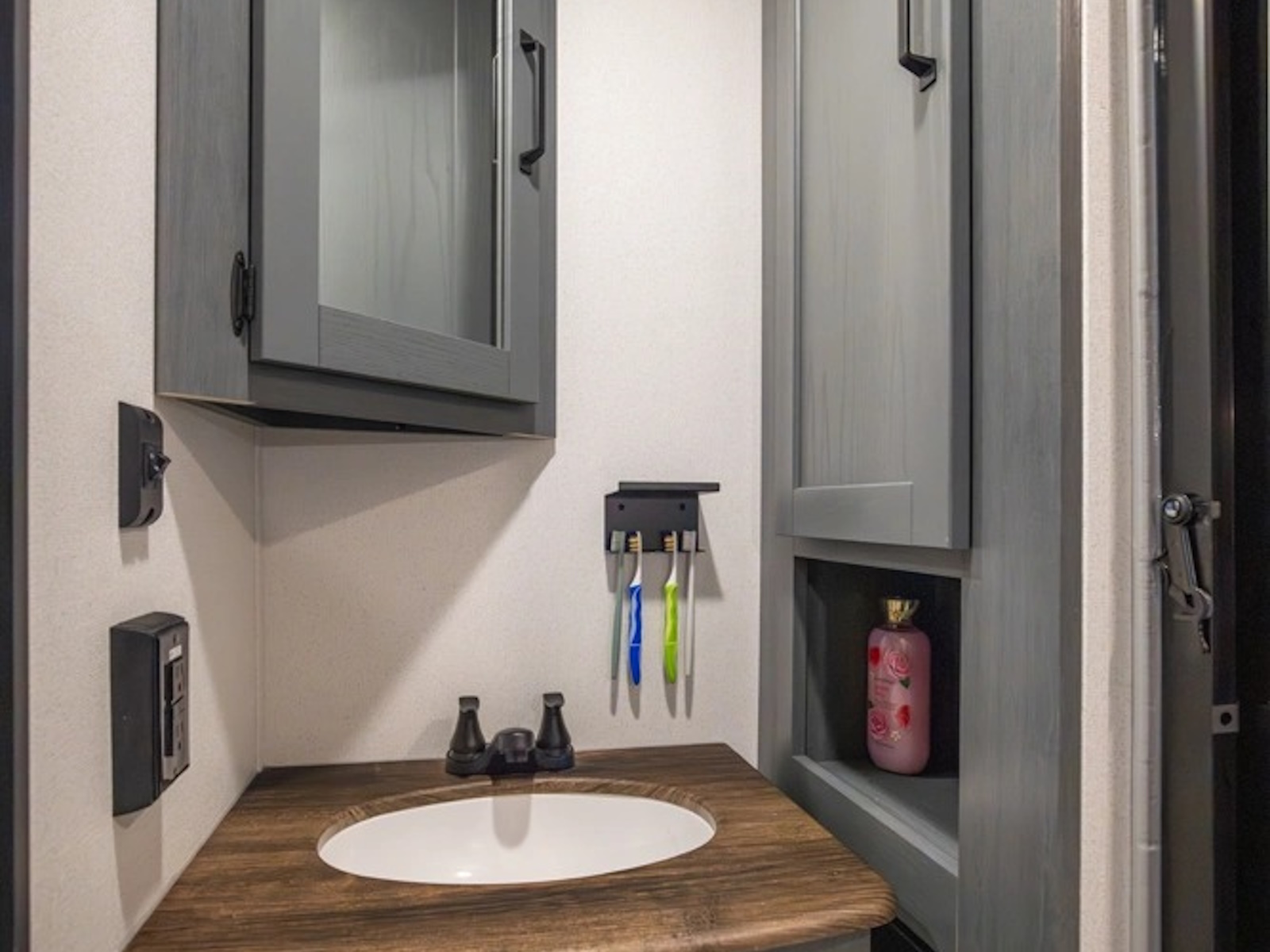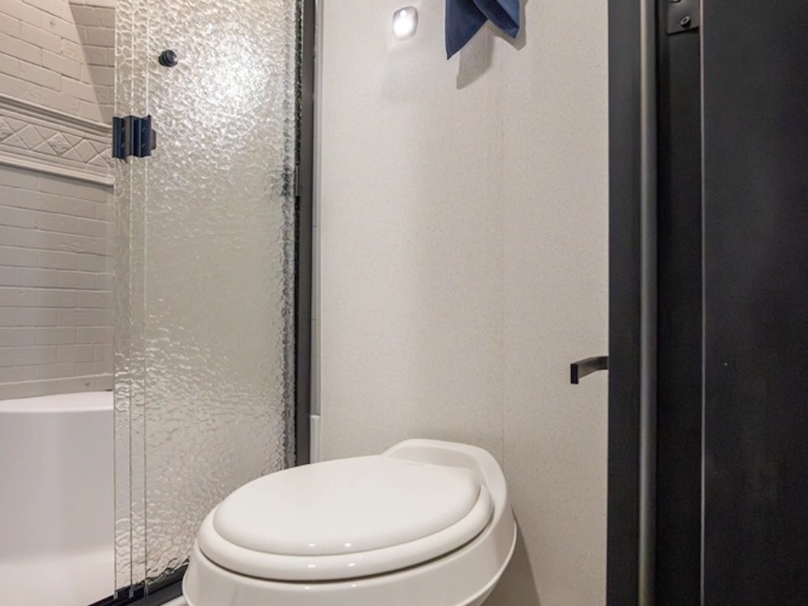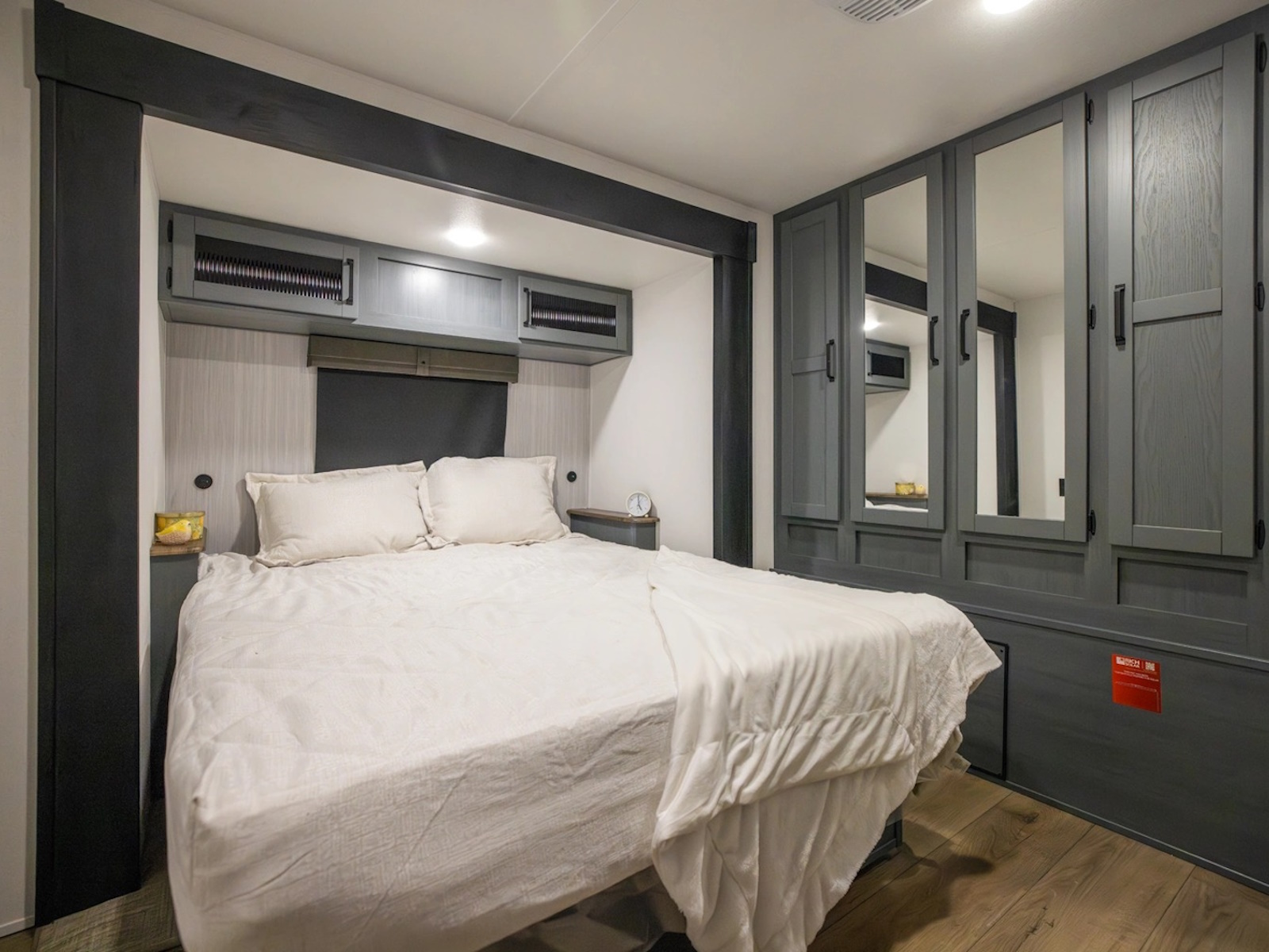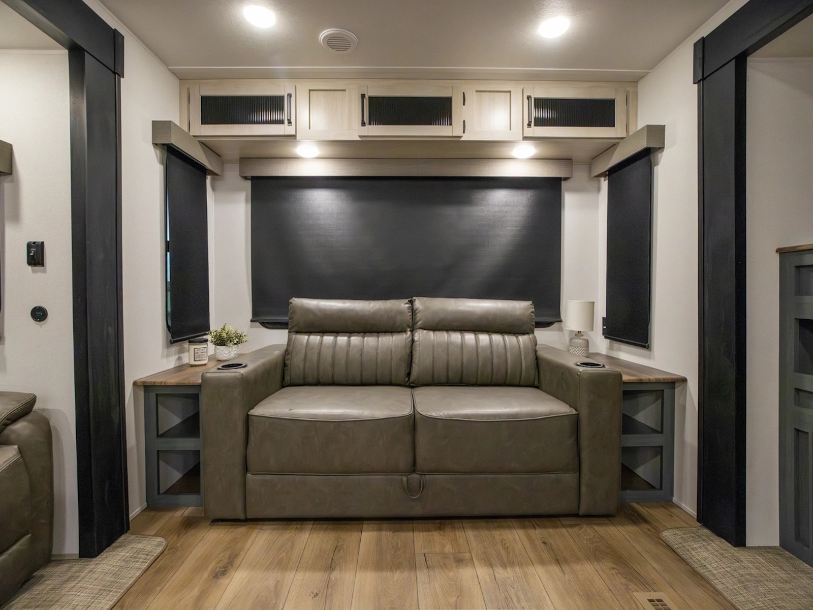 This rear living travel trailer has a sofa, recliners, and a dinette all in the rear of the camper. This spacious floor plan provides you with opposing slides that will make you feel as if you are right at home due to all of the space you receive. This island kitchen fifth wheel with an enormous rear window gives you a great vista of the back of your camper. To top things off, the front of the camper will have a slide out containing a queen bed, closet with washer/dryer prep and a full bathroom.