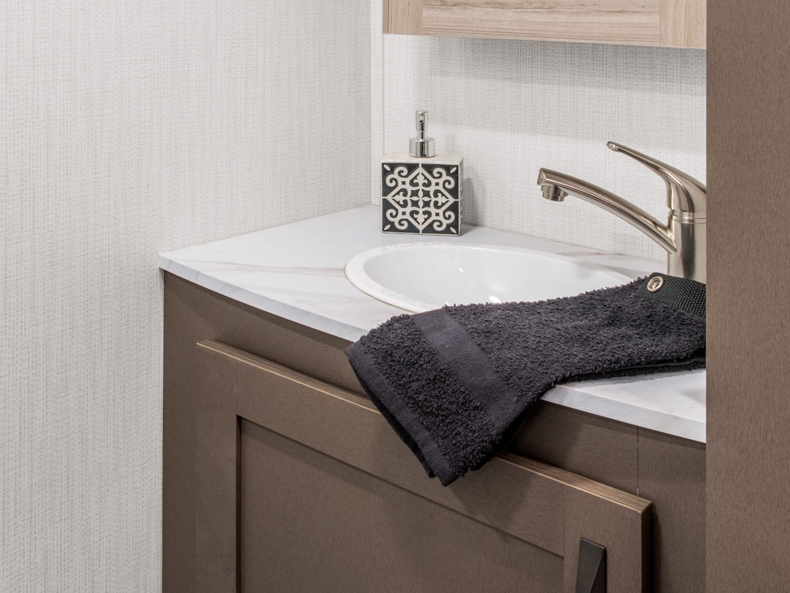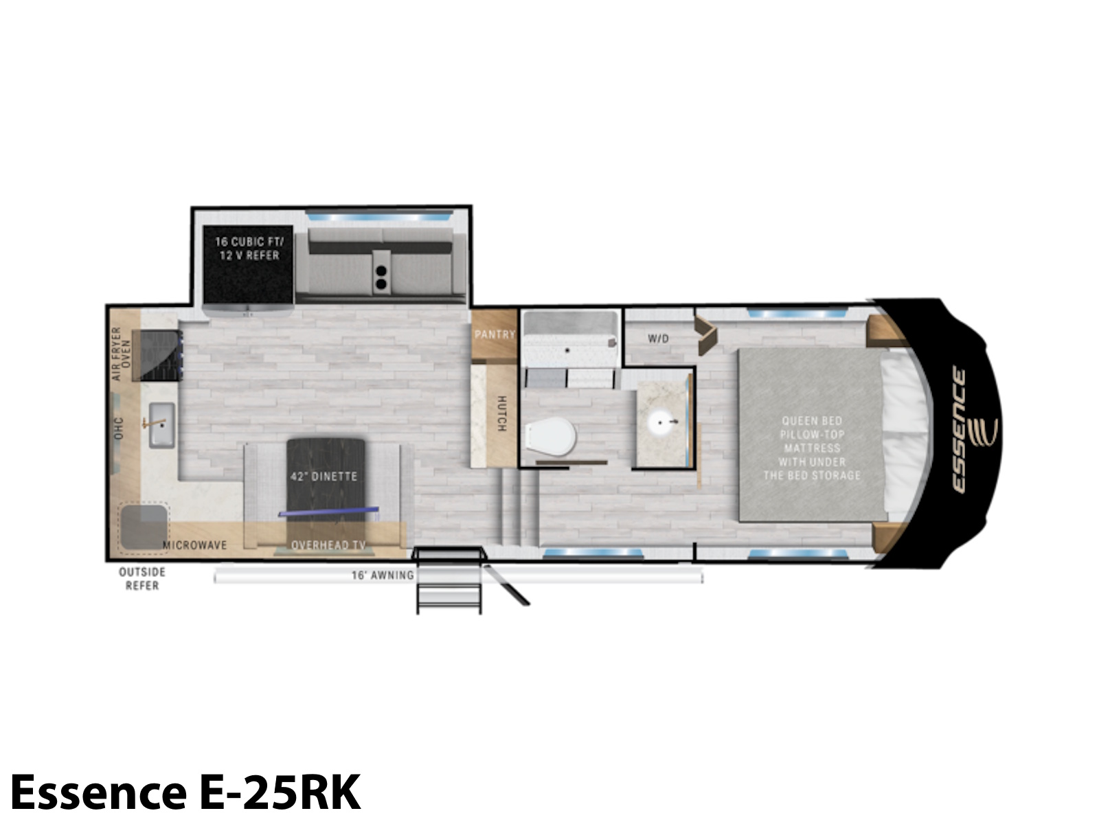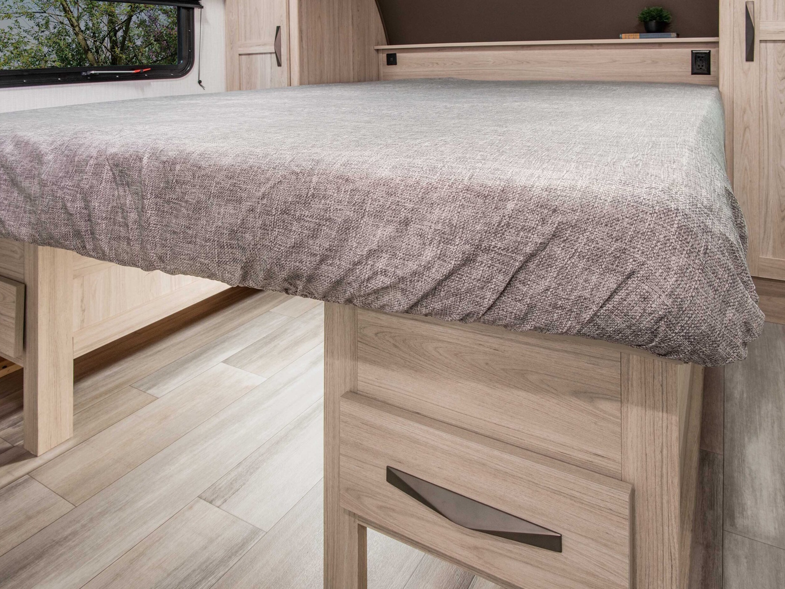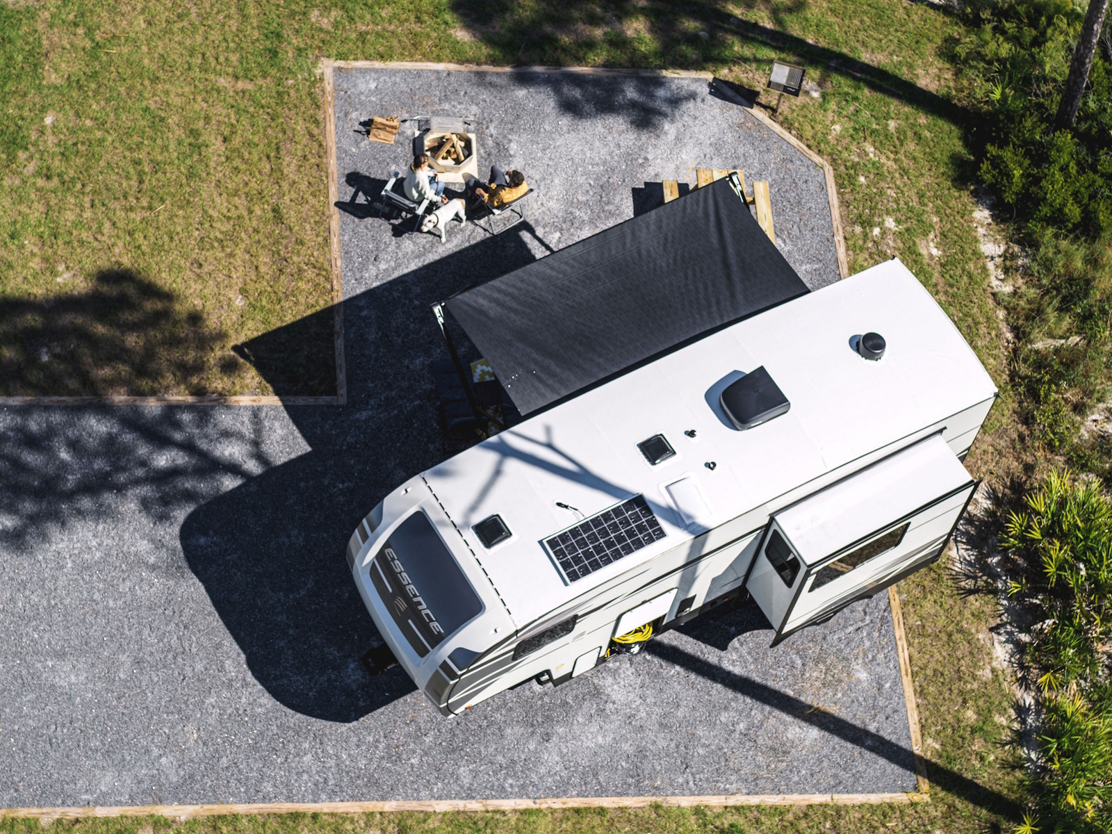 Welcome to the lighter side of luxury in the RV world. Essence, our newest masterpiece, has been meticulously designed to offer you an unrivaled experience on the road. With a keen focus on your comfort and convenience, Essence boasts an abundance of features that will transform your journeys into unforgettable adventures. Step inside to find a world of elegance, from top-quality furnishings to carefully selected finishes, to solid surface kitchen top is not only exquisite but also highly functional, providing you with the perfect space for culinary creativity. We’ve also thought about storage. The Store More bed base is an innovative solution that maximizes your space, ensuring you can bring everything you need on your journeys.