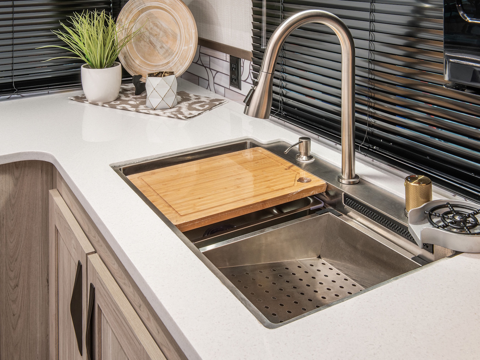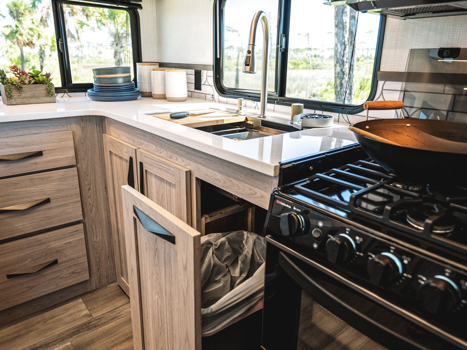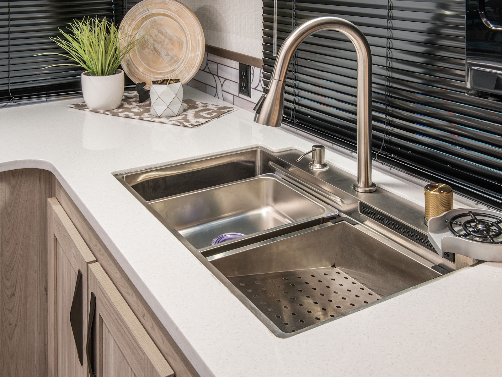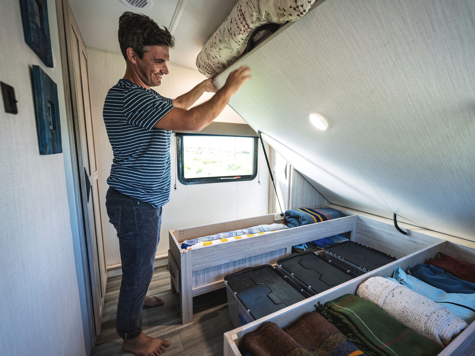 Welcome to the lighter side of luxury in the RV world. Essence, our newest masterpiece, has been meticulously designed to offer you an unrivaled experience on the road. With a keen focus on your comfort and convenience, Essence boasts an abundance of features that will transform your journeys into unforgettable adventures. Step inside to find a world of elegance, from top-quality furnishings to carefully selected finishes, to solid surface kitchen top is not only exquisite but also highly functional, providing you with the perfect space for culinary creativity. We’ve also thought about storage. The Store More bed base is an innovative solution that maximizes your space, ensuring you can bring everything you need on your journeys.
