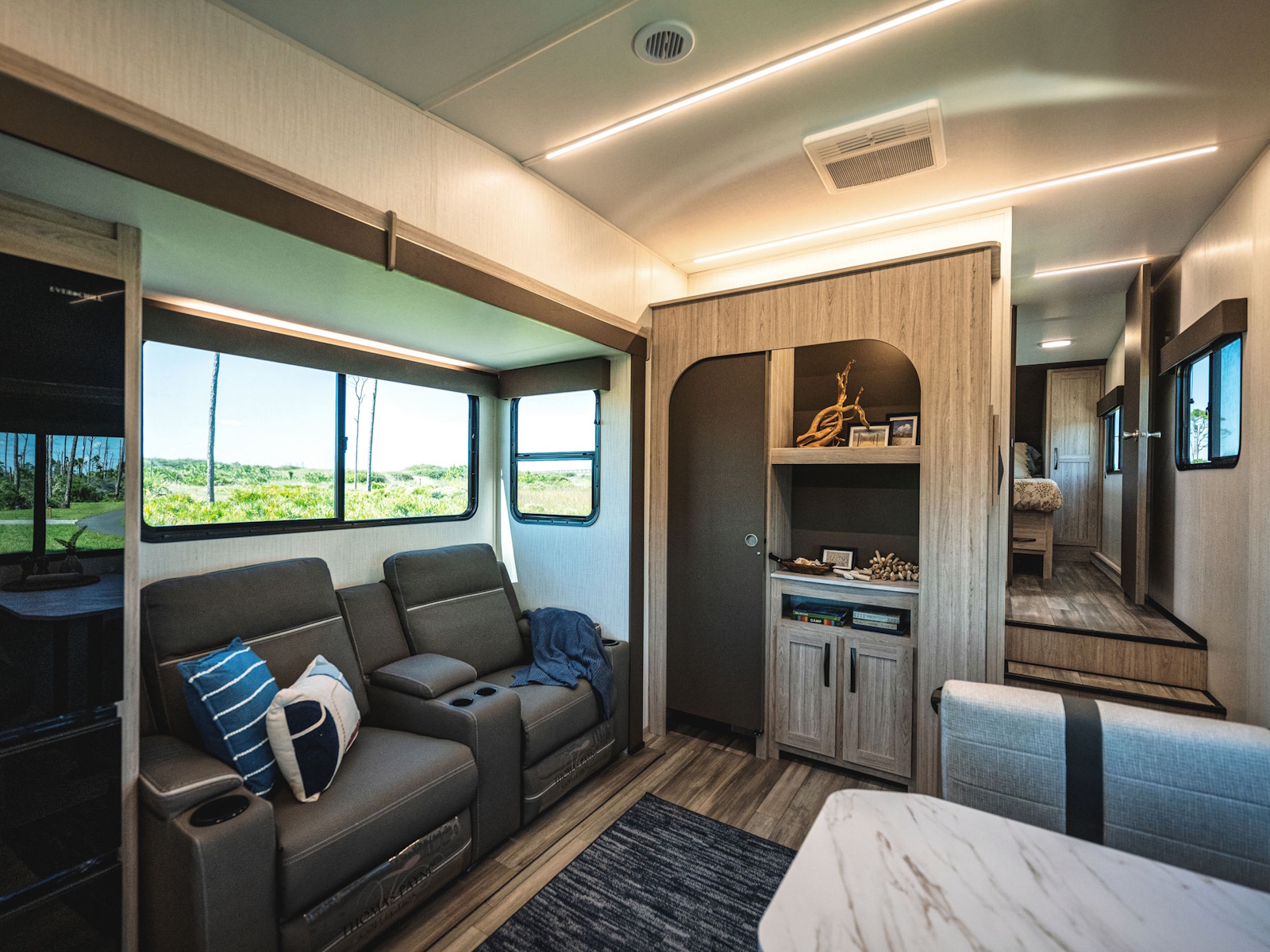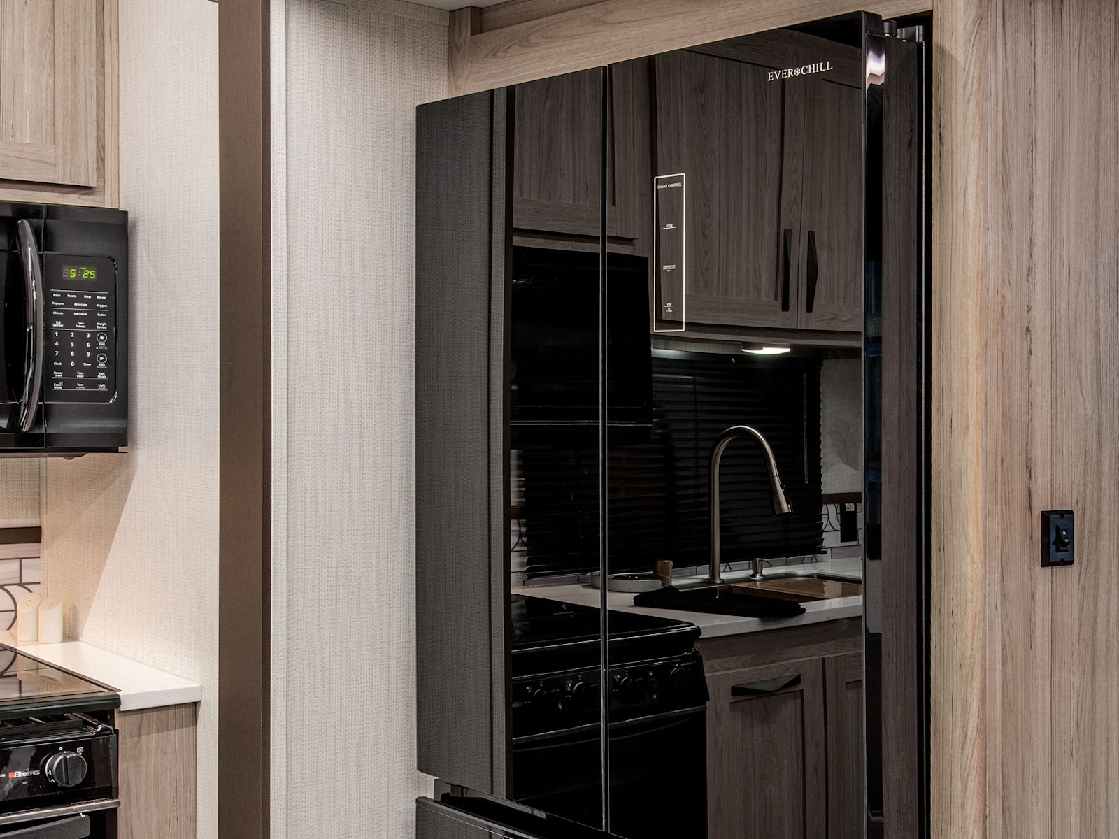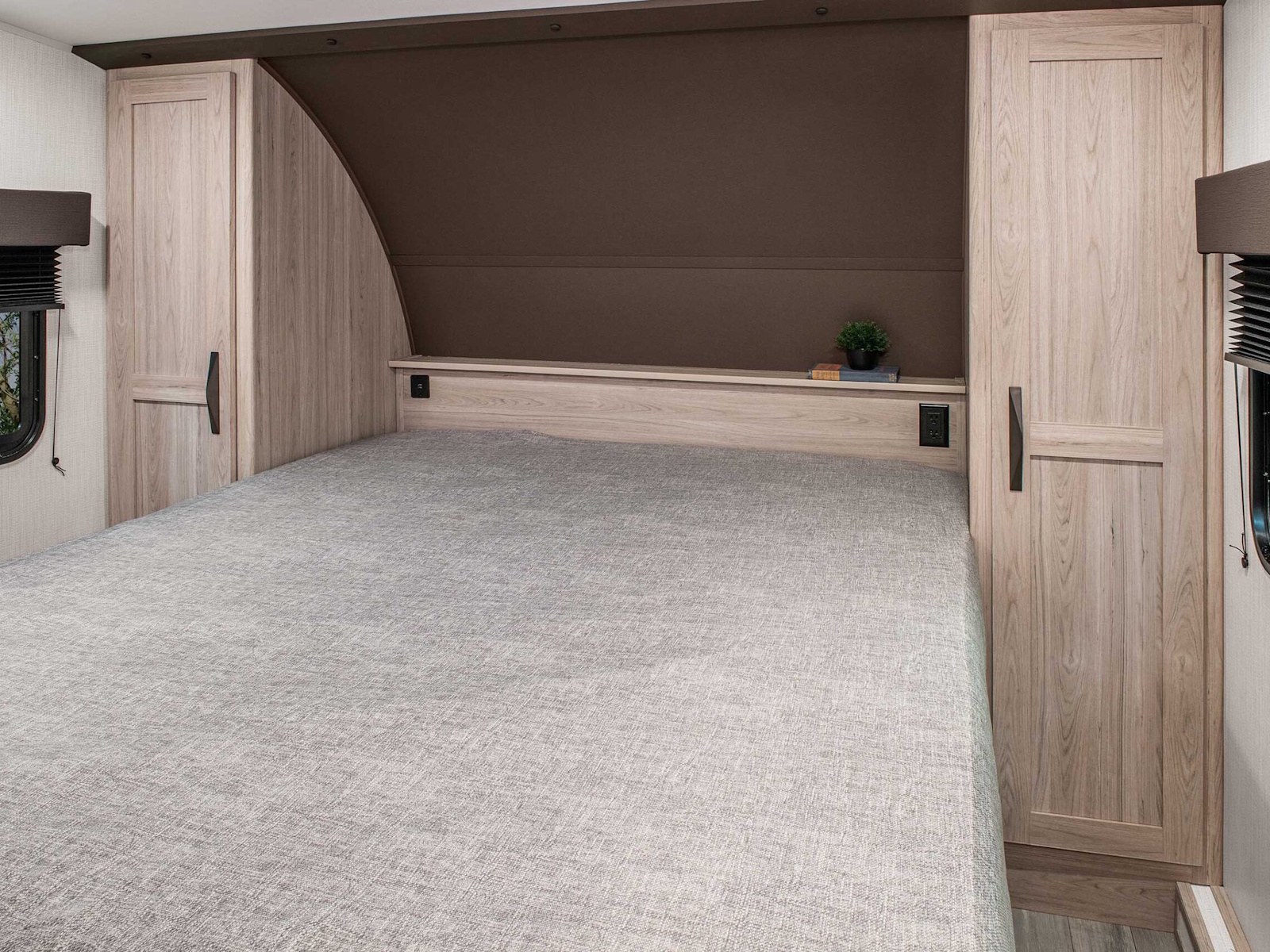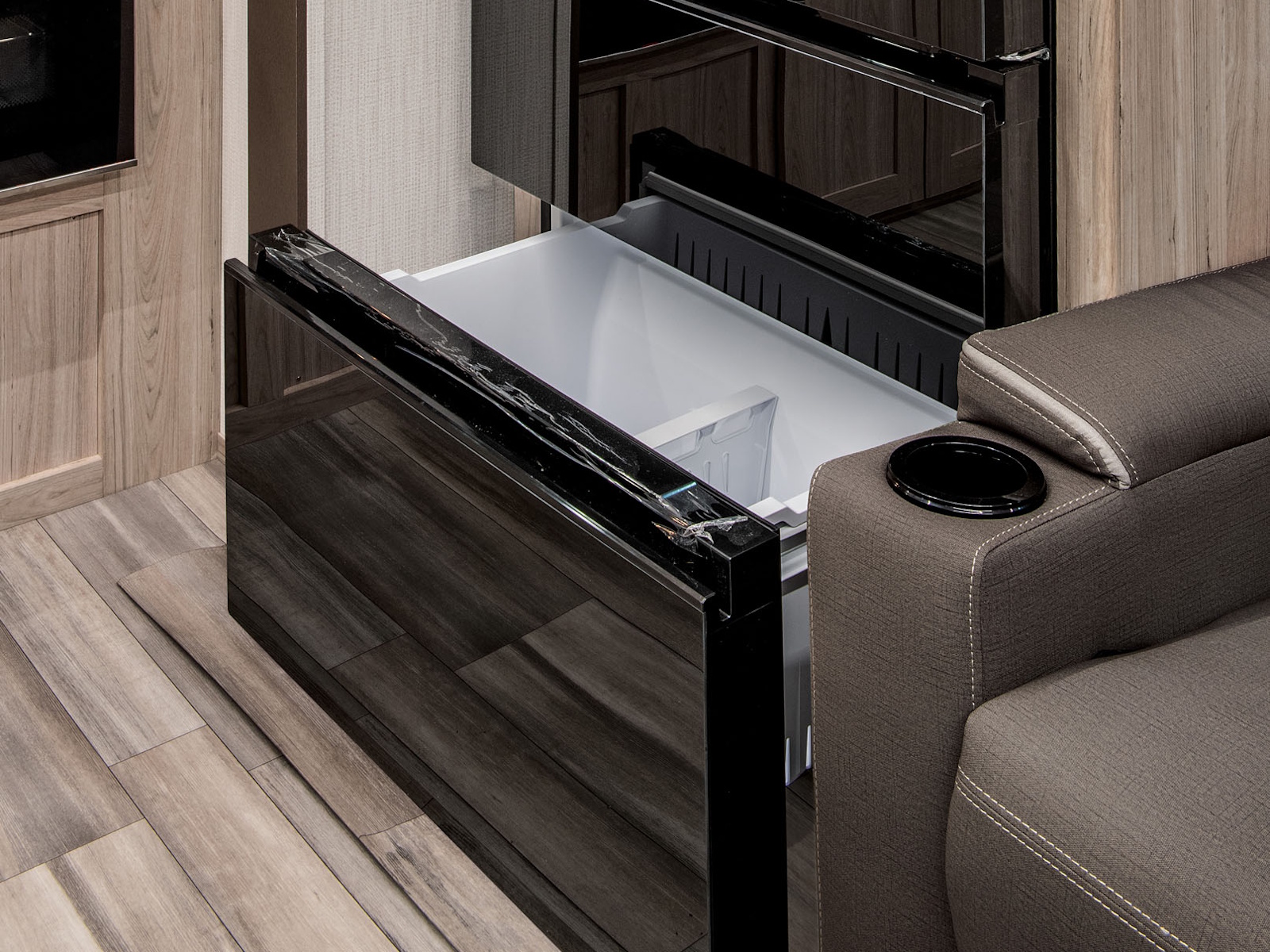 Welcome to the lighter side of luxury in the RV world. Essence, our newest masterpiece, has been meticulously designed to offer you an unrivaled experience on the road. With a keen focus on your comfort and convenience, Essence boasts an abundance of features that will transform your journeys into unforgettable adventures. Step inside to find a world of elegance, from top-quality furnishings to carefully selected finishes, to solid surface kitchen top is not only exquisite but also highly functional, providing you with the perfect space for culinary creativity. We’ve also thought about storage. The Store More bed base is an innovative solution that maximizes your space, ensuring you can bring everything you need on your journeys.