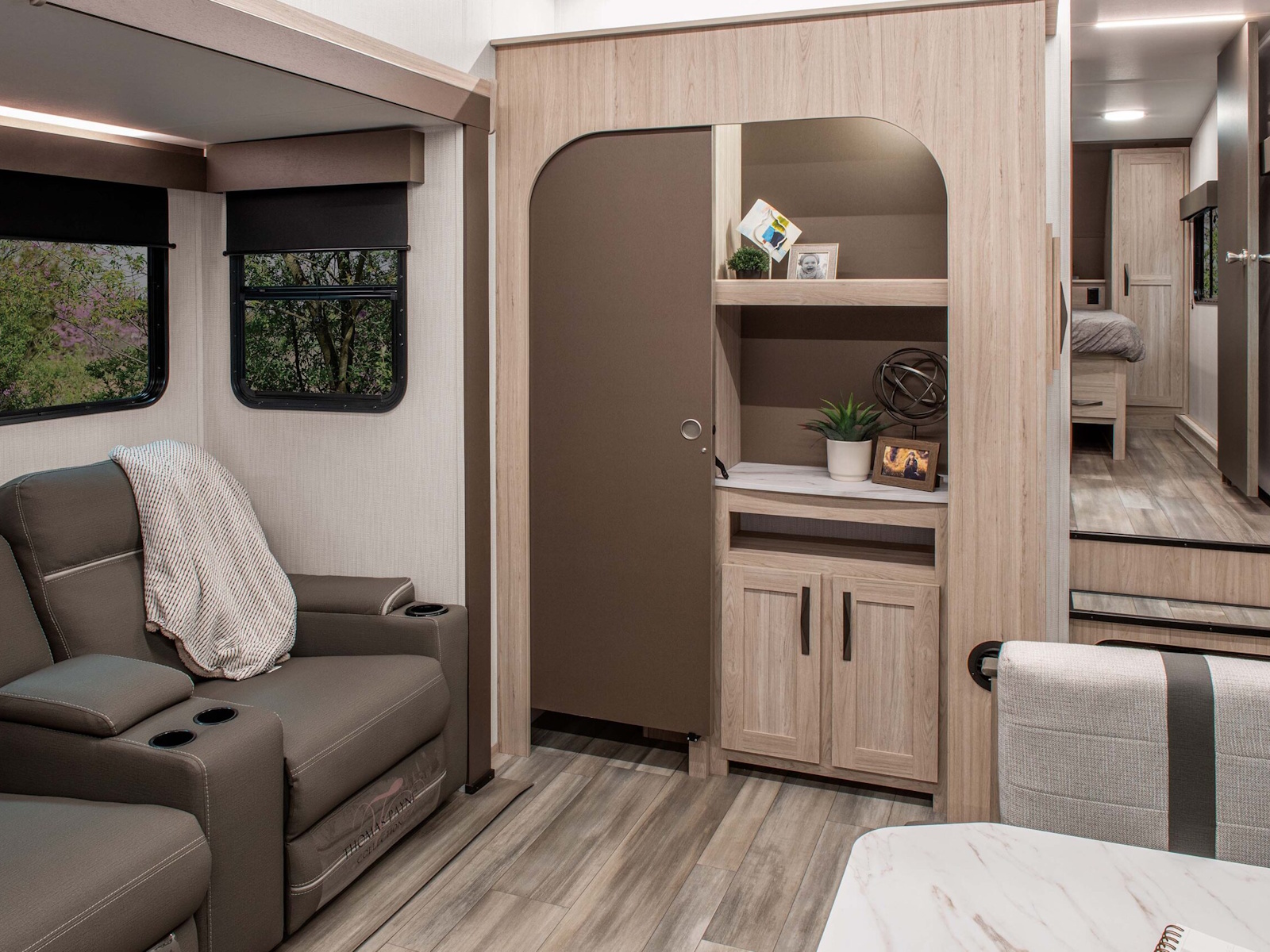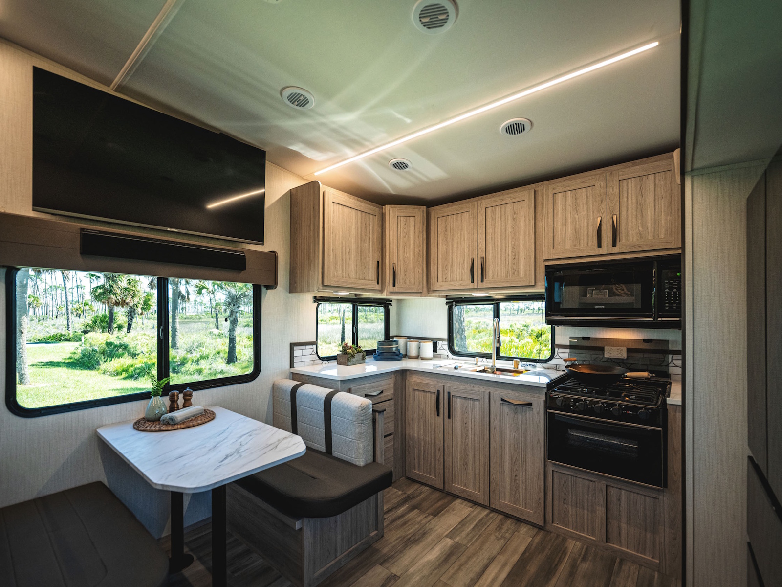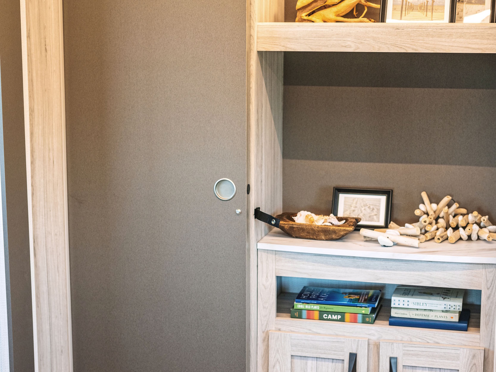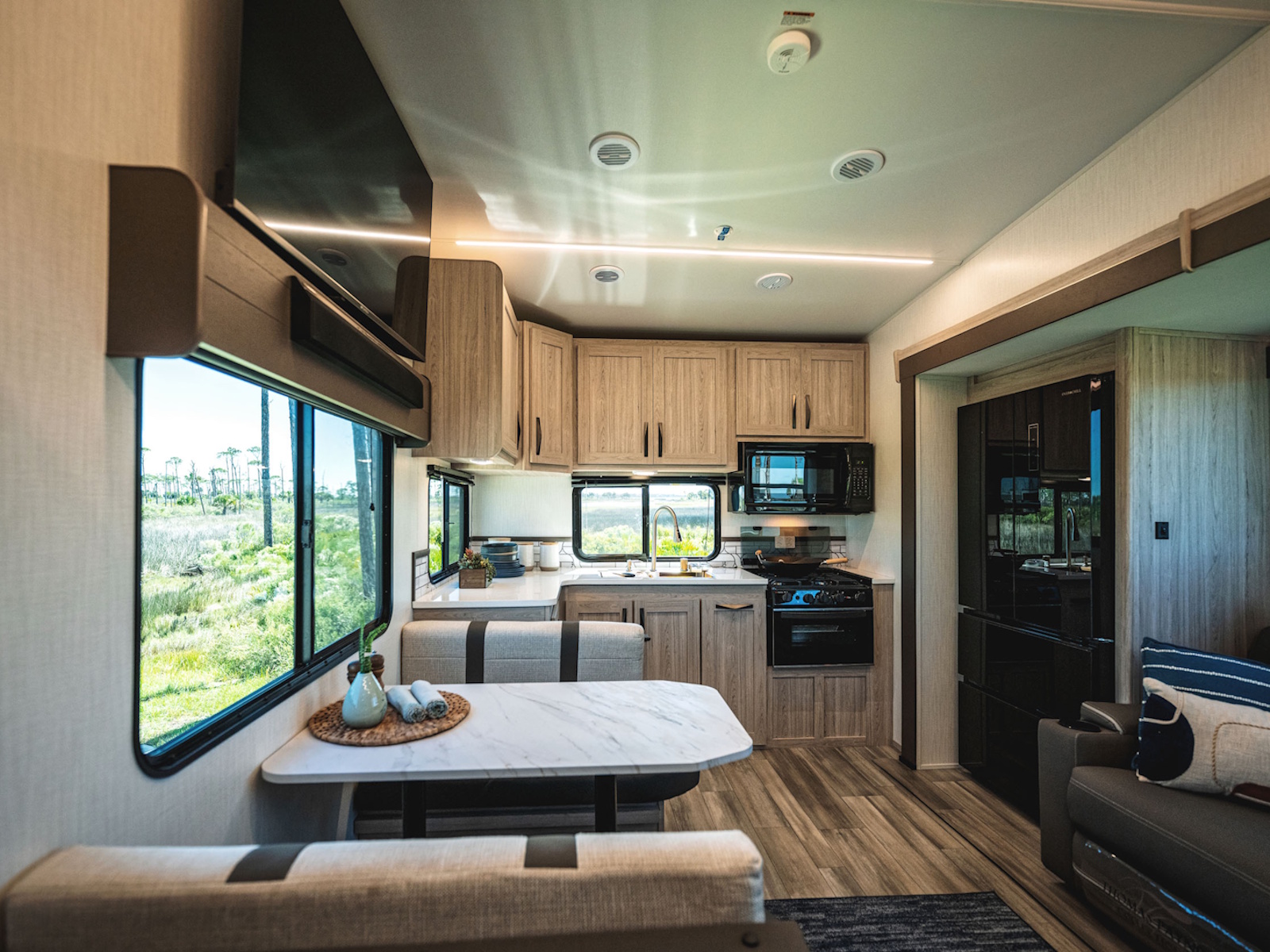 Welcome to the lighter side of luxury in the RV world. Essence, our newest masterpiece, has been meticulously designed to offer you an unrivaled experience on the road. With a keen focus on your comfort and convenience, Essence boasts an abundance of features that will transform your journeys into unforgettable adventures. Step inside to find a world of elegance, from top-quality furnishings to carefully selected finishes, to solid surface kitchen top is not only exquisite but also highly functional, providing you with the perfect space for culinary creativity. We’ve also thought about storage. The Store More bed base is an innovative solution that maximizes your space, ensuring you can bring everything you need on your journeys.