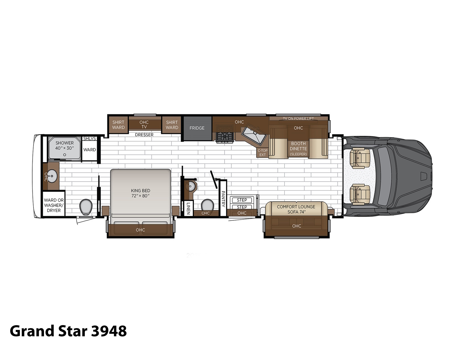 The 2026 Grand Star is a revolutionary and approachable Super C that caters to everyone from first-time RVers to families and empty nesters. Find the floor plan for you below.