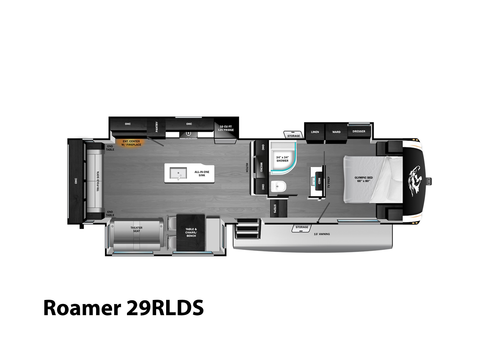 From campgrounds to coastlines, the Roamer Fifth Wheel is built to take your adventures further. Its durable TuffShell™ laminated walls and fully walkable 5" ForTruss rafter roof deliver lasting strength and accessibility. Standard Xtend Solar I package with a 200-watt panel and 30-amp controller powers your lights and refrigerator off-grid, while the on-demand tankless water heater provides endless hot showers in a spacious bathroom with a skylight for extra headroom. In the kitchen, you’ll find everything you need—21” range, 30” microwave with exhaust fan, 12V refrigerator, and a black stainless sink—making meal prep easy. Comfort comes standard with the Cool Force system and Thermal Seal™ weather package, combining dual-duct A/C, oversized return vents, radiant barrier insulation, and a 35,000 BTU furnace to keep you cozy in any season. Whether off-grid or at your favorite campground, the Roamer Fifth Wheel blends strength, efficiency, and comfort for every journey.