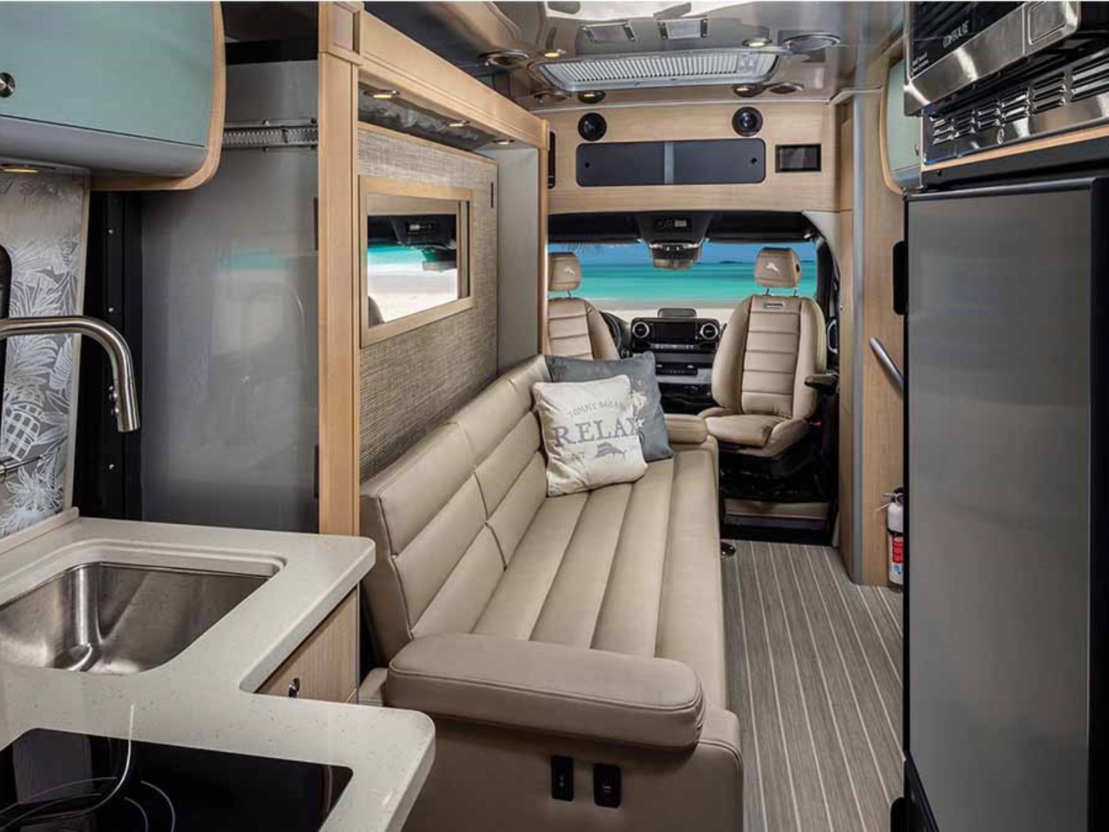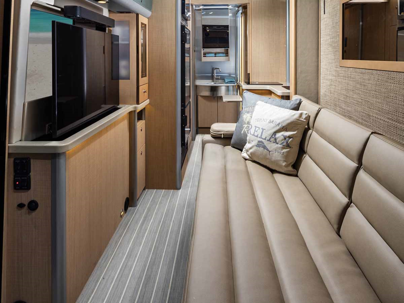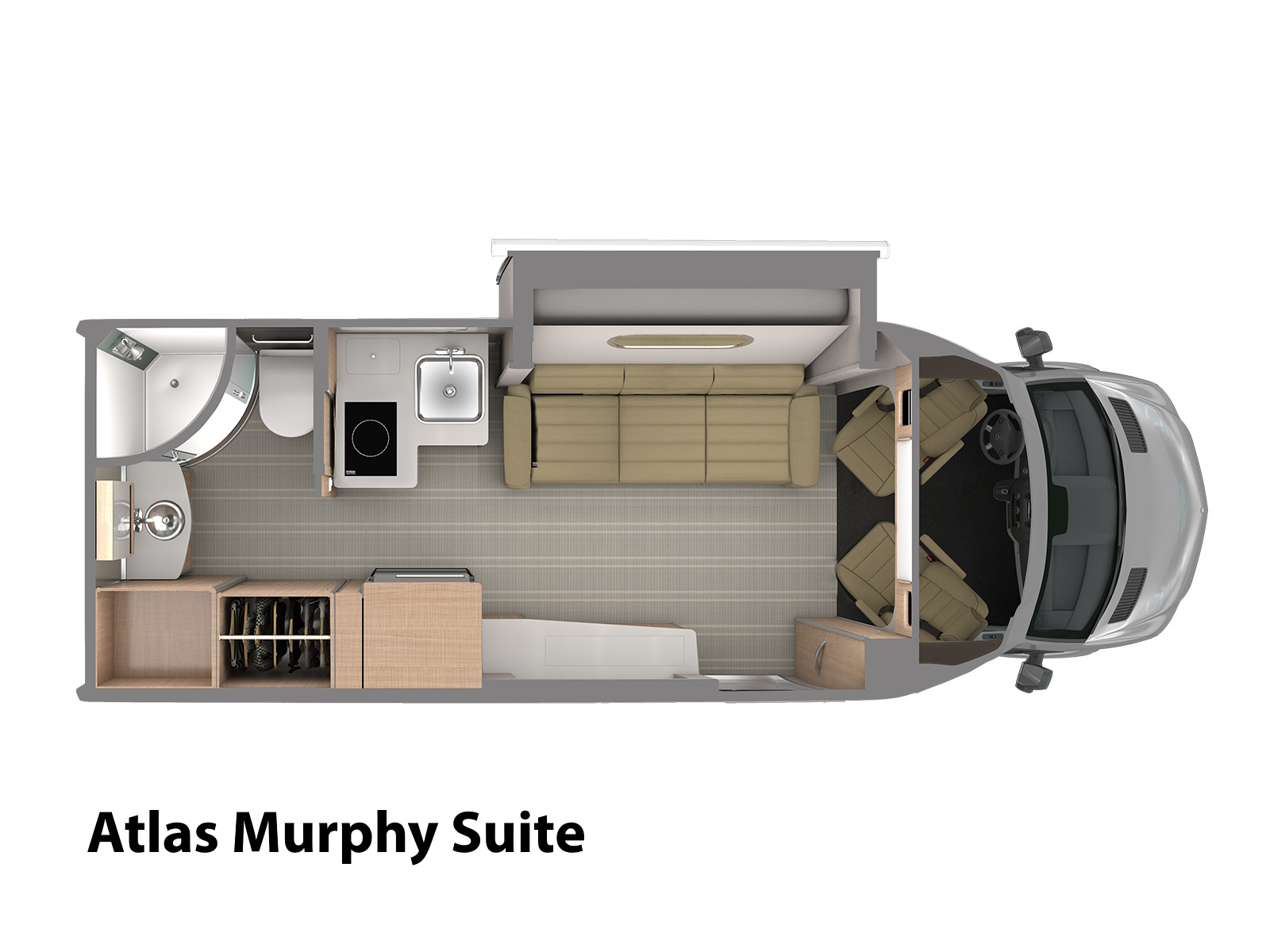 Whether you’re tailgating, entertaining friends, or just having a movie night, the Atlas’ 40” LED Smart TV with a built-in sound bar is perfect. When you’re not using it, it stays tucked inside the entertainment cabinet under the Corian countertop. Then, you simply push a button and it rises into position, right across from the sofa or Murphy bed.