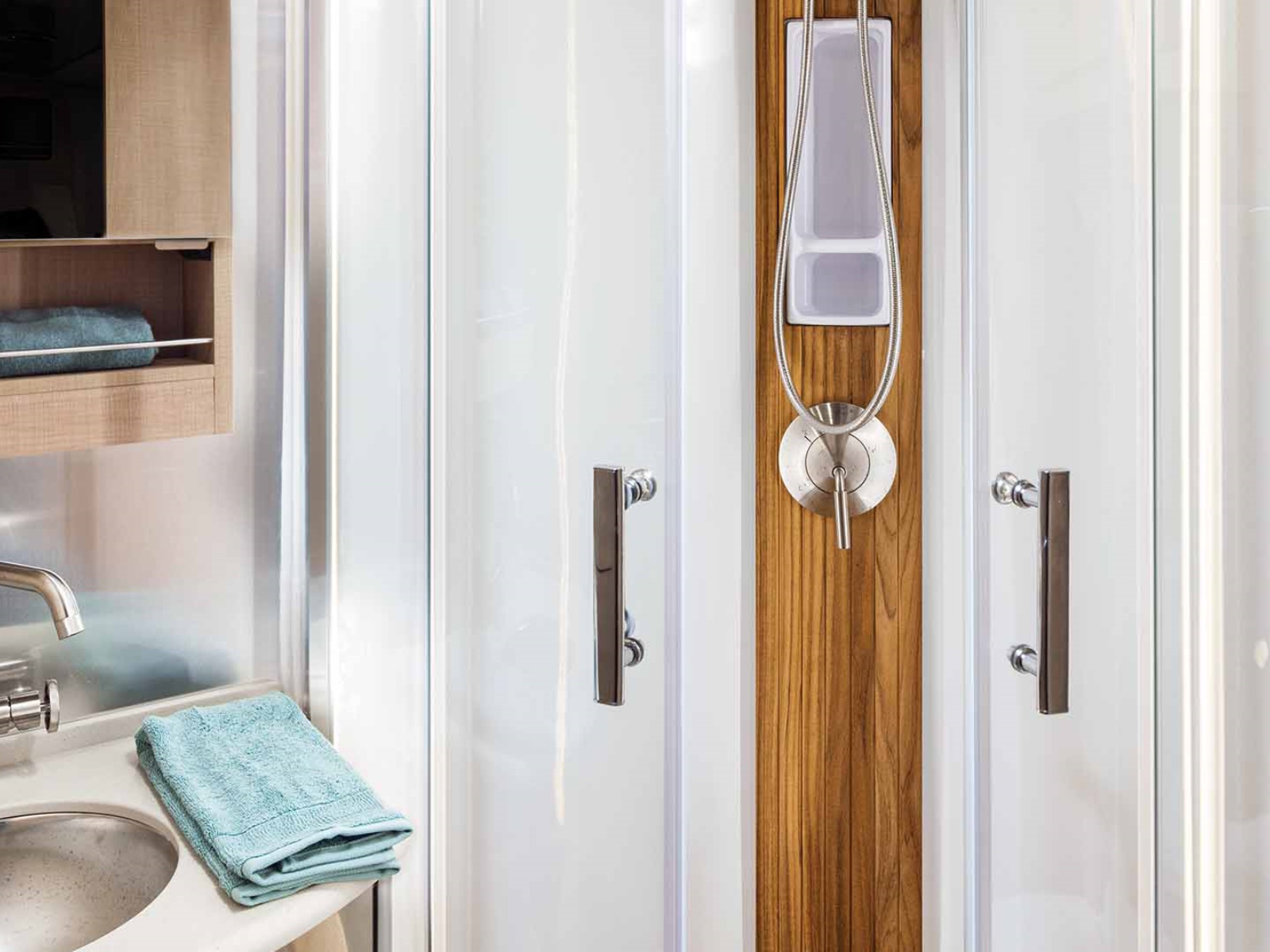The spacious Atlas bathroom is a stand-out. Behind a pocket door is a three-piece, residential-style layout that spans the rear of the coach. The shower features teak inlays and Kohler® stainless steel fixtures, and a tankless water heater provides as much continuous hot water as you like. Plus, hanging closet storage and drawers for your folded clothes all live inside the bathroom, so everything you need to get dressed and ready is in one place.