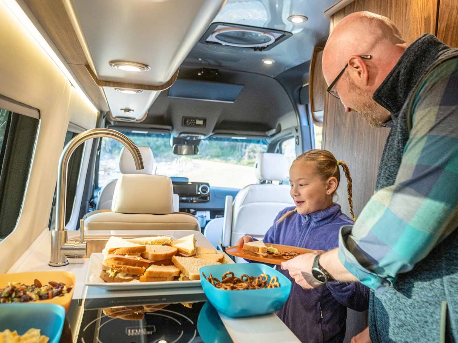 The onboard bathroom makes road trips and tailgating that much more enjoyable, with the freedom to stop whenever you want and have everything you need with you. The European-style space neatly houses a sink, shower, and toilet, plus a built-in shampoo, conditioner, and body wash station and a clothesline.
