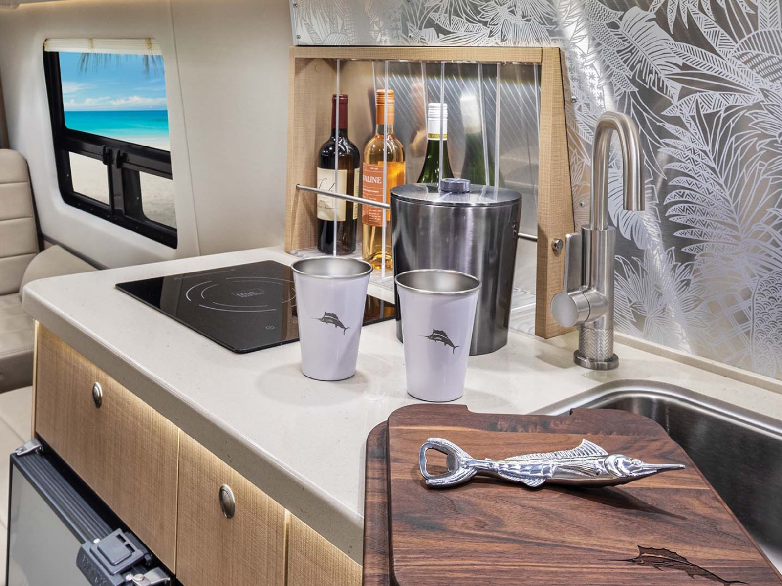 The onboard bathroom makes road trips and tailgating that much more enjoyable, with the freedom to stop whenever you want and have everything you need with you. The European-style space neatly houses a sink, shower, and toilet, plus a built-in shampoo, conditioner, and body wash station and a clothesline.