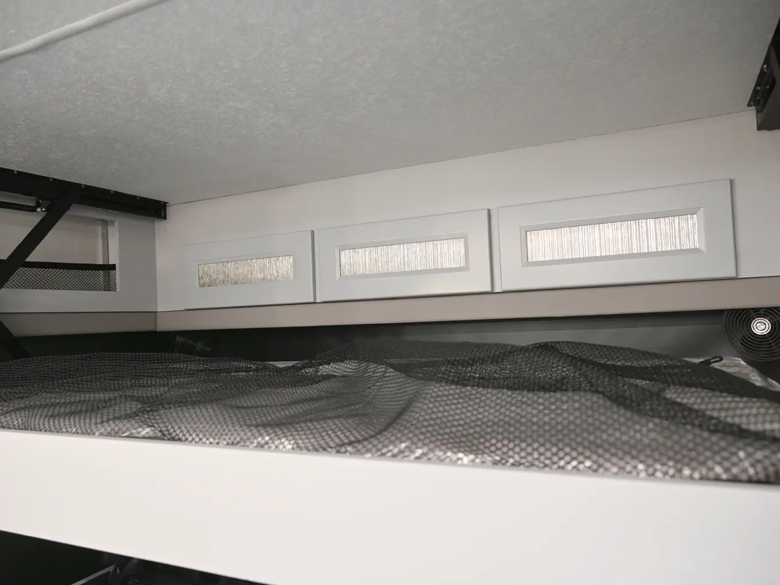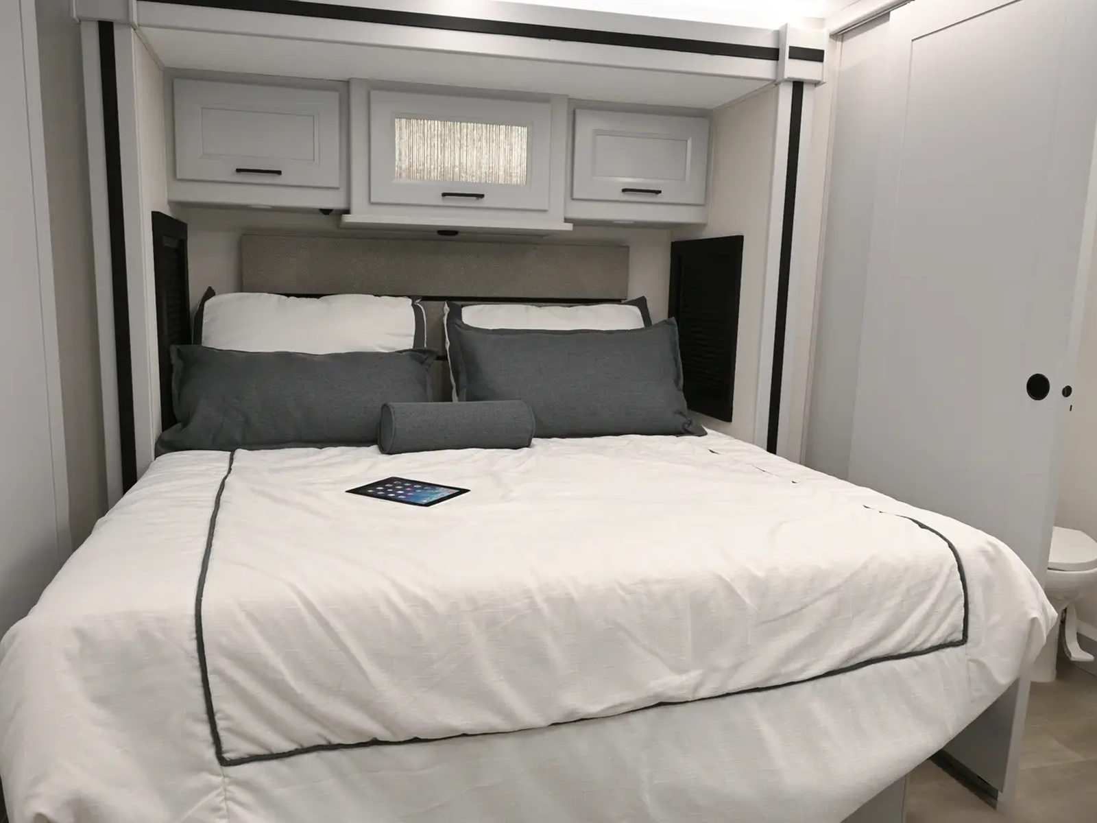 The interior of the Encore Class A Motorhome is engineered for maximum comfort. Spacious and stacked with amenities, it has everything you need to relax and recharge. That includes stainless steel appliances, 15,000 BTU ACs, king bed, drop down cab-over bunk, and more standard features than ever before.