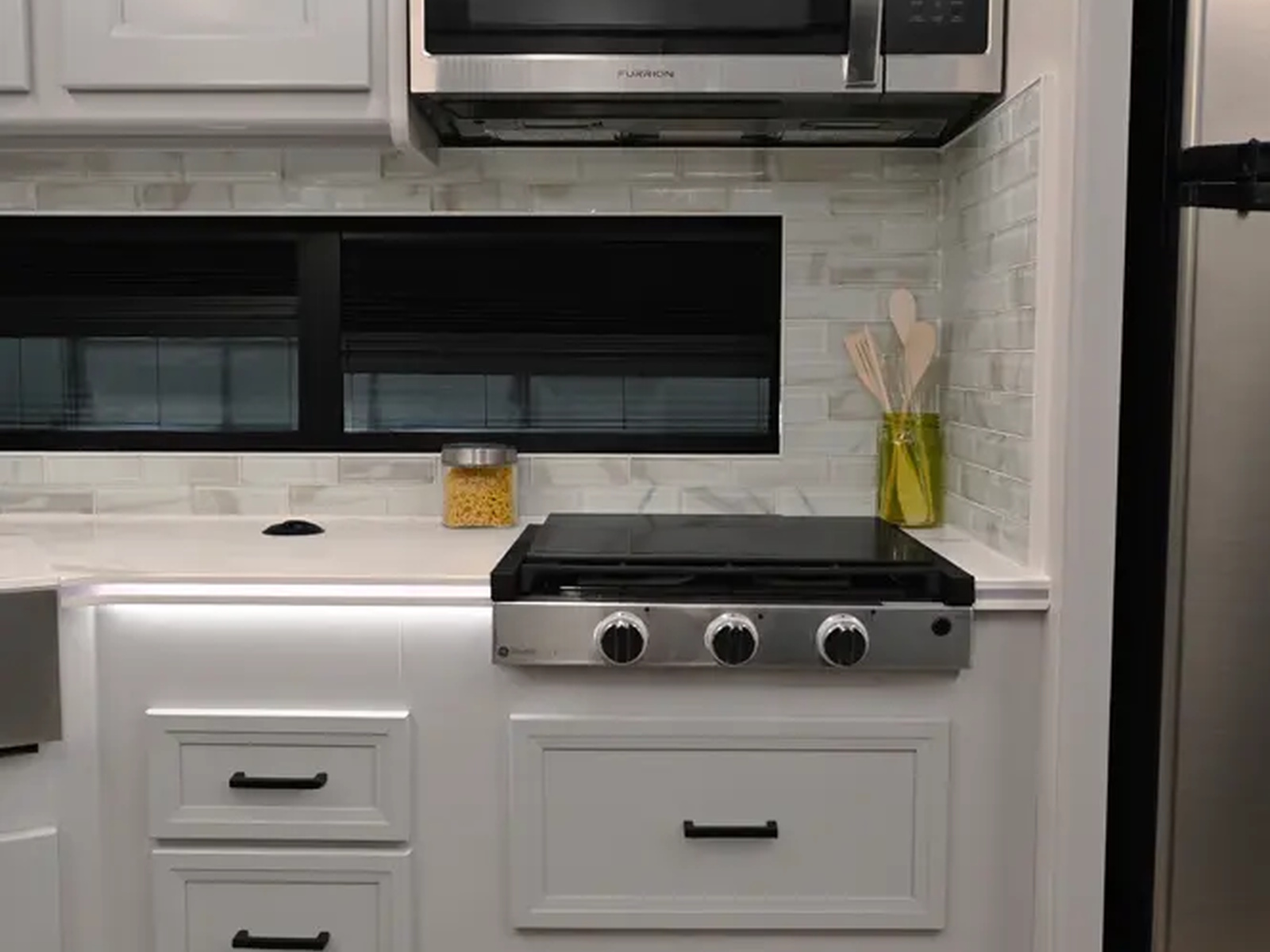 The interior of the Encore Class A Motorhome is engineered for maximum comfort. Spacious and stacked with amenities, it has everything you need to relax and recharge. That includes stainless steel appliances, 15,000 BTU ACs, king bed, drop down cab-over bunk, and more standard features than ever before.