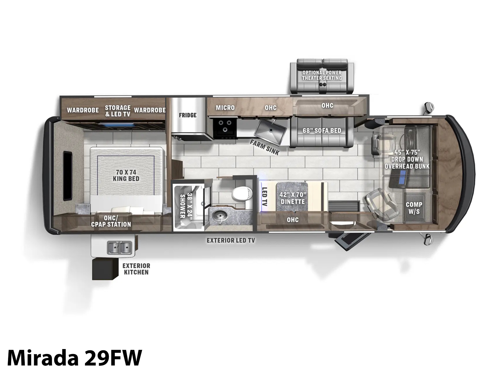 At 30' 7", the Mirada 29FW delivers a compact Class A experience built for scenic highways and weekend getaways. With a comfortable king bed, full galley, and efficient layout, this rig offers the freedom to explore forests, lakesides, or coastlines while still enjoying high-end comfort and smooth drivability.