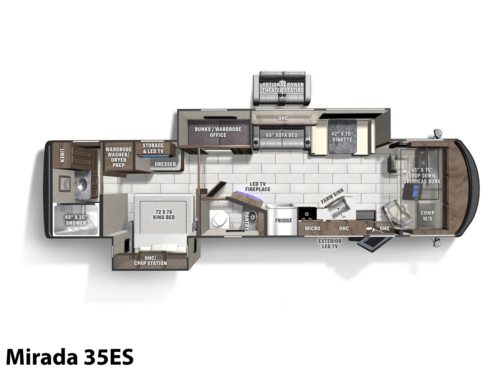 The Mirada 35ES is designed for travelers who want a powerful, feature-rich coach with plenty of space. Its mid-body slide gives a roomy living area that’s ideal for gathering friends or enjoying solo downtime. With high-capacity water systems and strong power, this model supports highway touring, park-hopping, or cross-country escapes in style.