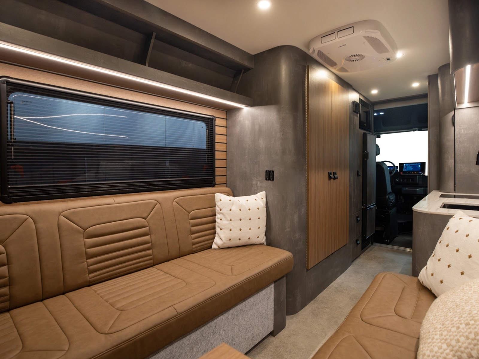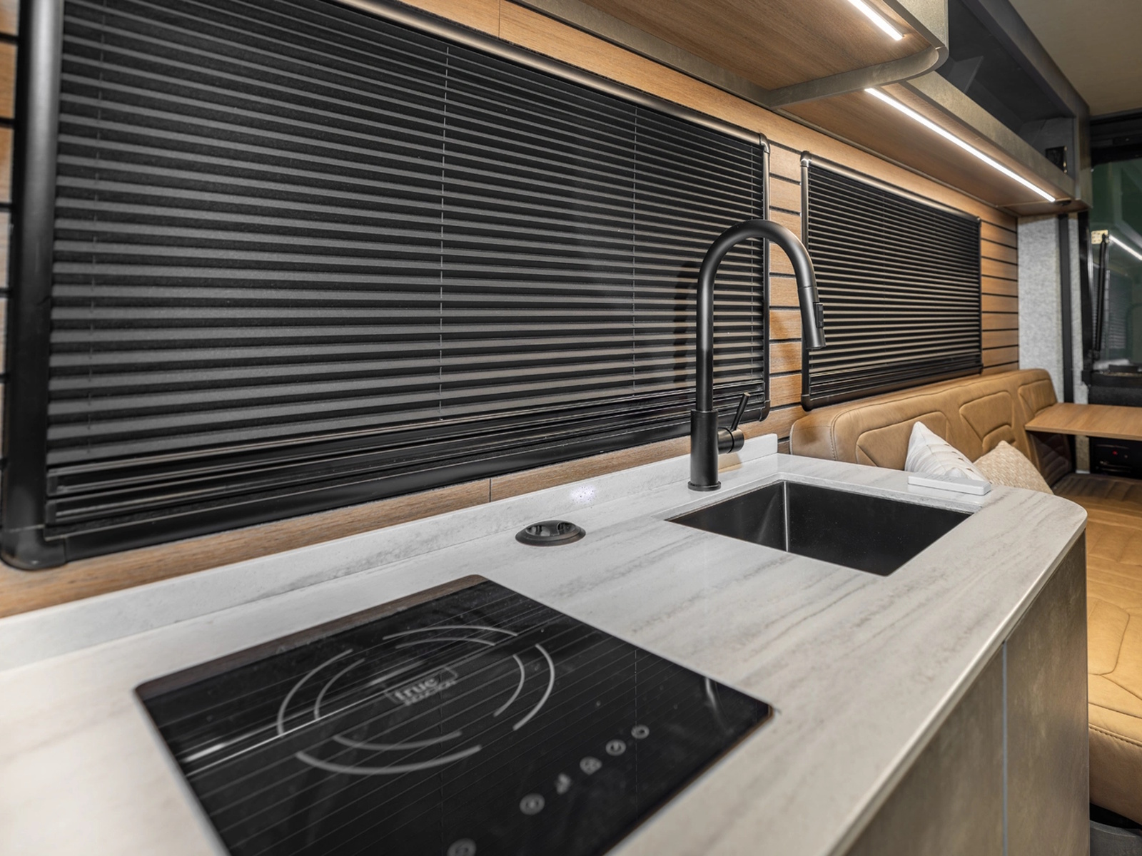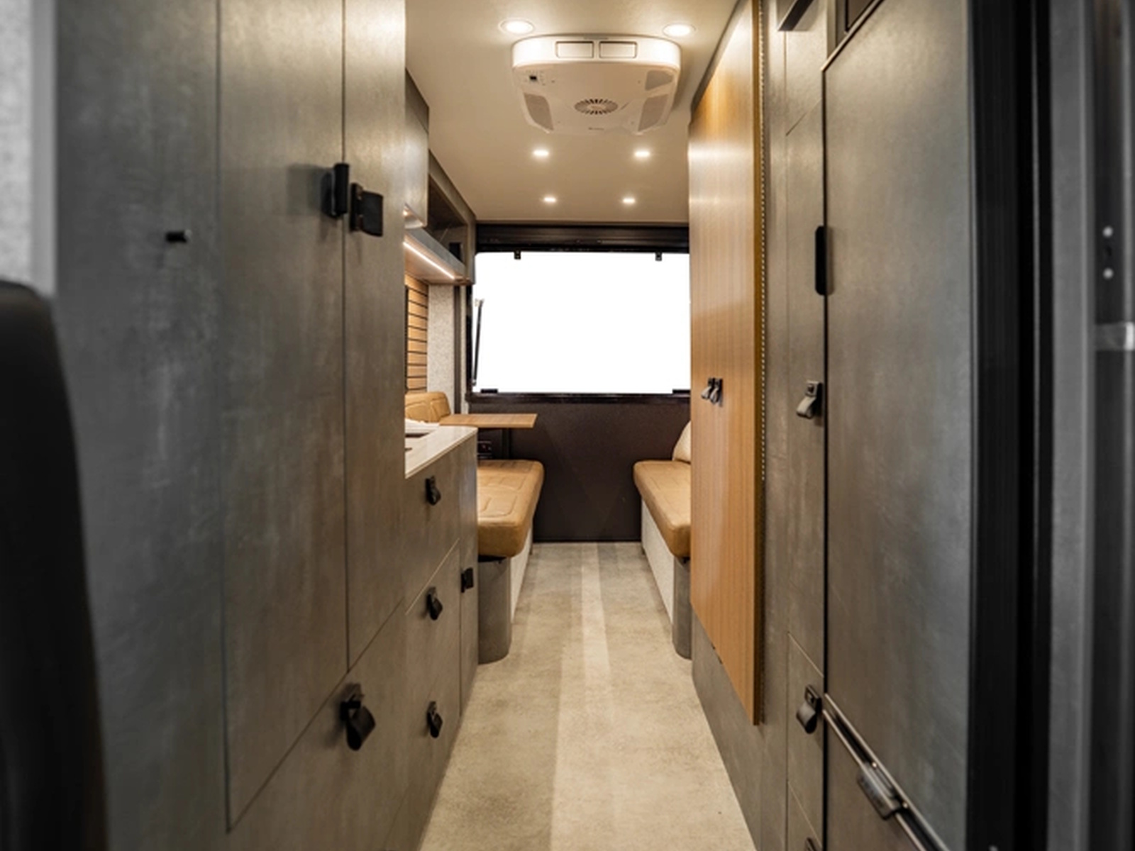 Aerodynamic exterior styling paired with aftermarket rims creates a sleek, aggressive presence on the road. Underneath, advanced construction materials like G-Strong panels and lightweight Lisocore cabinetry reduce weight while increasing durability and thermal performance. Less weight means longer range, greater efficiency, and more freedom to go off-grid with confidence.