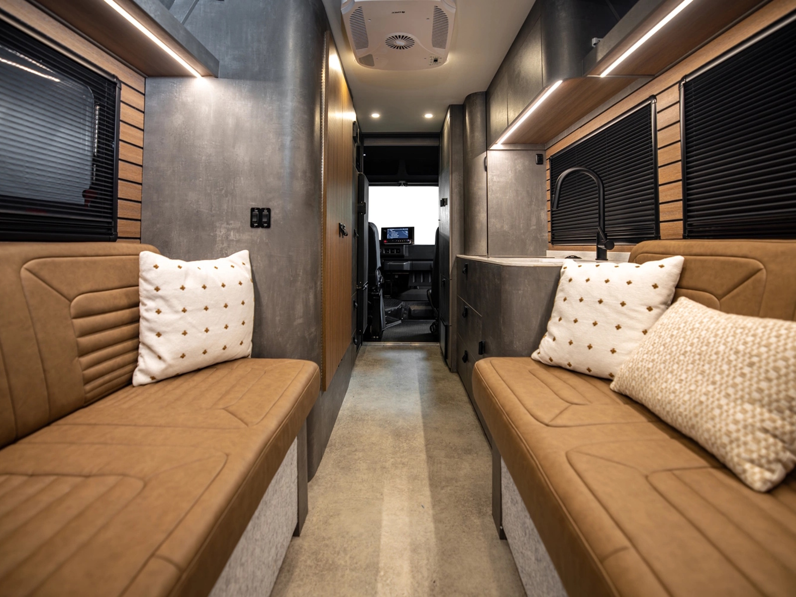 Crafted with precision and driven by purpose, the RVEX delivers up to an estimated 270 miles of all-electric range on a single charge. It is engineered for explorers who want to experience the wild without compromise, powered by a cutting-edge lithium battery system and a 1,000-watt solar array that keeps the adventure moving far beyond the pavement. Inside, luxury meets utility with a premium interior that adapts effortlessly from day to night. Twin sofas convert into beds, maximizing space and comfort after a day spent chasing views. Large rear access with tailgate design makes loading bikes, boards, or gear fast and seamless, opening the cabin to the sights and sounds of nature. Every detail is built to enhance time outside, not distract from it.