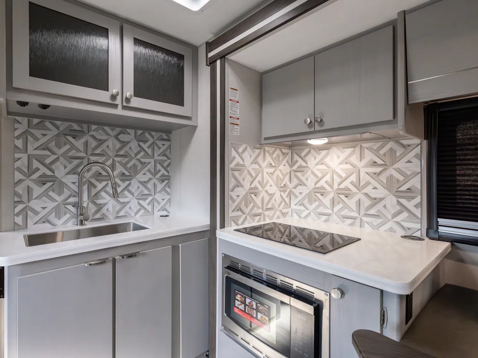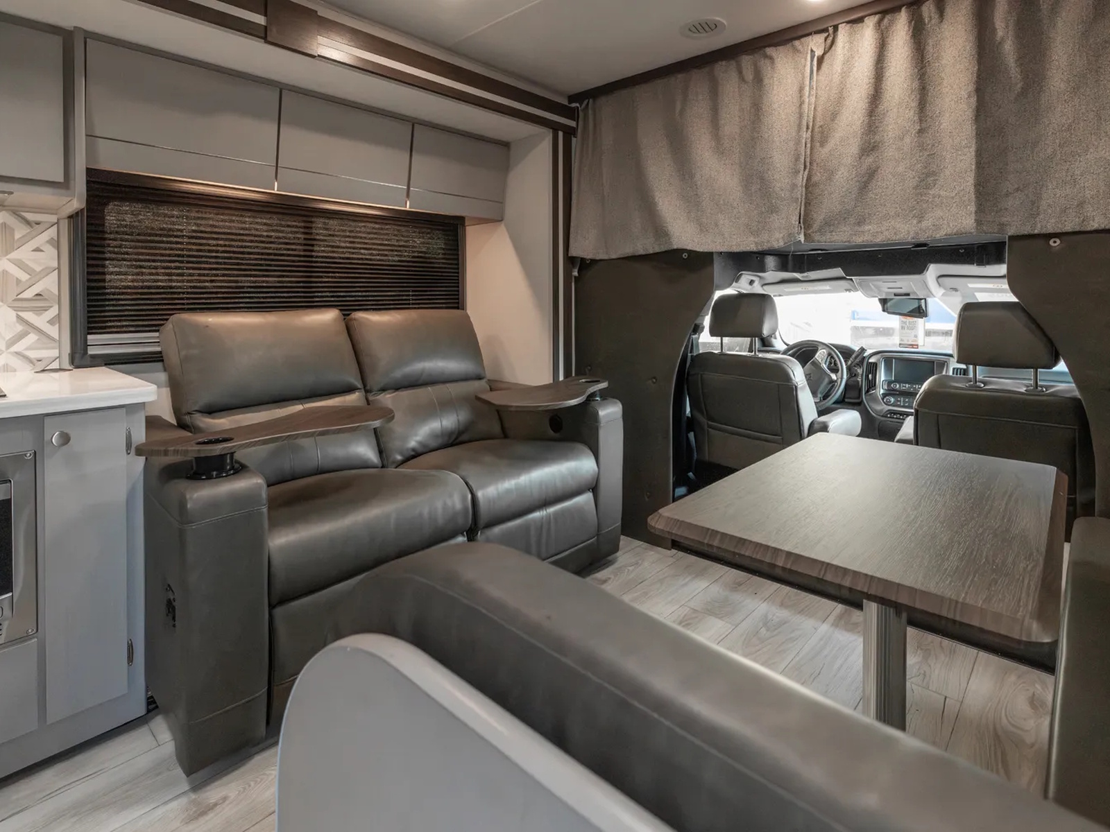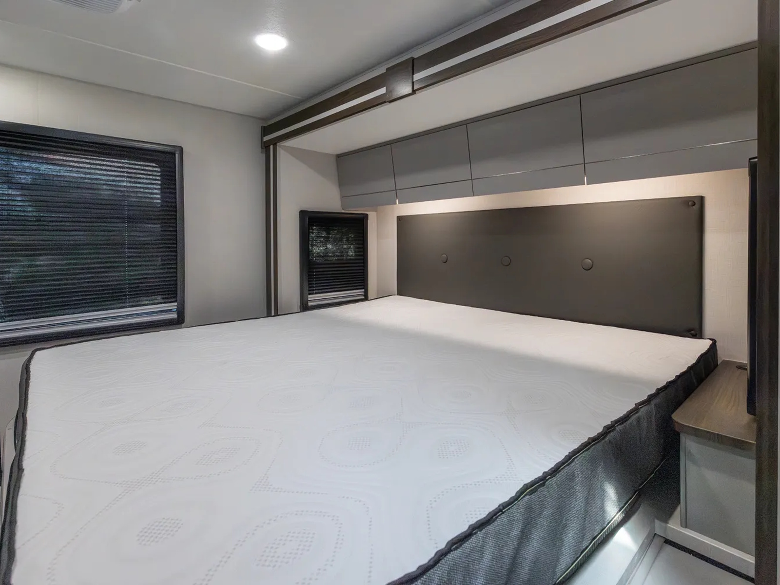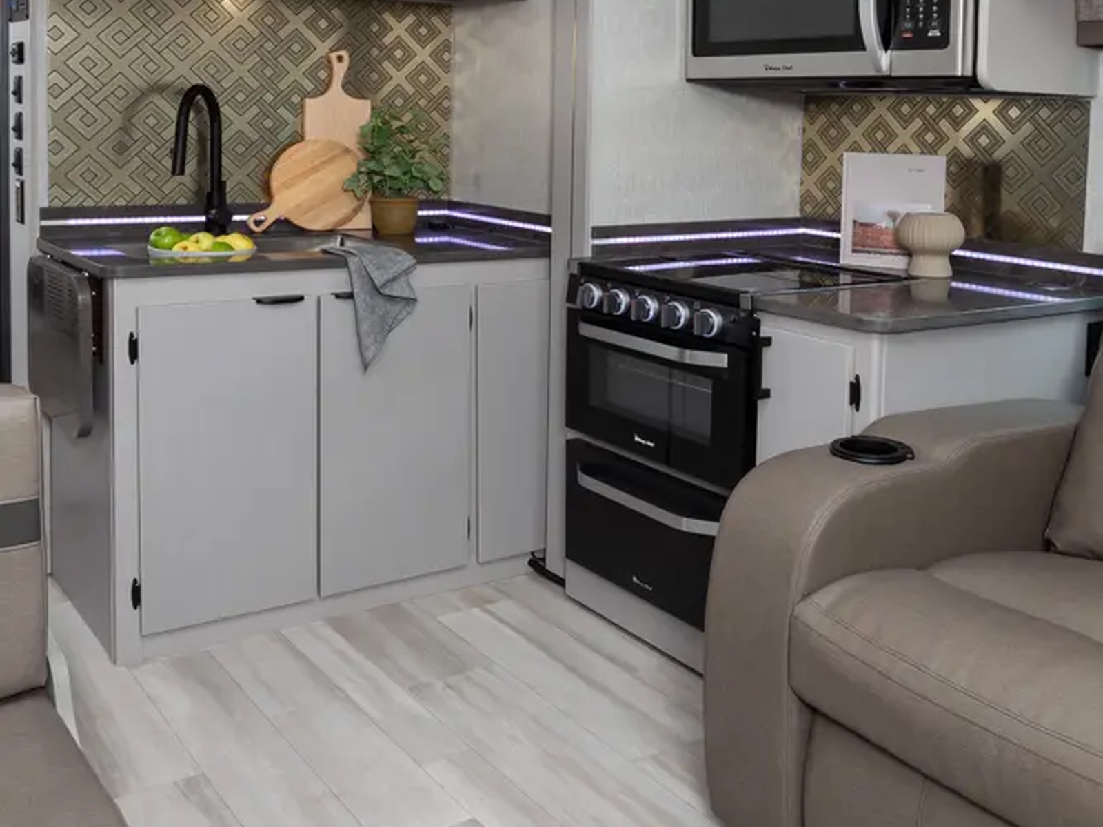 The 330DS bedroom features a 72" X 80" walk-around King bed with power incliner, large dual wardrobes and multiple drawer storage. The bedroom is prepped for an optional washer/dryer combo. The 90-degree wrap-around kitchen design comes with ample countertop space, residential-style over-the-range convection microwave and 10 cu. ft. 12V refrigerator. The living/dining area features opposing side seating with theater seating and J-Lounge dinette/sofa/sleeping area.