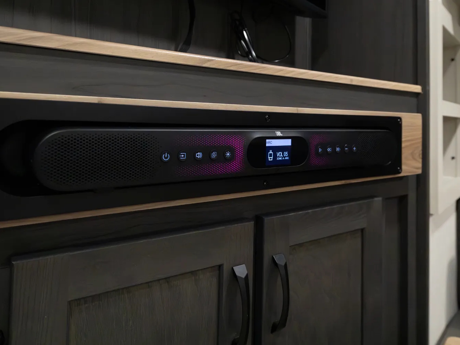 - Upgraded Carbon & Walnut Ent. Center W/ JBL® Soundbar Including AM/FM & Bluetooth®