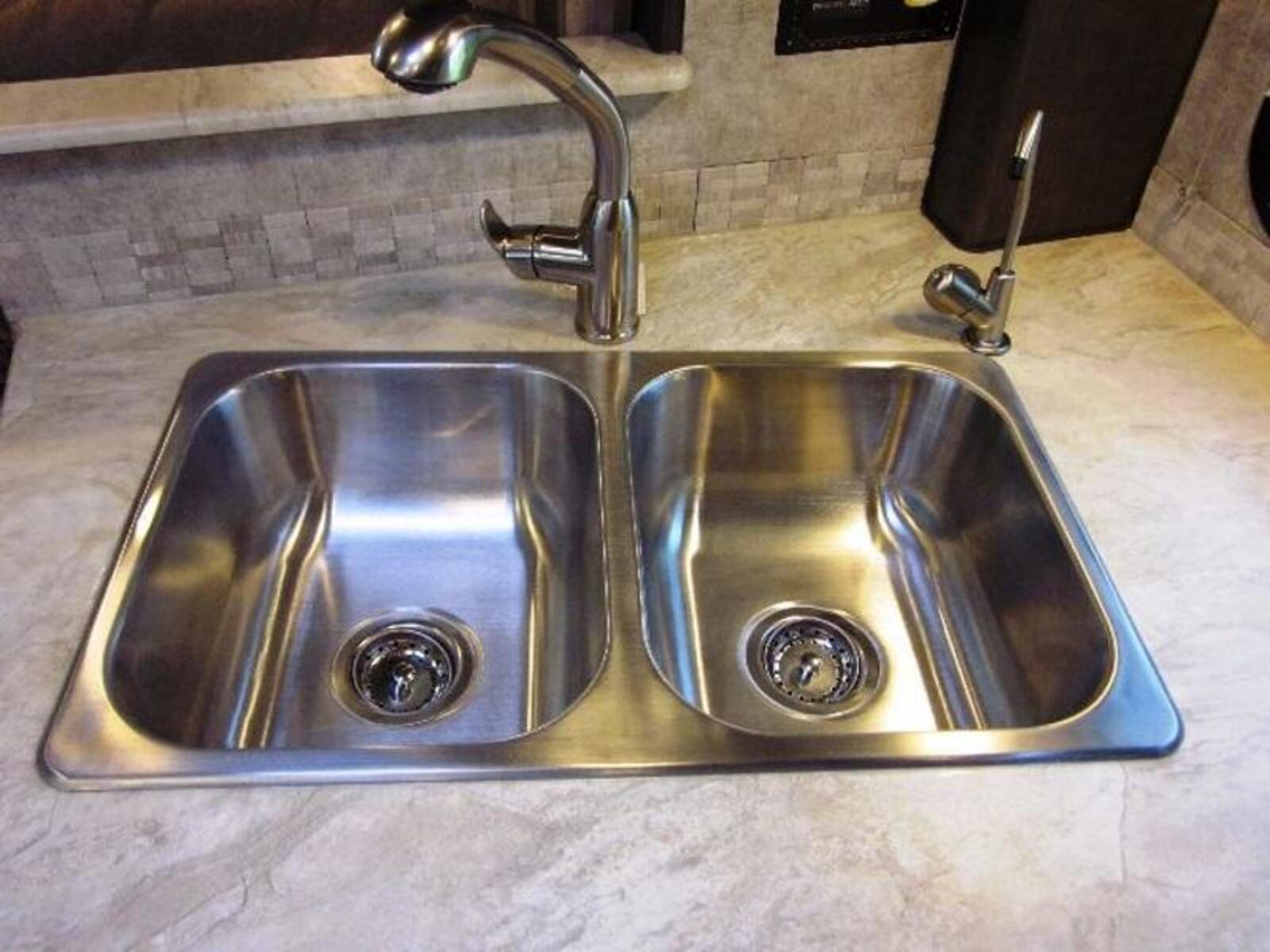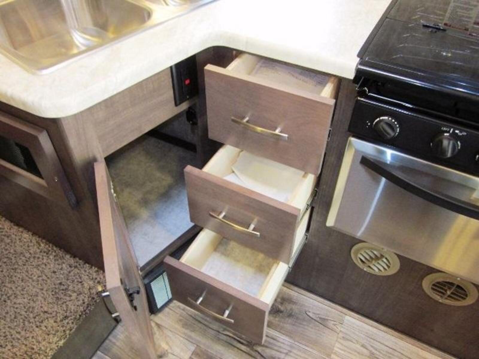 The Galley includes the 30" Micro/Convection oven standard, the largest galley countertop in a truck camper along with pull out pantry storage, three large storage drawers and a very large under sink storage below your solid surface Grani-Coat countertops with one-piece moulded sinks. The 1200 comes standard with an 8cu ft refrigerator giving you a galley you are going to love in your new luxury truck camper!