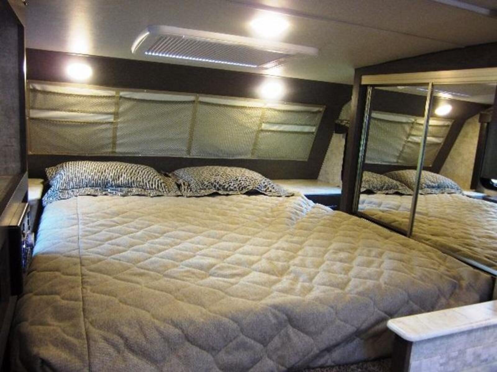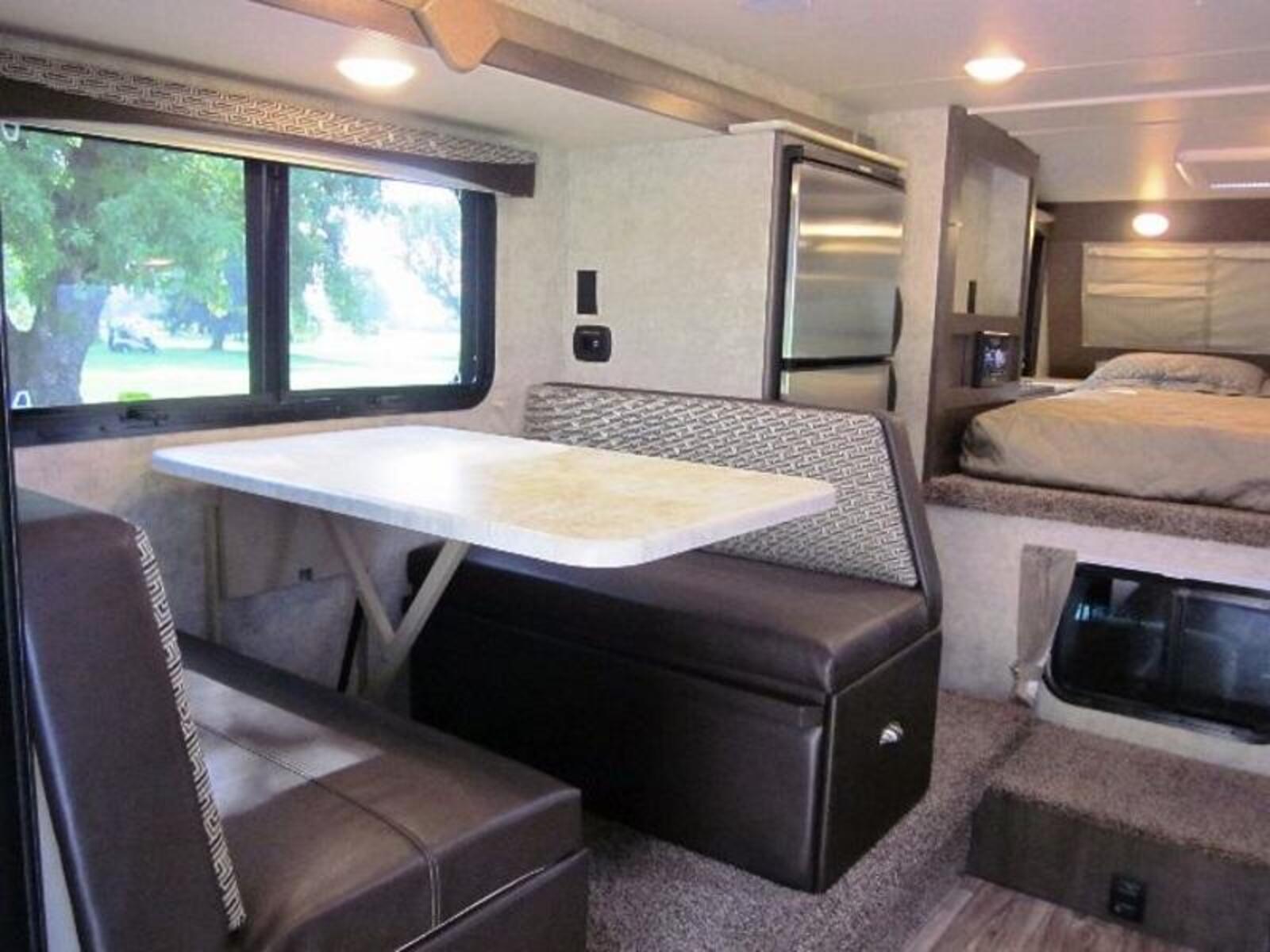 The 1200 features many industry and truck camper firsts, like a free standing table and chairs like you see in luxury motorhomes and 5th wheels, large center drybath with a private dressing room giving you the largest bath/dressing area of any truck camper. Include the large double door wardrobe with 4 large dresser drawers & adjustable shelves you will meet all of your storage needs. The California King Bedroom suite features dual side access to both sides of the bedroom area and once in the bedroom you will notice another truck camper first, the 72"x 84" California King Bed with king size underbed storage.