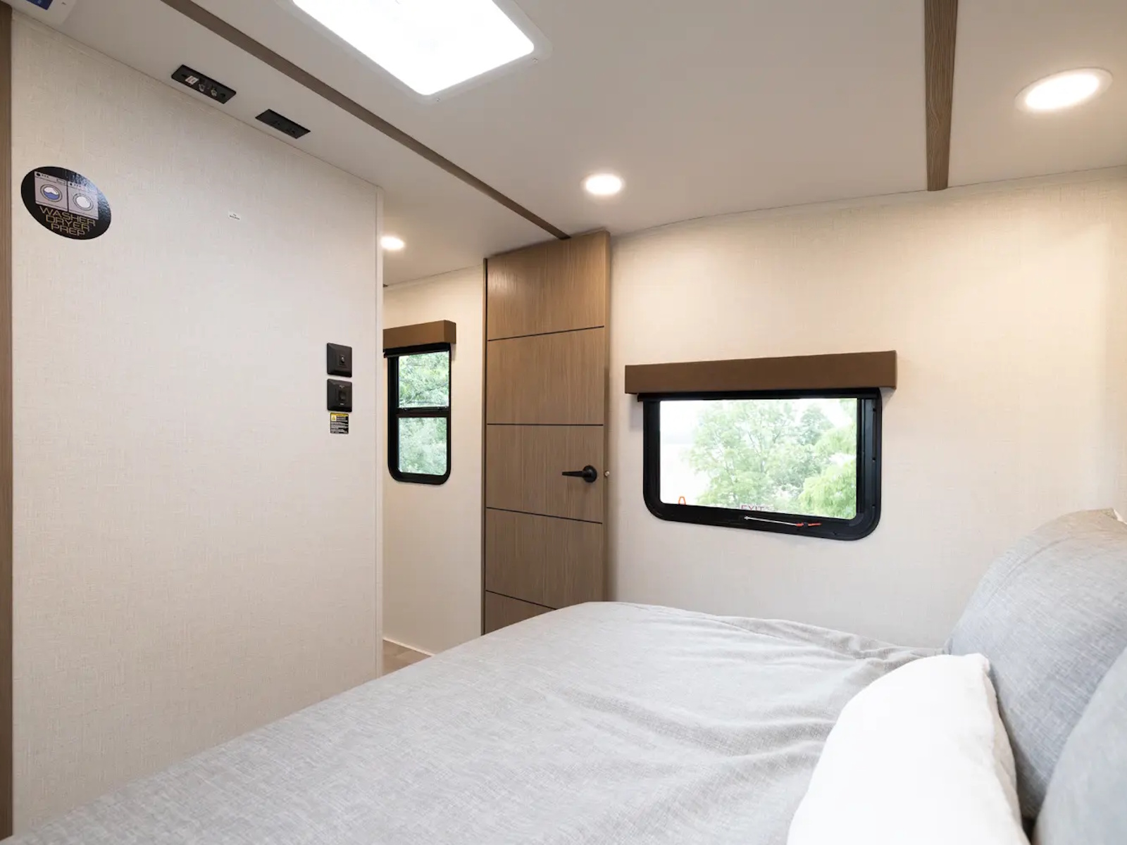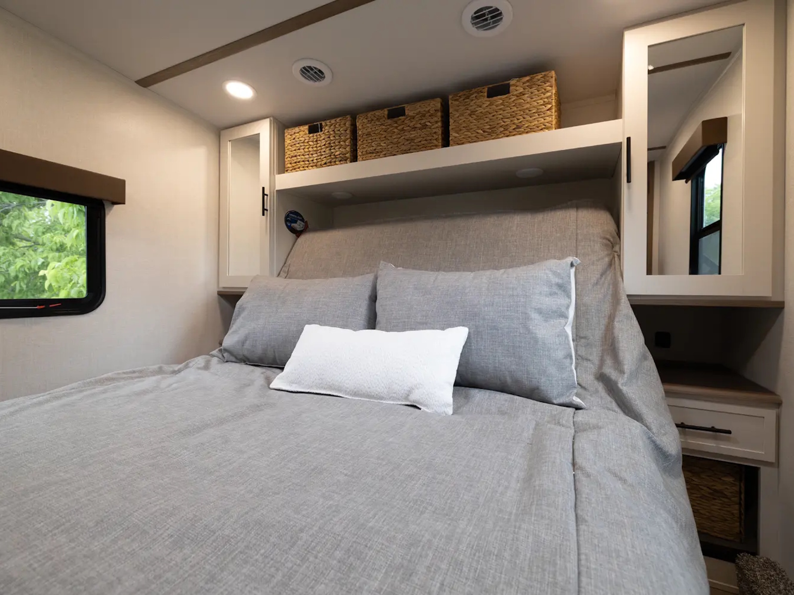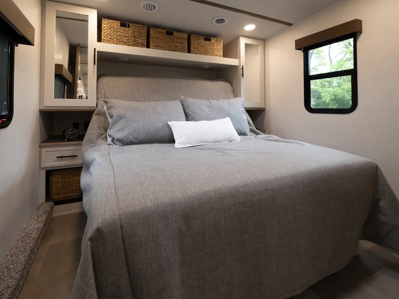 Versa–Tilt Automated Bed Incliner | 6 ft 3 in Bedroom Ceiling | 60 in x 80 in Queen Mattress with Residential Bedspread & Pillows | 72 in x 80 in King Mattress with Residential Bedspread & Pillows | 110 Outlet & 12V Charging Ports Beside Bed