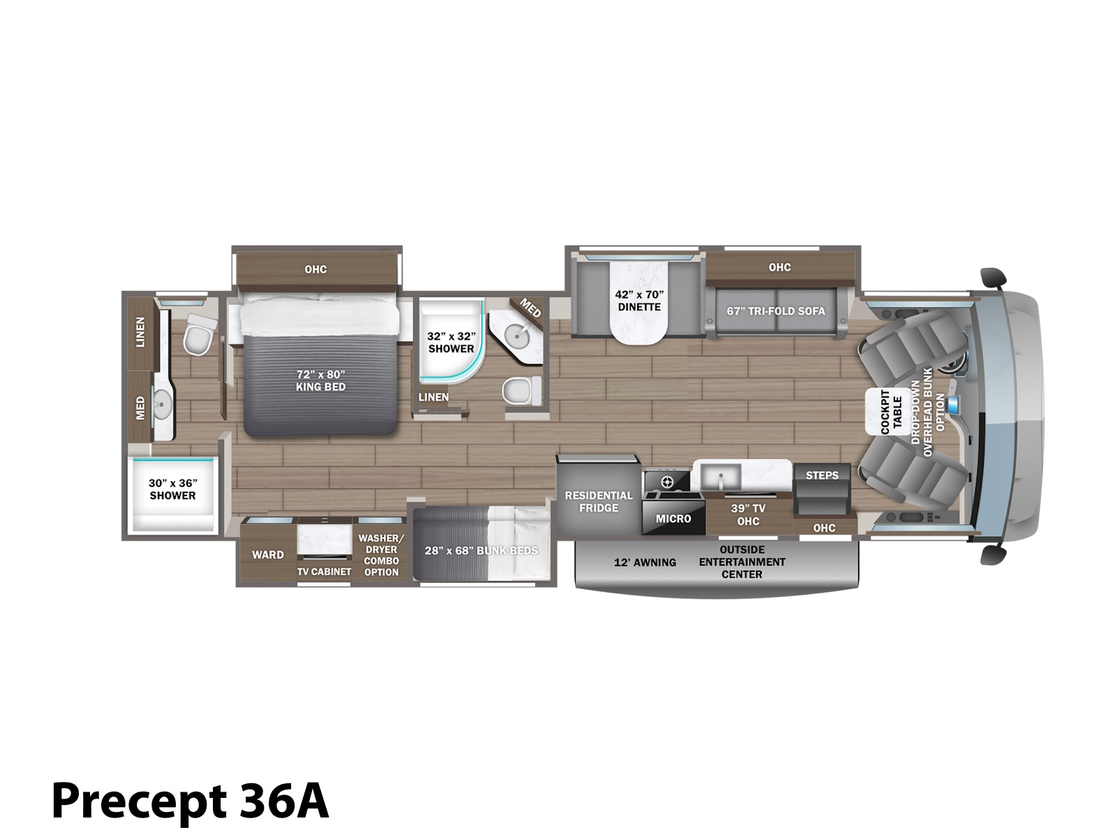 The Precept doesn’t just drive great—it looks great too! The one-piece seamless front cap features sleek accent lighting and bold LED headlights for increased visibility and a polished look. Add in the largest windshield in the industry—measuring an impressive 120 inches—and you’ll take in every view. Oversized wiper blades and a power shade help keep your line of sight clear, rain or shine.