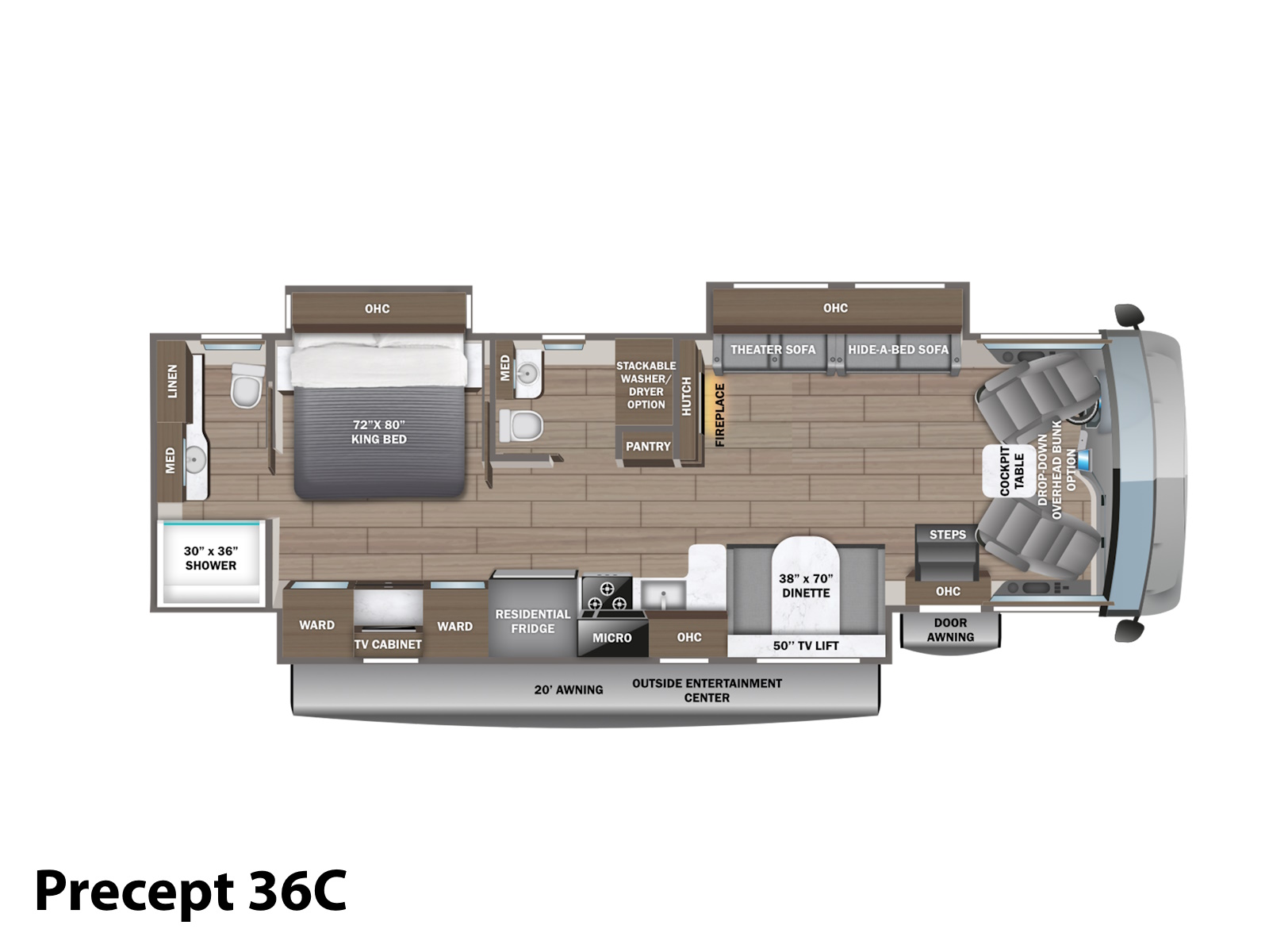 The Precept doesn’t just drive great—it looks great too! The one-piece seamless front cap features sleek accent lighting and bold LED headlights for increased visibility and a polished look. Add in the largest windshield in the industry—measuring an impressive 120 inches—and you’ll take in every view. Oversized wiper blades and a power shade help keep your line of sight clear, rain or shine.