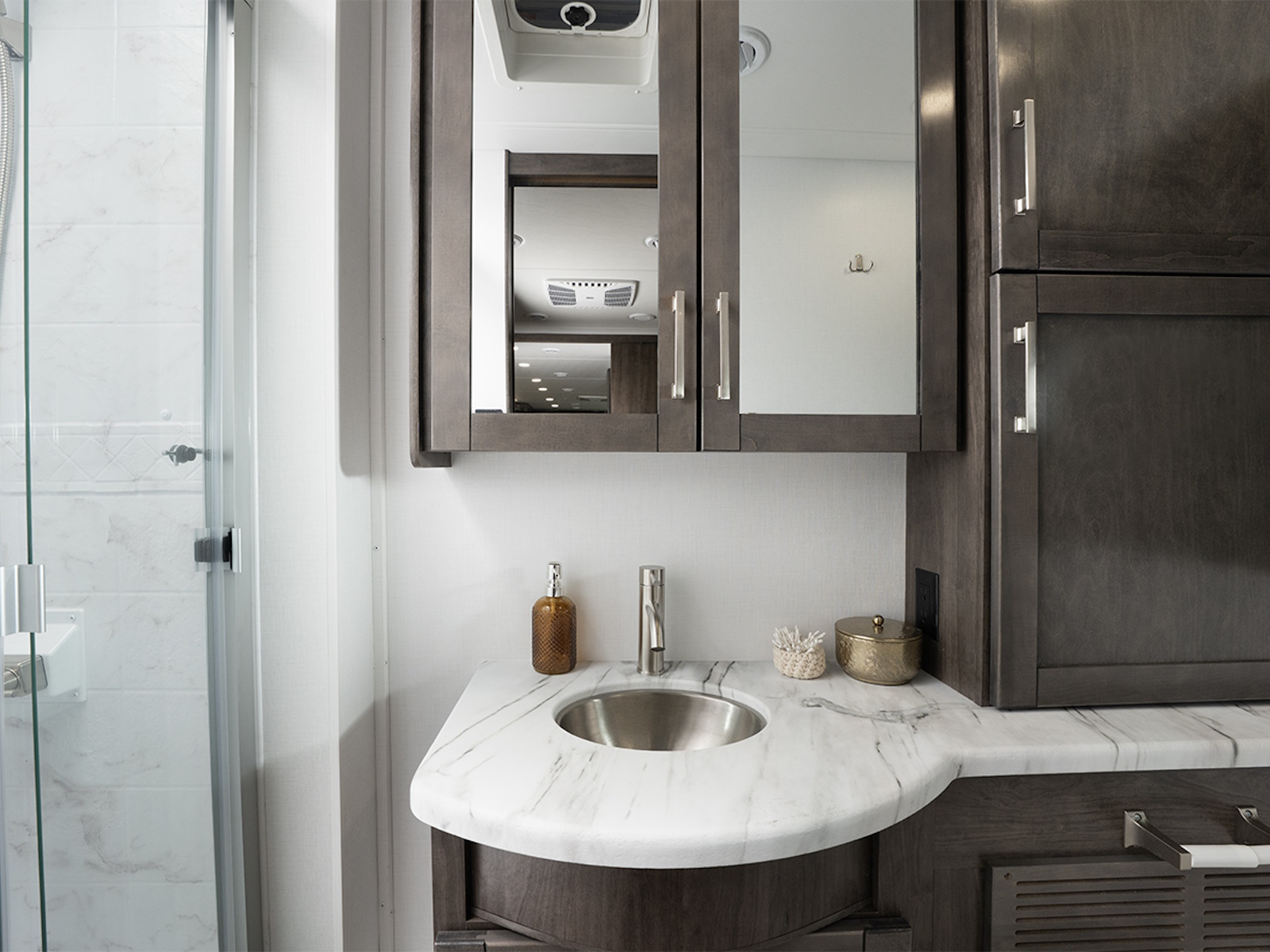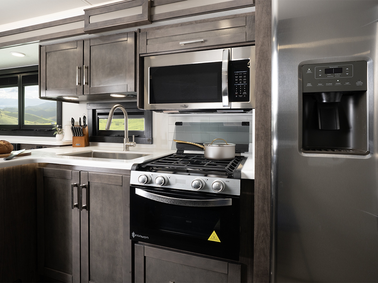 In the kitchen, you’ll love the solid-surface countertops which are not only durable but easy to clean and maintain. A large stainless steel sink makes dish duty simple, and sink covers give you more space when you need it. The 21-cubic-foot residential fridge makes it easy to bring along all your favorite snacks and ingredients. With large hardwood cabinet doors and drawers throughout, there’s space for everything you need—with a clean, home-like look.