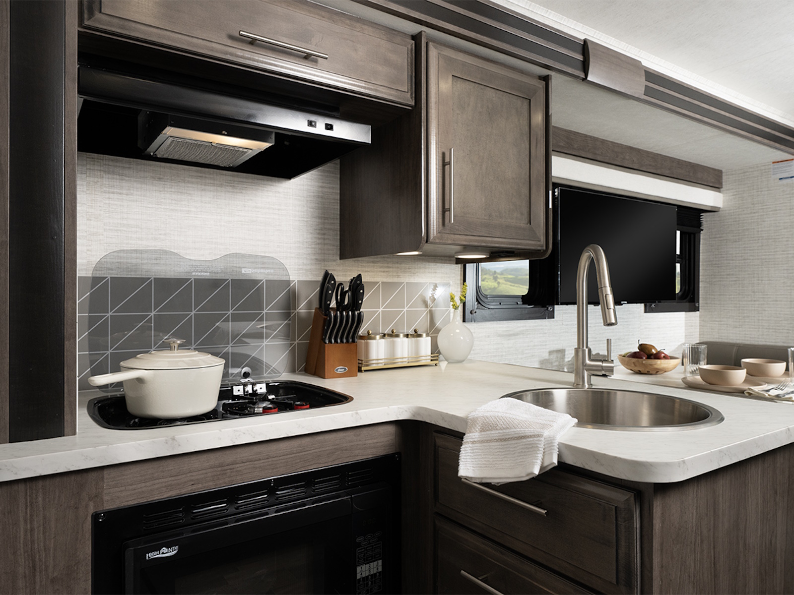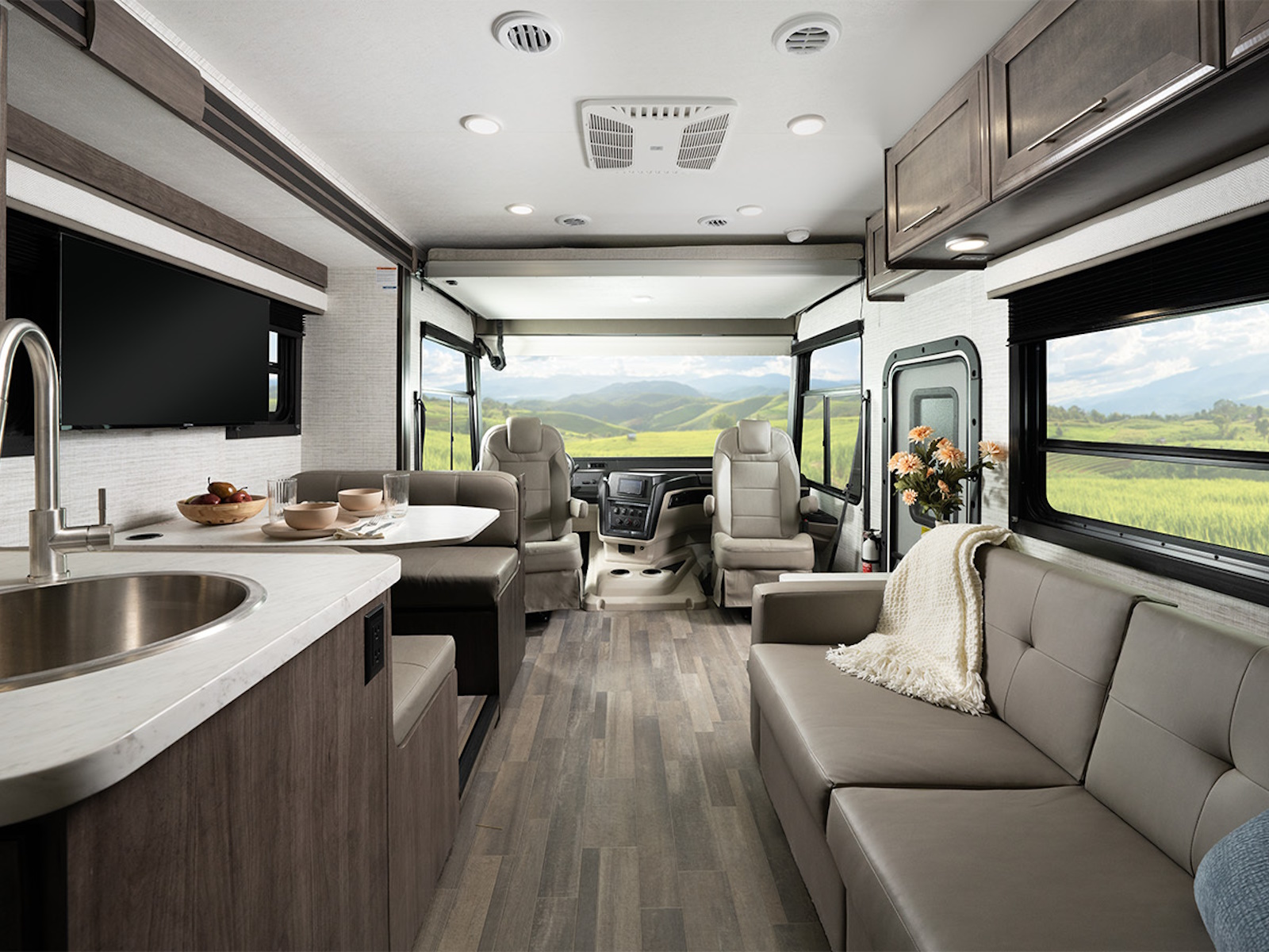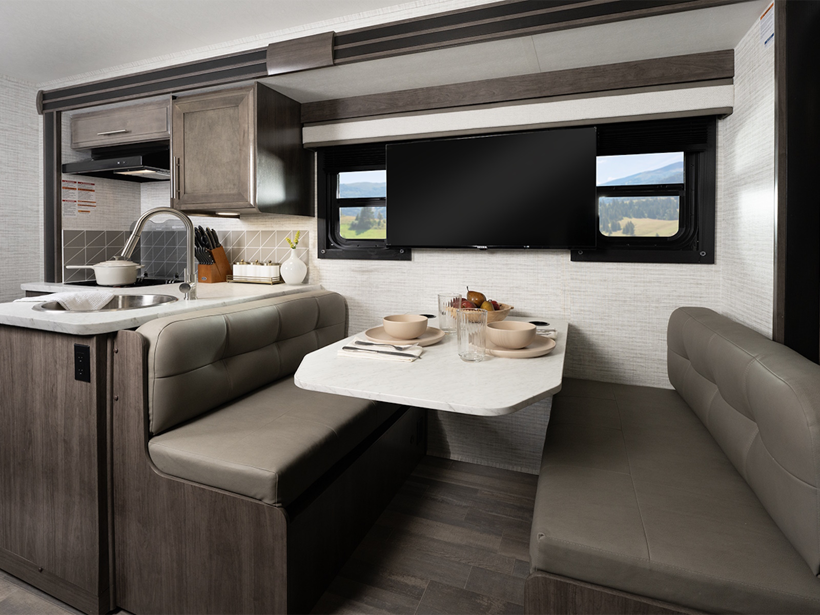 Inside, you’ll feel right at home. The popular 27ASE floorplan seatbelts eight and sleeps up to five, making it perfect for family trips or a comfy couple’s getaway in a coach under 30 feet. Kick back on the sofa and catch your favorite show on the 39-inch TV or enjoy a cozy evening inside after a day of exploring.
