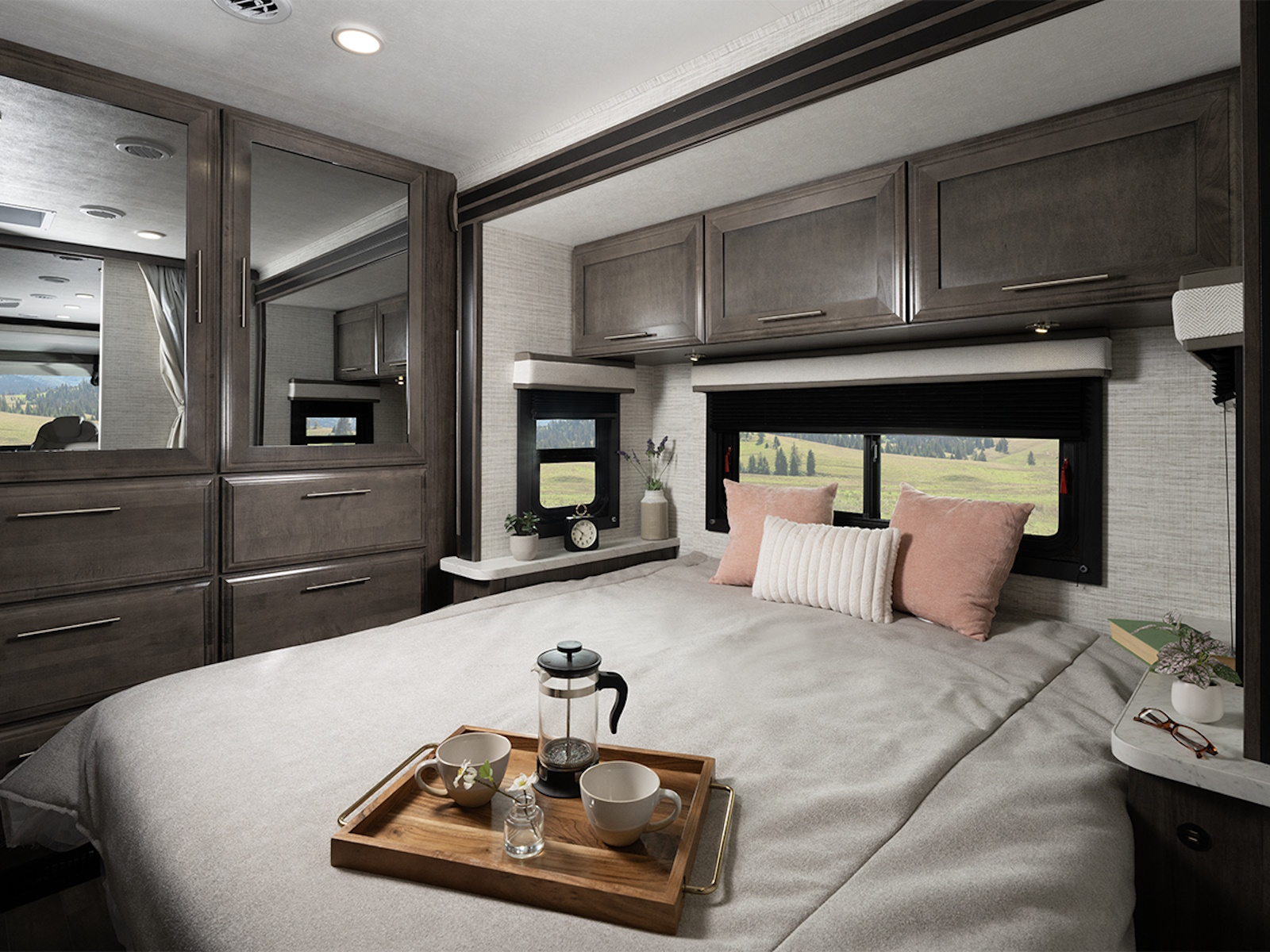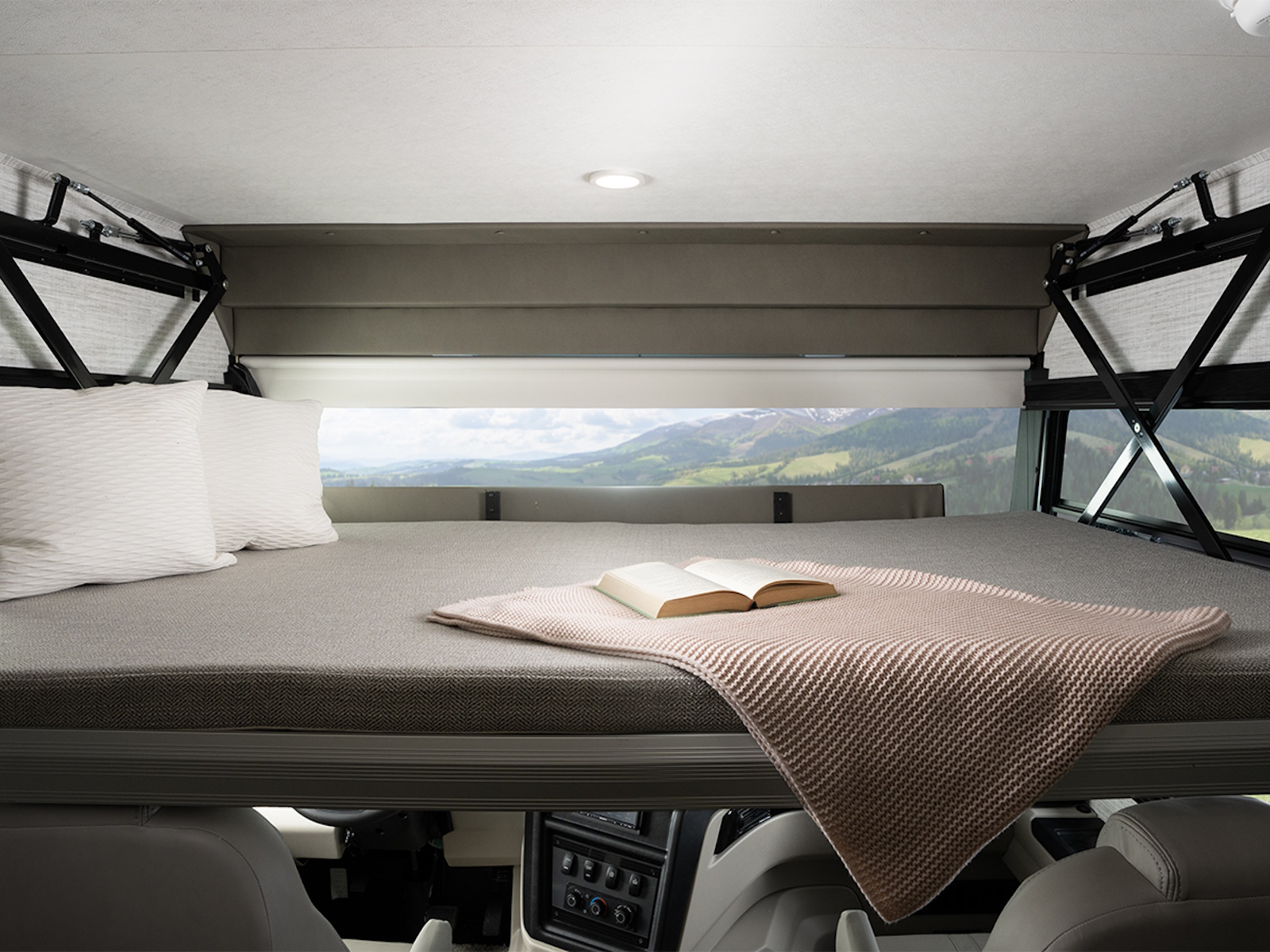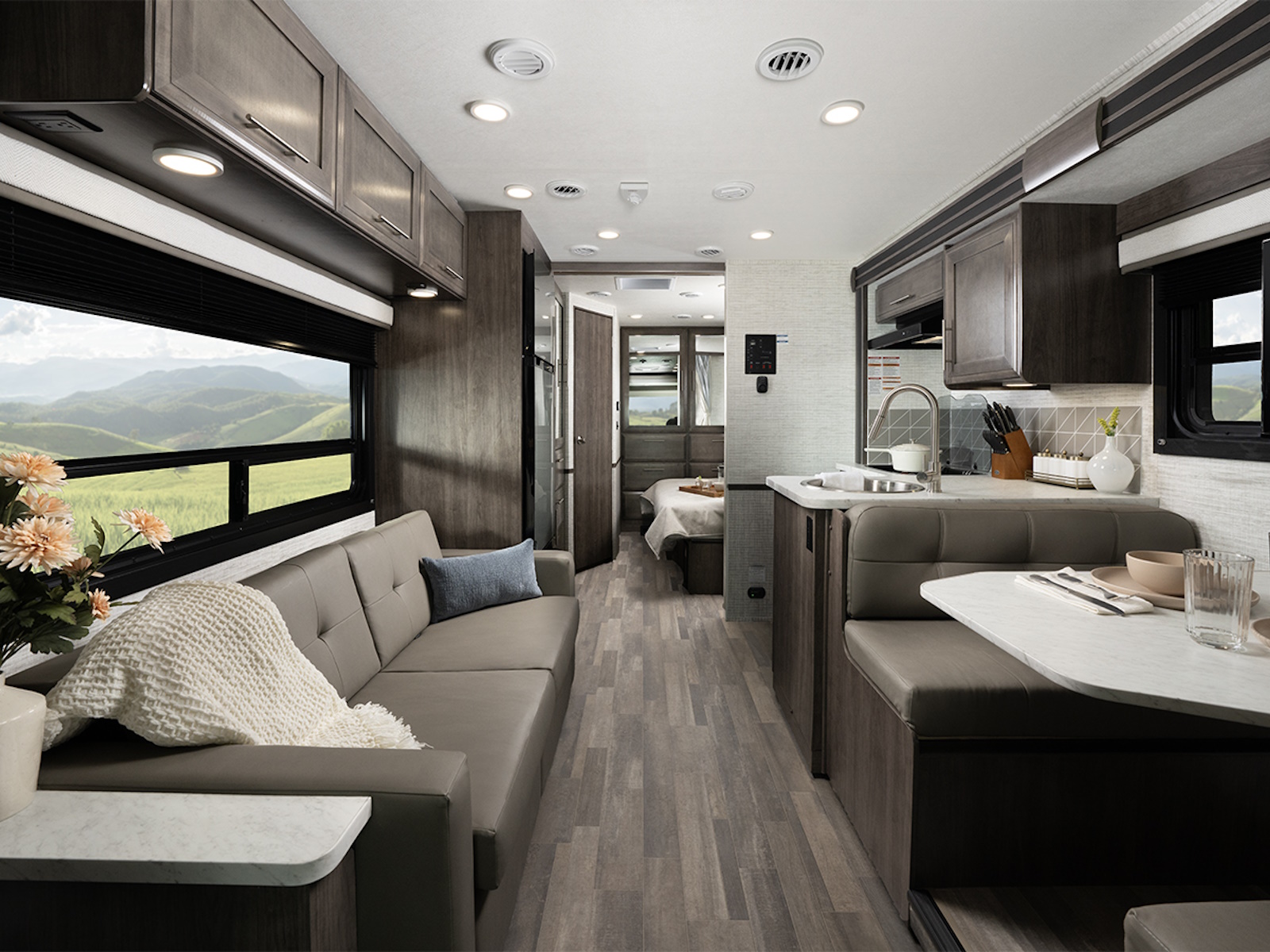 Built on the reliable Ford® F53 chassis, the Alante SE features our JRide® ride and handling package, so your travels are smooth and quiet from the very first mile. The seamless, crowned fiberglass roof adds long-lasting durability, and the lockable pass-through storage compartments make packing up your gear quick and easy. Up front, you’ll find the industry’s largest windshield—a huge 120-inch window that delivers unbeatable views and helps improve safety by cutting down on blind spots. And when the weather turns, oversized 32-inch wiper blades keep your view crystal clear.
