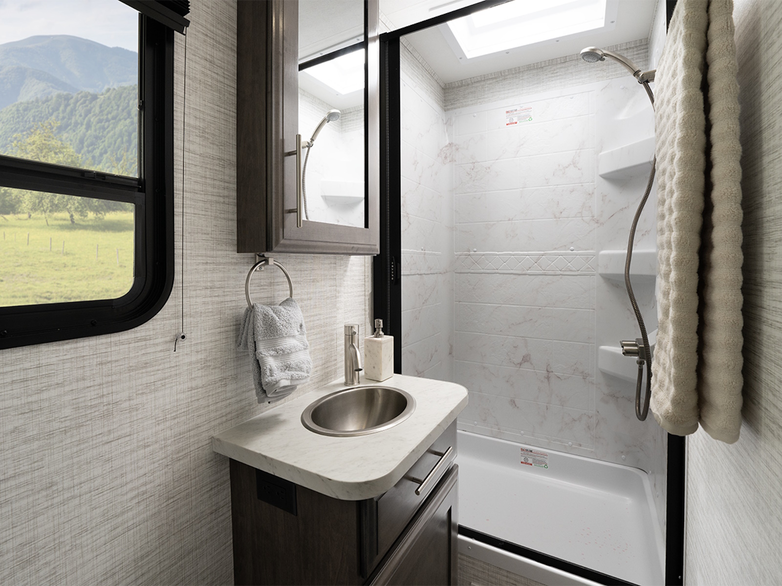 The kitchen makes meal prep easy and fun with a convection microwave, 2-burner cooktop and 10 cu. ft. 12V fridge to hold all your snacks and groceries. When it’s time to eat, the Jayco-exclusive legless dinette is sturdy enough to withstand the whole crew—and when the day winds down, it quickly turns into an extra sleeping space.