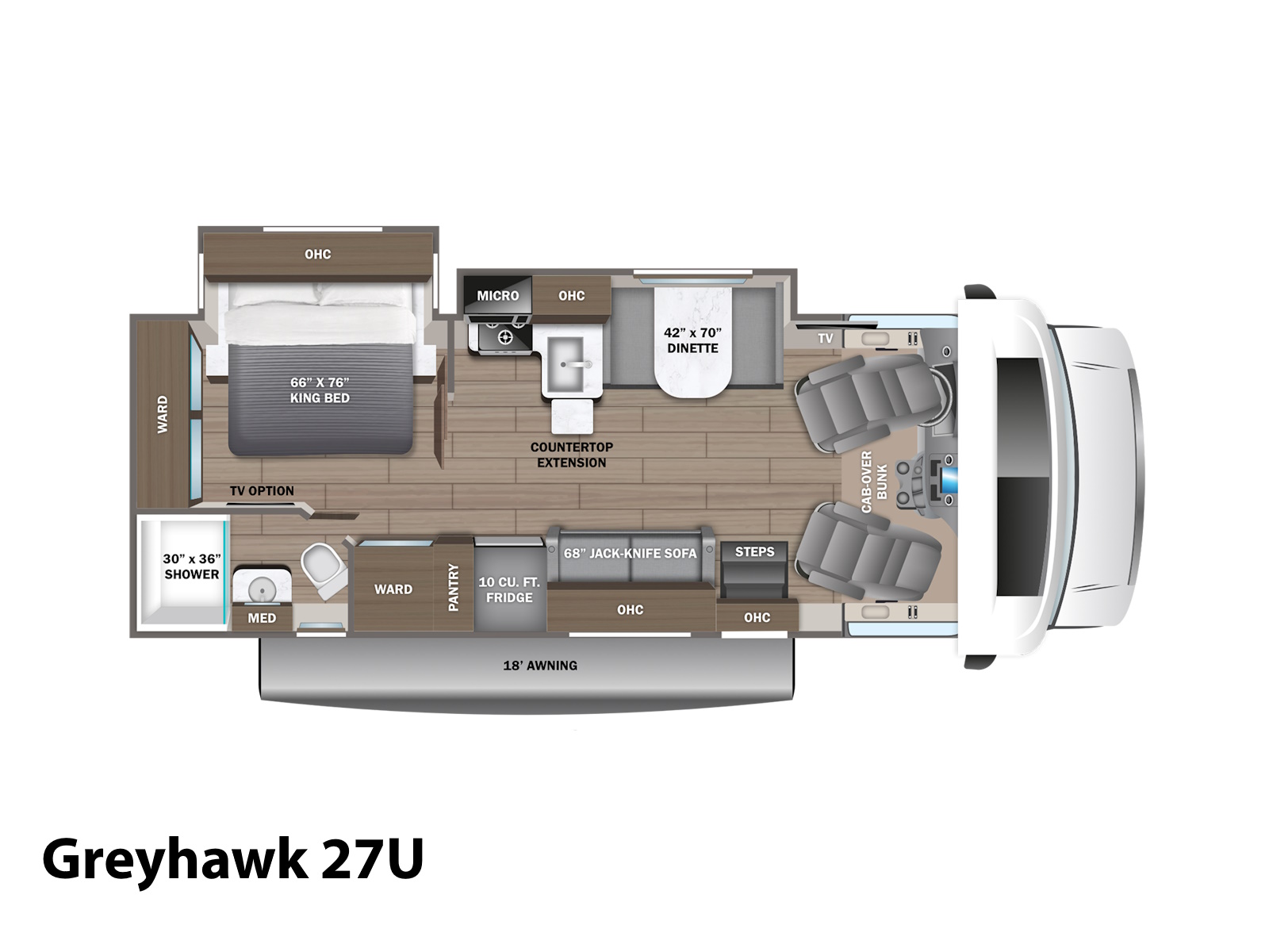 Inside the Greyhawk, comfort comes standard. Unwind on the walk-around queen-size (king-size on the 27U) bed while your devices stay charged using the built-in USB ports or wireless charging pads in the nightstands. The Jayco-exclusive legless dinette table easily converts from dining to sleeping position and is built to stay sturdy and supportive, even during mealtime or family game night. Every seating area includes safety belts, and the dinette is equipped with car seat tethers to keep little ones secure on the road. Outside, large rotocast storage compartments offer plenty of space and are easy to clean with a quick spray from the hose. Whether you're headed to the mountains, beach or somewhere in between, the Jayco Greyhawk blends luxury and practicality to help you make the most of every trip.