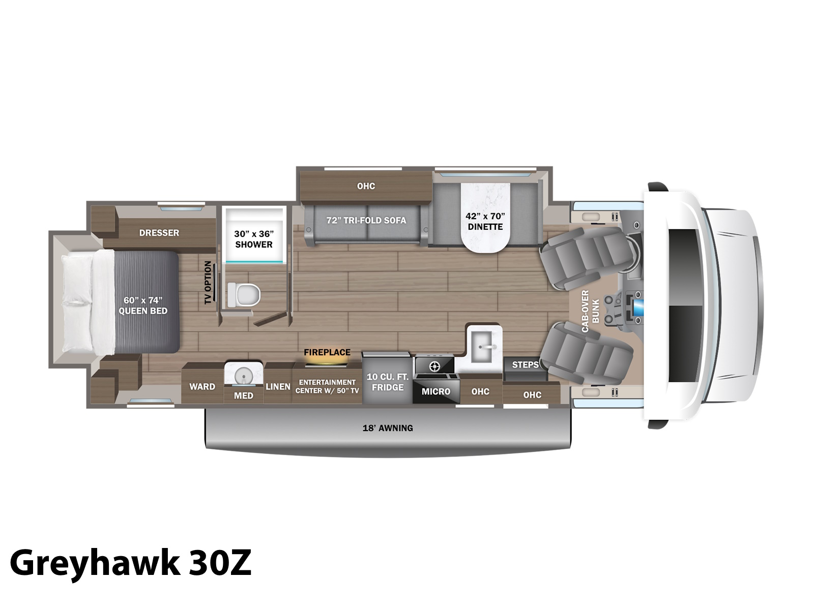 The 2026 Greyhawk is Jayco's amenity-rich, top-of-the-line gas Class C motorhome. With features like a seamless, one-piece front cap, Jayco sets a high standard in the Class C category, giving owners greater durability and protection against moisture and debris. That means more time enjoying your RV and less time in the service bay. Built on the Ford® E-450 chassis, the Greyhawk looks as sharp as it handles. Its JRide® Plus ride and handling package includes a computer-balanced driveshaft, Koni® FSD shocks, heavy-duty rear stabilizer bar, front stabilizer bar, Hellwig® helper springs and rubber isolation mounts. Together, these components create a smooth, stable ride whether you’re on the highway or heading to a scenic campsite. Off-grid adventures are made easy with a 4,000W generator with auto-gen start and a 1,000W inverter. The generator draws from the fuel tank and automatically turns on when power is needed, giving you reliable energy without the hassle. To keep things cool and comfortable, the 15,000 BTU A/C with a heat pump comes standard, or you can choose optional dual A/Cs with a power management system that adjusts energy use to prevent overloads and keep things running smoothly.