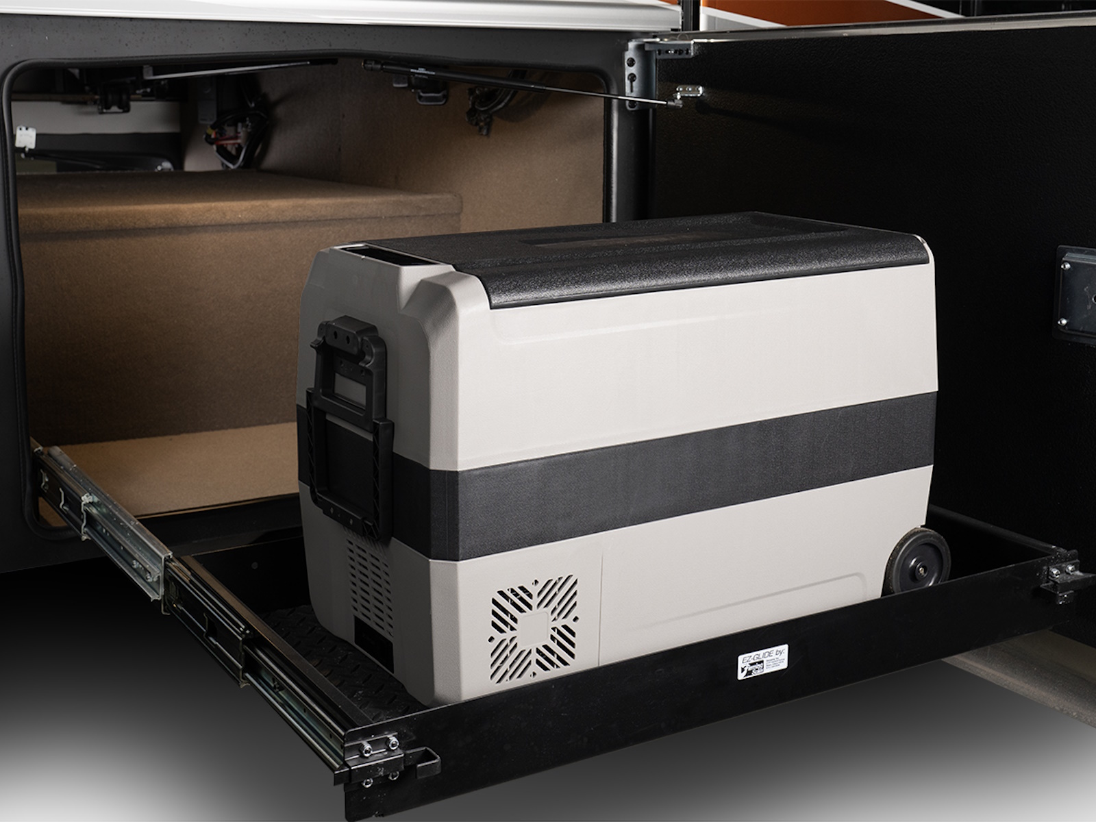 - Carpeted, full pass-through storage compartments with Keyed Alike lockable slam-latch doors