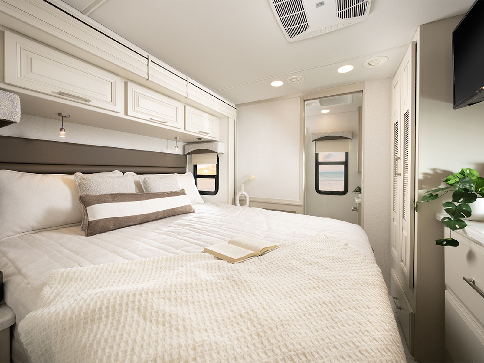 Luxury in the Seneca Prestige goes far beyond the drive. Once you’ve set up camp, you’ll be surrounded by upscale touches and thoughtful conveniences that make life on the road easy and enjoyable. Inside, you’ll find solid hardwood cabinetry and stiles creating a residential and polished look throughout. The Aqua-Hot® heating system with electric floor heat keeps you cozy no matter the season, and the Firefly total coach control system with a 7-inch touchscreen and app integration makes it simple to manage your lights, climate, and more—from anywhere, right from your phone.