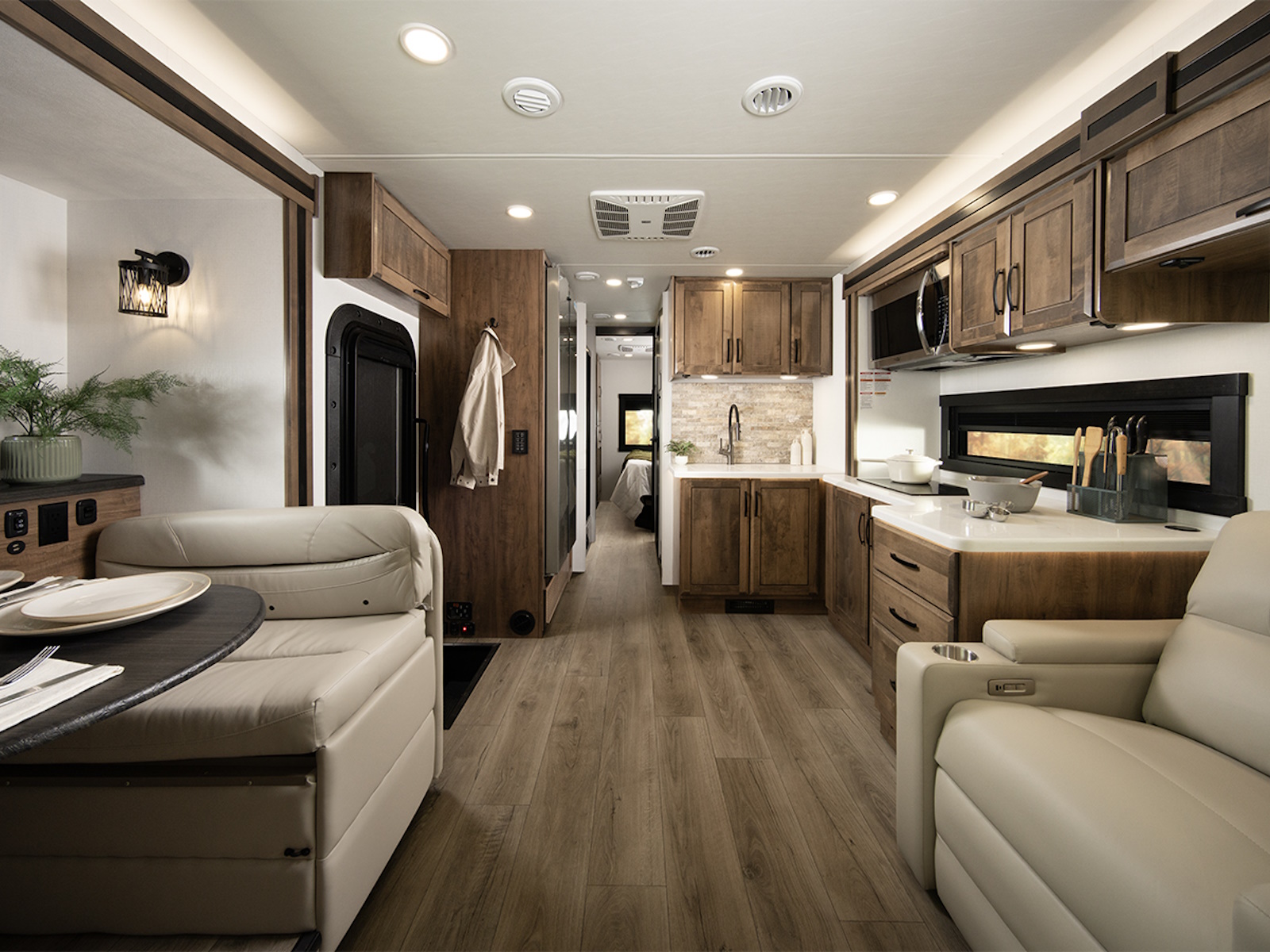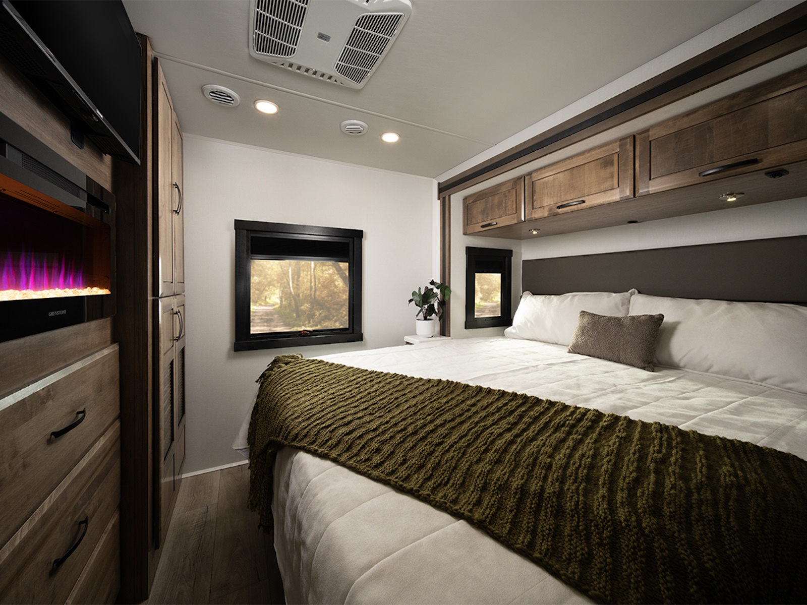 Inside, you’ll find a comfortable and consistent climate thanks to a 15,000 BTU ducted A/C with a heat pump and a 30,000 BTU auto-ignition furnace, perfect for extended-season adventures. The 10-gallon gas and electric DSI auto-ignition water heater replenishes hot water quickly—up to three times per hour—so long showers are never out of reach. For power on the road, the 6,000W generator with auto-gen start and 2,000W inverter provide everything you need to stay off-grid longer. A 200W solar panel with a dual controller and second house battery keeps your battery topped off, even in storage. A modern Ford® SYNC® 4 infotainment center with Apple CarPlay® and Android Auto™, along with backup and side-view cameras and heated, remote-controlled chrome side mirrors, help you stay connected, aware and comfortable behind the wheel. The Firefly total coach control system, with a wall-mounted touchscreen and mobile app integration, puts control of your RV at your fingertips, making every journey smoother and more enjoyable from start to finish.