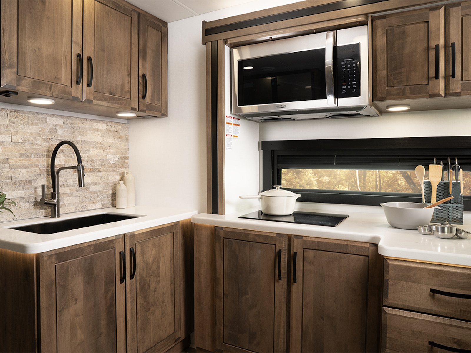 - Pop-up charging station in kitchen with 120V outlets and USB ports