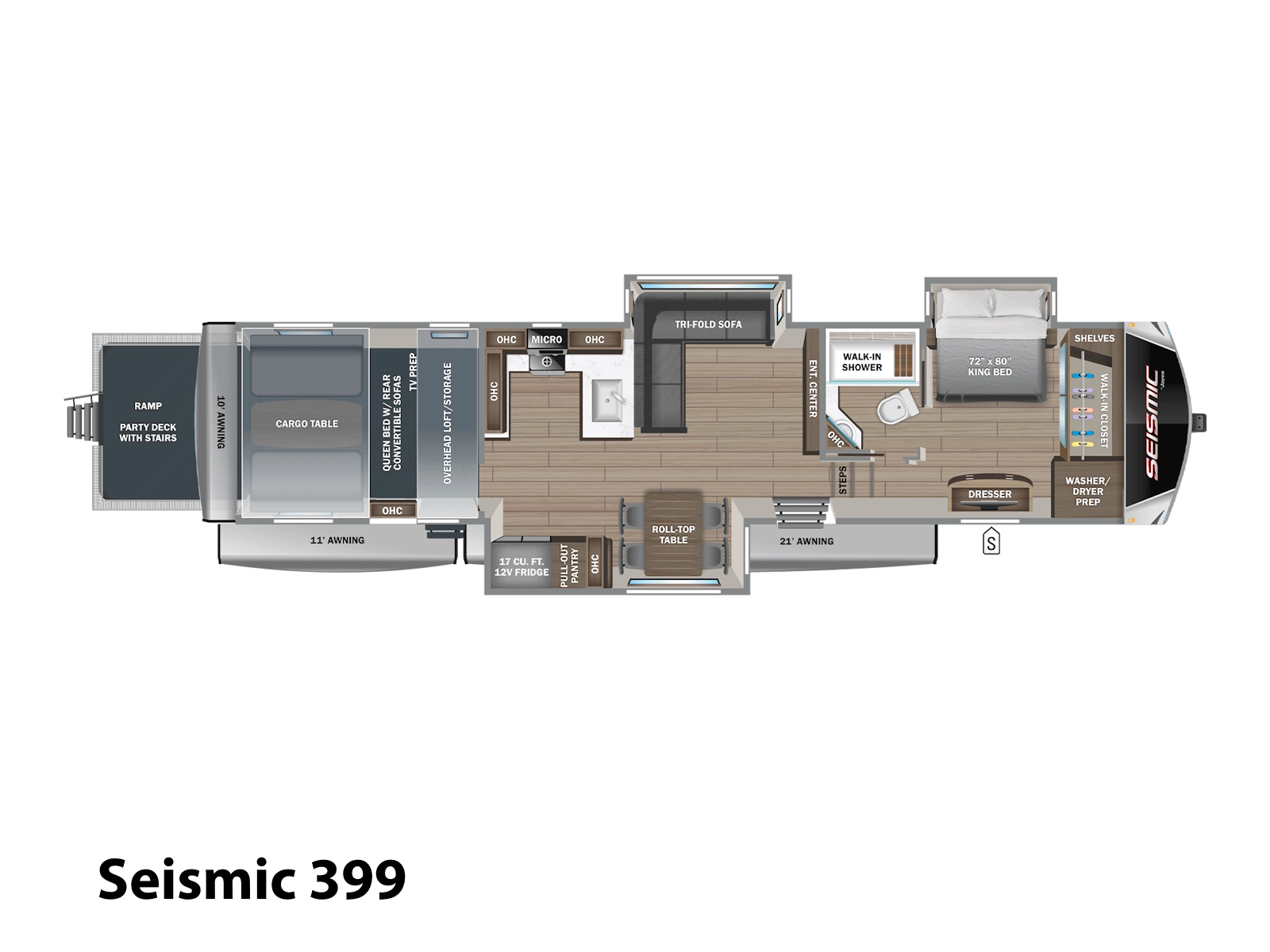 Built on a 102 in. wide structural steel I-beam frame, the Seismic features Stronghold VBL™ aluminum-framed walls, a Magnum Truss™ Roof System, and an Alpha roof membrane with a limited lifetime warranty. Reaching your destination is effortless with the 5-Star Handling Package, which includes Dexter® Axles with ABS and Tow Assist, 17.5 in., 16-ply "H" rated Cooper tires, and the MorRyde CRE 3000 Suspension System for a smooth, controlled ride.