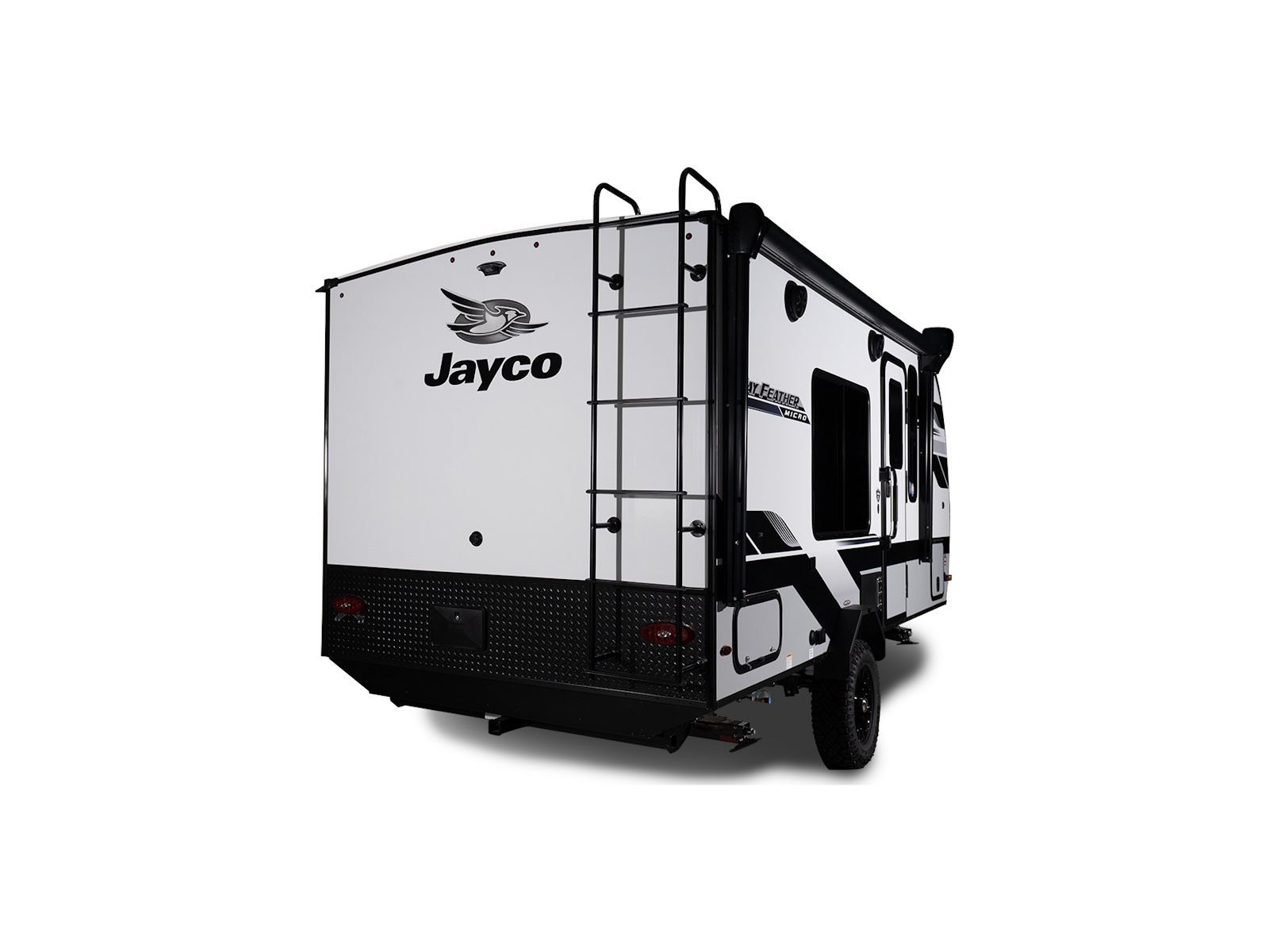 The exterior of the Jay Feather Air has its own list of standard features that make this entry-level Travel Trailer a must-have. We've stocked it with rear-mounted ladder for easy roof access, a maximized awning, an under-mount sewer hose carrier, a spare tire in case of emergencies and more.