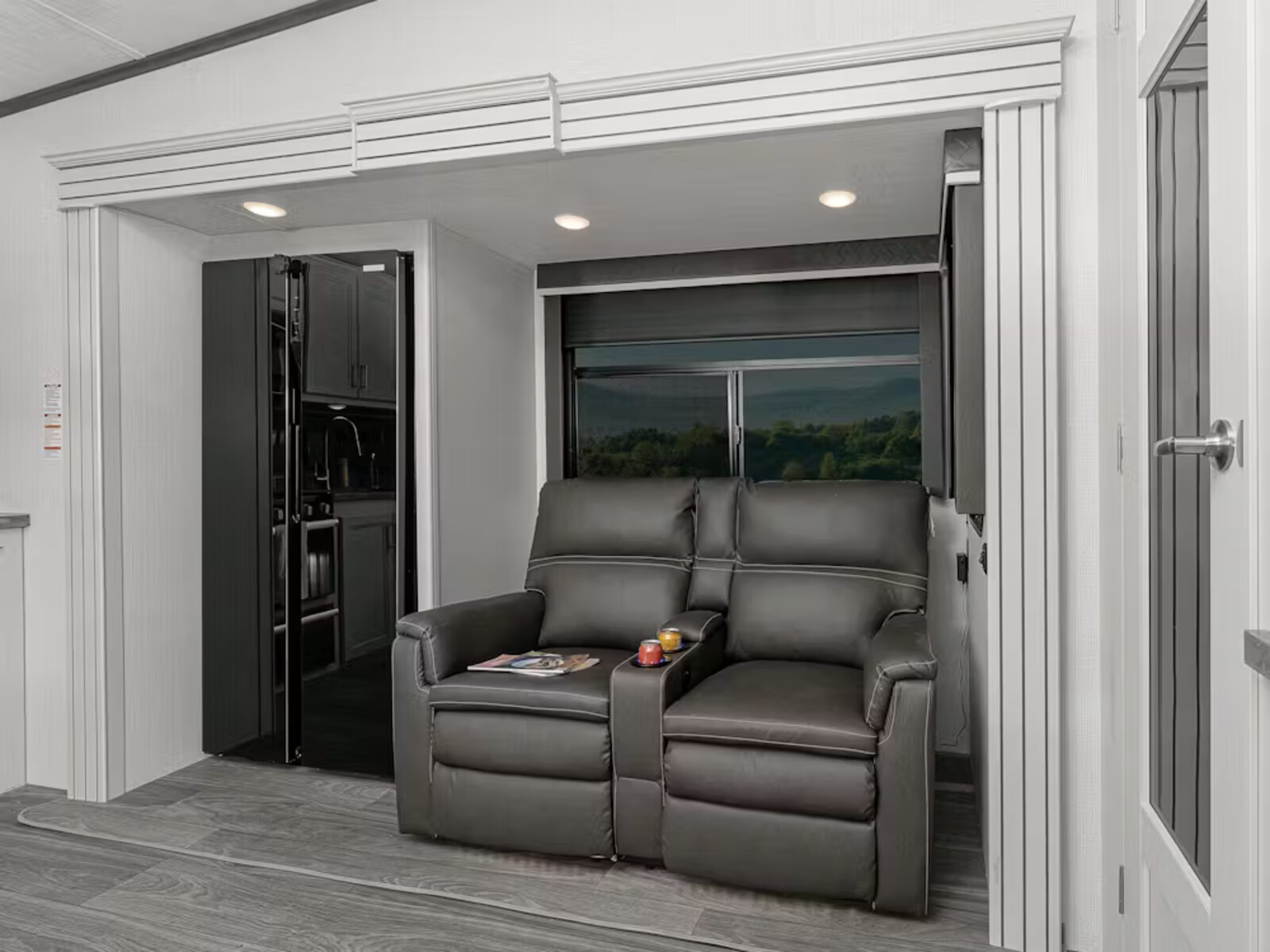 - Friction hinge entry door with integrated blackout window shade