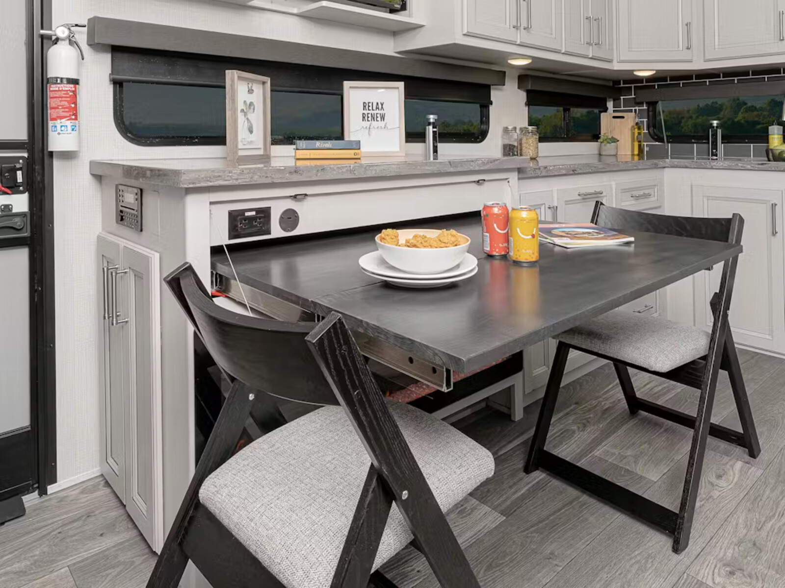- LED HDTV in living area 12V Bluetooth® player with HDMI ARC control, 12v USB charging centers, & exterior TV hookup